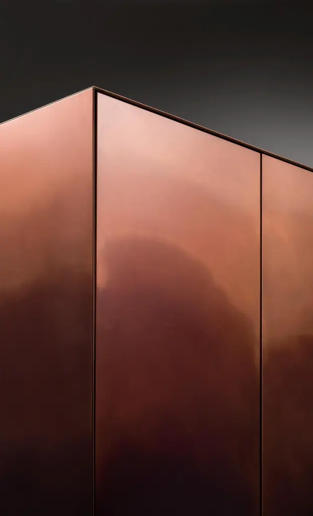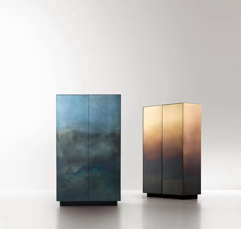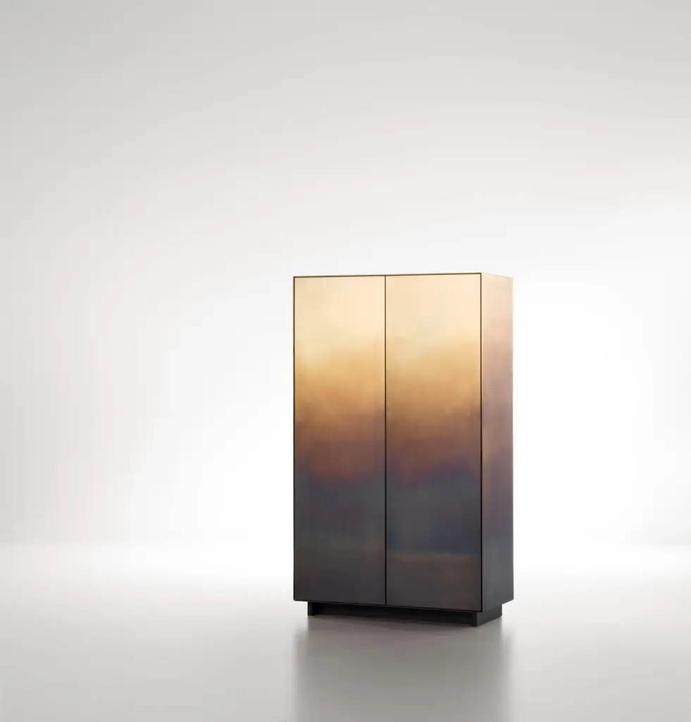 Marea Cabinet by De CastelliDimensions: W 90 x D 45 x H 155 cmMaterials: DeMarea Brass, Titanium Oak WoodStainless Steel and Copper versions also available. Please contact us for any request.The traces of time are drawn one on top of another, infused into the changing skin of the rigorous metal forms that define these cabinets and chests. Like the tide (marea in Italian) leaves its mark, wave after wave, even here the hand of the craftsman has left its sign, oxidation after oxidation, creating a painterly effect that resembles water’s erosion of the material. Somewhere between design object and work of art, each piece in the collection, composed of a chest of drawers, low credenza and cabinet, is unique thanks to an entirely hand-crafted finish that transforms the metal surface into a delicate watercolour.DE CASTELLI“HARD COUTURE”Faithful to its decision to reinstate the special role of metal in design and experimentation, De Castelli infuses artisan ideas and workmanship into industrial processes, leading to entirely original results. The encounter with design inspires an approach to materials founded upon respect for their potential, be it hidden or obvious, which emerges slowly in a collection of pieces that, despite being part of a series, remain unique.Unique not only for the hand that has created them, but also for the singular cultural path that focuses on the aesthetic (and not just practical) value of the primordial material with which De Castelli shapes living spaces.A BESPOKE APPROACHEach object, even in the repetition of form, is a creative act in and of itself, one that incorporates a heritage of constantly-evolving expertise and research. The equation that relegates ‘cold’ metals to the margins of furnishing projects is thus overturned, bringing iron, brass and copper, in their infinite variations and finishes, to the centre of an entirely renewed stage, allowing them to finally shine with their own light.SUSTAINABILITYDe Castelli has always been committed to making the entire production cycle increasingly sustainable, aware that metal, the material with which its business identifies itself, is precious and must be treated with care, without waste.PEOPLE FIRSTThe wide spaces of the De Castelli headquarters in Crocetta del Montello (TV) allow those who work to enjoy environments where order, cleanliness and safety are always maintained and guaranteed. An attitude of attention and respect for people that has led to the shared ethical code.