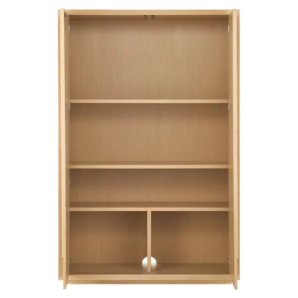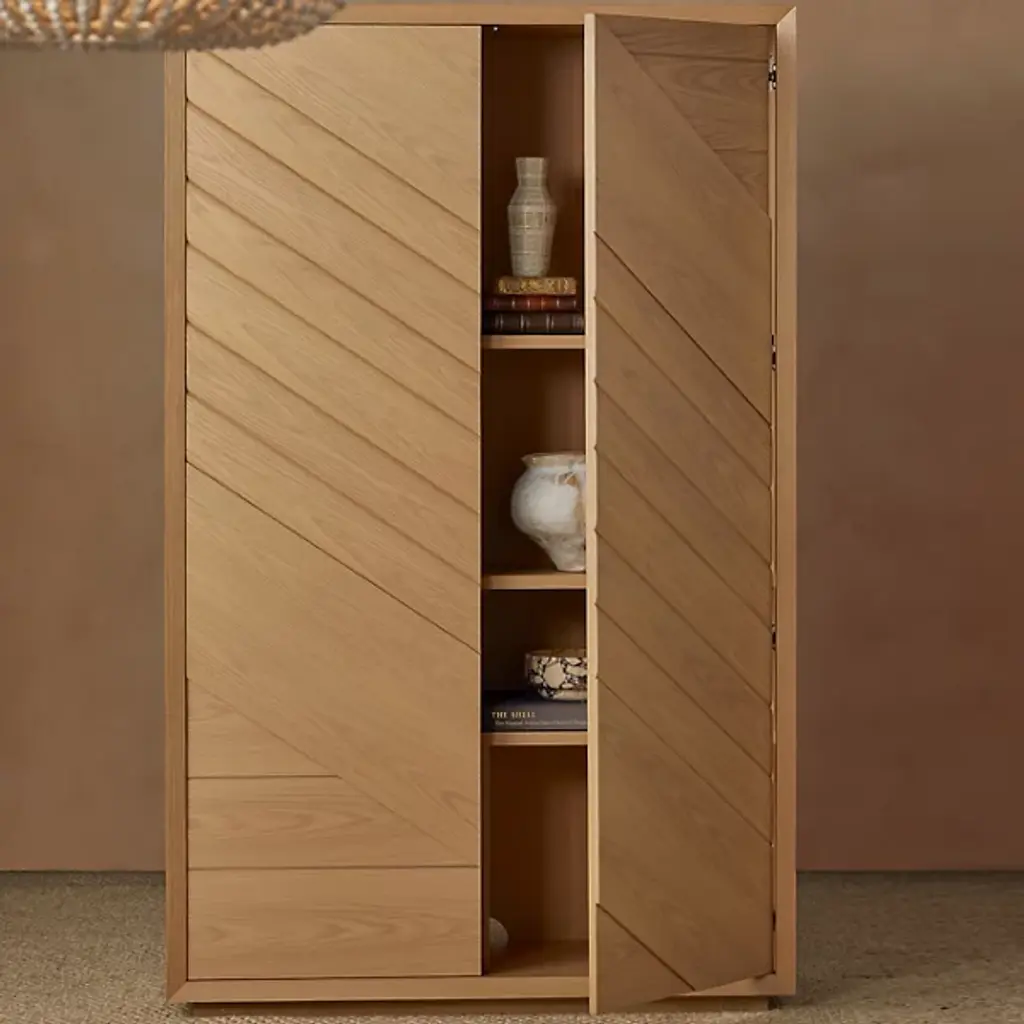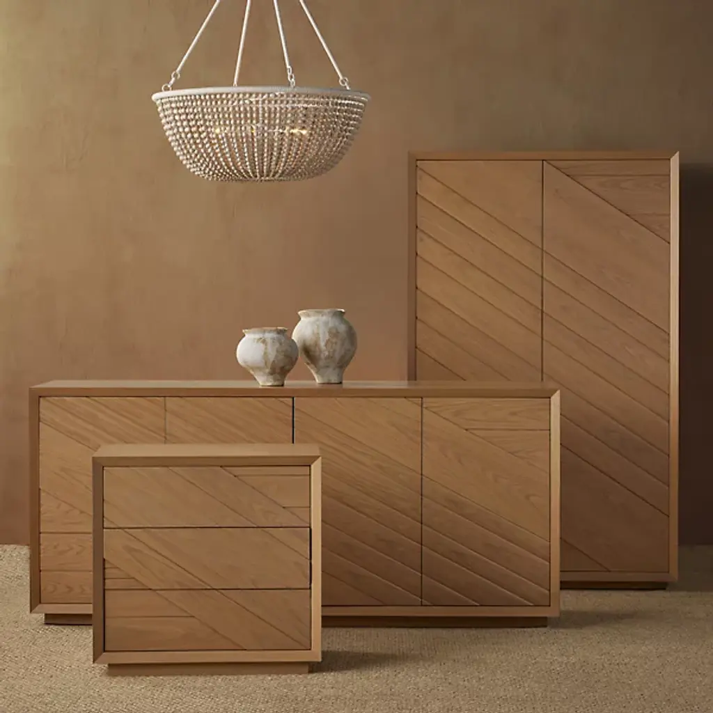 The Margot Cabinet from Currey & Company captures the relaxed sophistication of California’s coastal style with its light oak finish and subtle craftsmanship. Made from white oak solids and veneers, its chamfered edges and angled veneer pattern add depth and dimension to its clean-lined silhouette. Thoughtfully designed with push-to-open doors, soft-close hinges, and velvet-lined drawers, this cabinet balances beauty with function. Adjustable shelving and floor glides make it adaptable to any setting, offering refined storage for modern interiors.