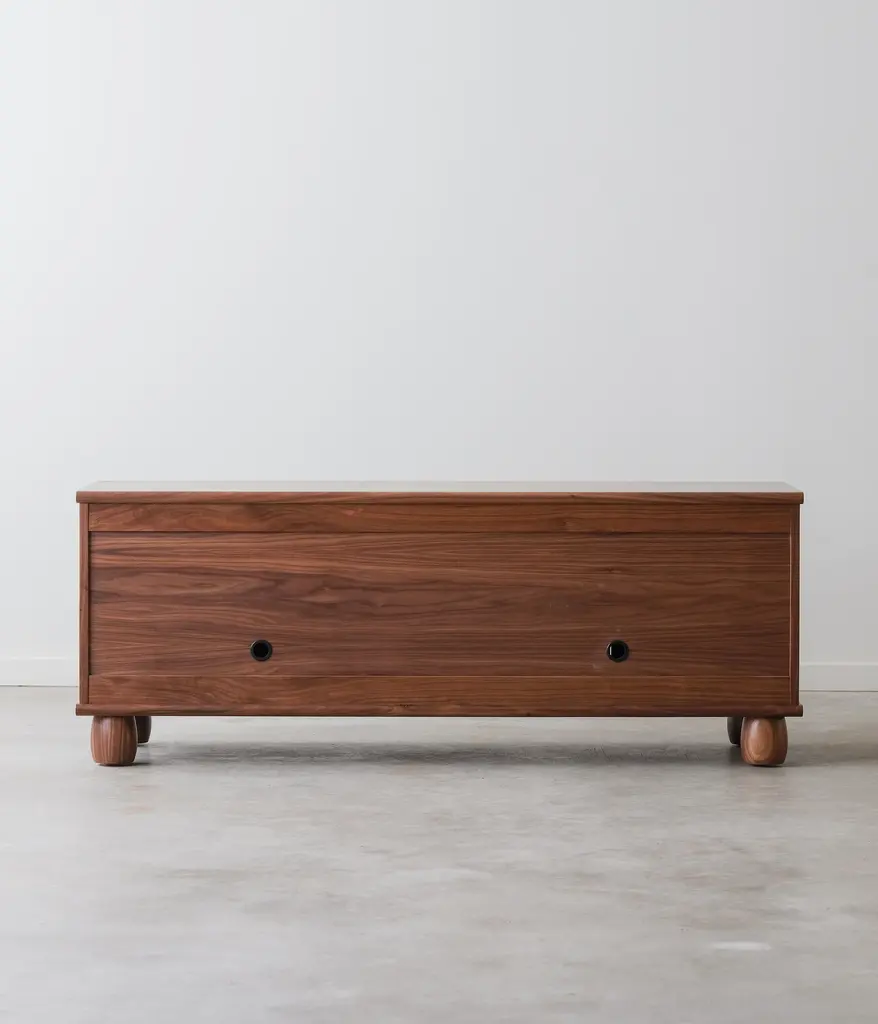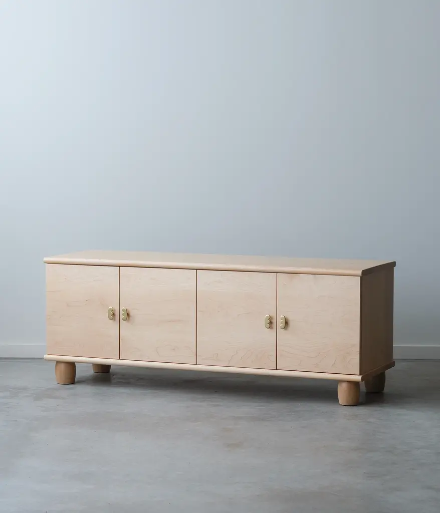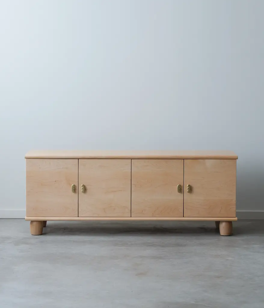 Continuous grain running across four doors, makes for a striking piece with a low profile. Our Marie pulls are cut from solid brass in Chicago with a satin finish. There are two adjustable shelves and two cord cutouts in the back of the cabinet for cord management. Doors have soft close hinges.