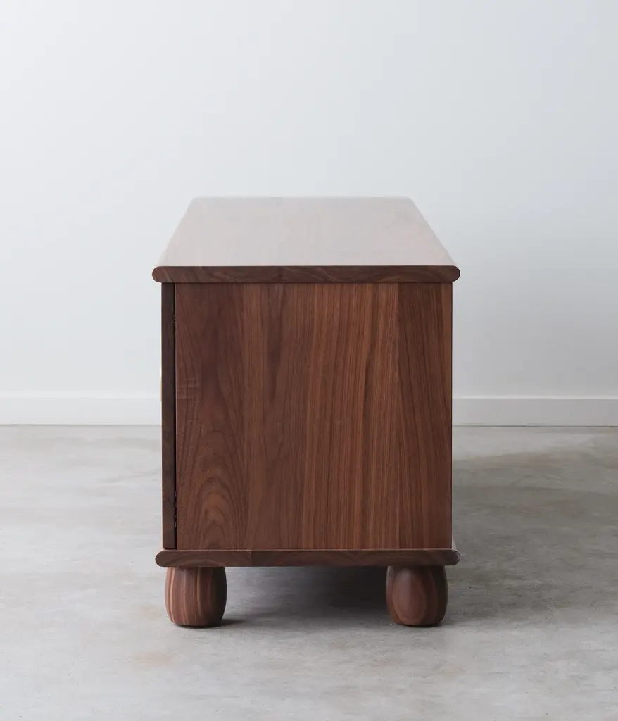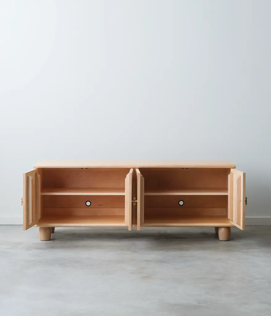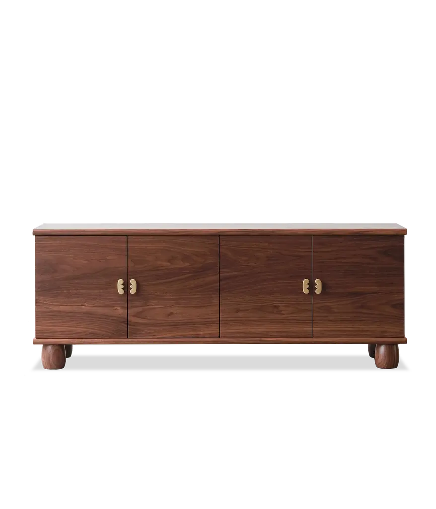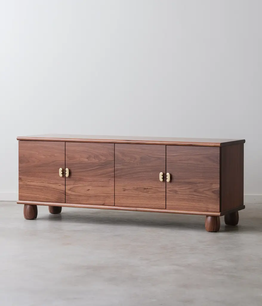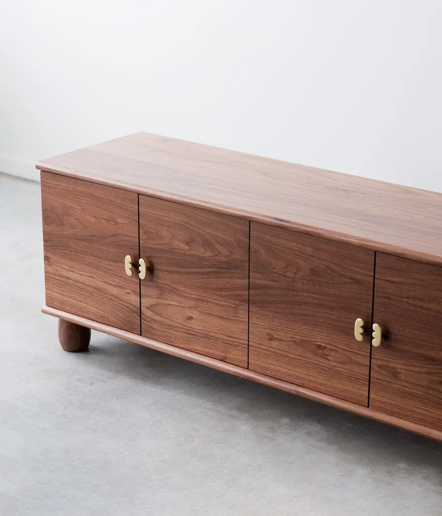 Continuous grain running across four doors, makes for a striking piece with a low profile. Our Marie pulls are cut from solid brass in Chicago with a satin finish. There are two adjustable shelves and two cord cutouts in the back of the cabinet for cord management. Doors have soft close hinges.