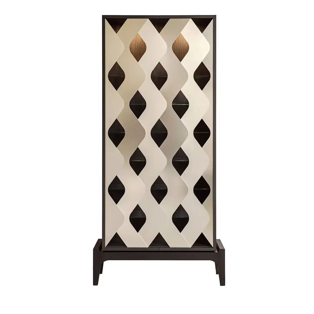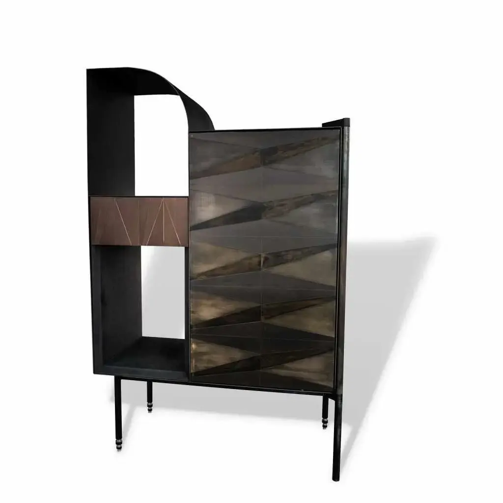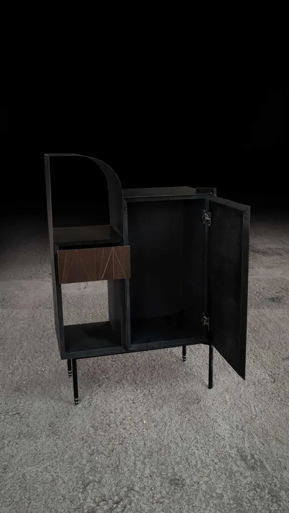 The collection by Alessandro Zambelli comprises a series of storage furniture that include a small cabinet, a dry bar, a console and a coffee table, where the metal inlays remind of those traditionally found in Art Deco wooden furniture, adding a new element of character and prestige. The linear essentiality of the forms, which is reflected in each element of the collection, is enriched by the presence of precious superficial decors that are juxtaposed through inlays: small metal oxidised plates animate the surface of each storage element with their refined alternation of delicate geometrical motifs. The oxidation process brings a unique mutation of the surface itself, enriched by a whole variety of shades and gradation. Developed and Produced during the Matter of Stuff Designer Residency program in Montalcino