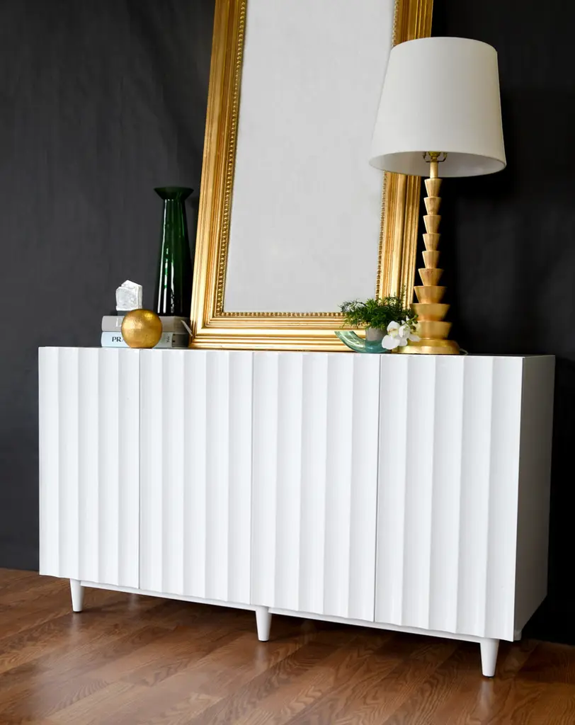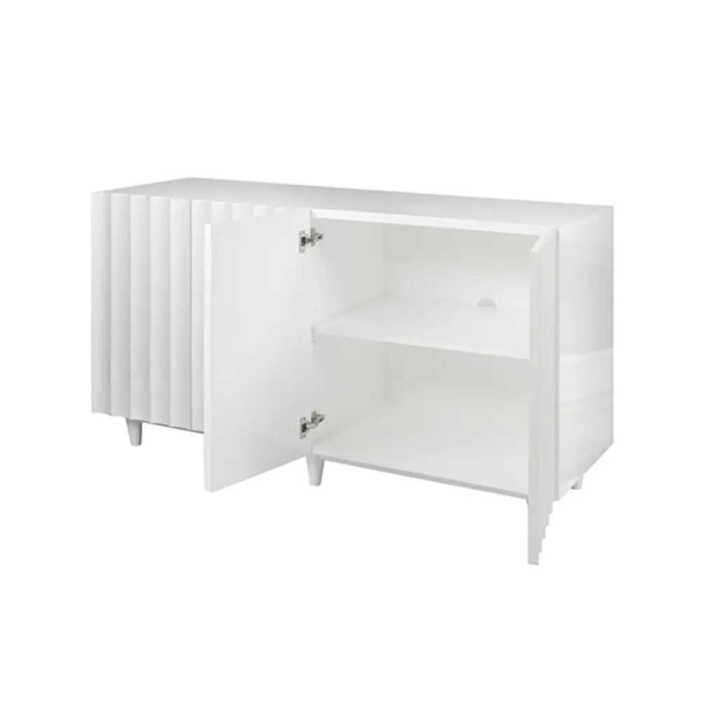 New Special Order Item. Express your inner minimalist with our sublime, statement-making Odette cabinet. A unique scalloped design conceals four doors which open to reveal ample storage. Both cabinets include adjustable/removable shelf and cut-out for media wire management. Finished in our signature glossy white lacquer with elegant tapered legs. Width:60.00" Height:34.00" Depth:20.00"