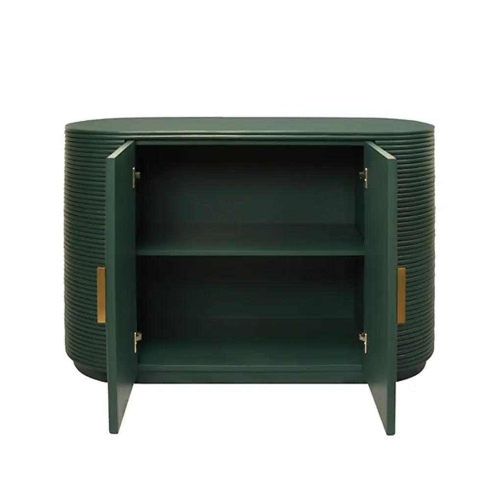 New item. Not vintage. Upgrade your storage game with the Roger Painted Green Cabinet. The unique two-door design is made with rattan reeding and curved ends, adding a touch of whimsy to any room. Plus, the painted hunter green color brings a pop of personality to your space. (Green never looked so good!) 33.5H X 48.75W X 19D ONE ADJUSTABLE AND REMOVABLE SHELF Width:48.75" Height:33.50" Depth:19.00"