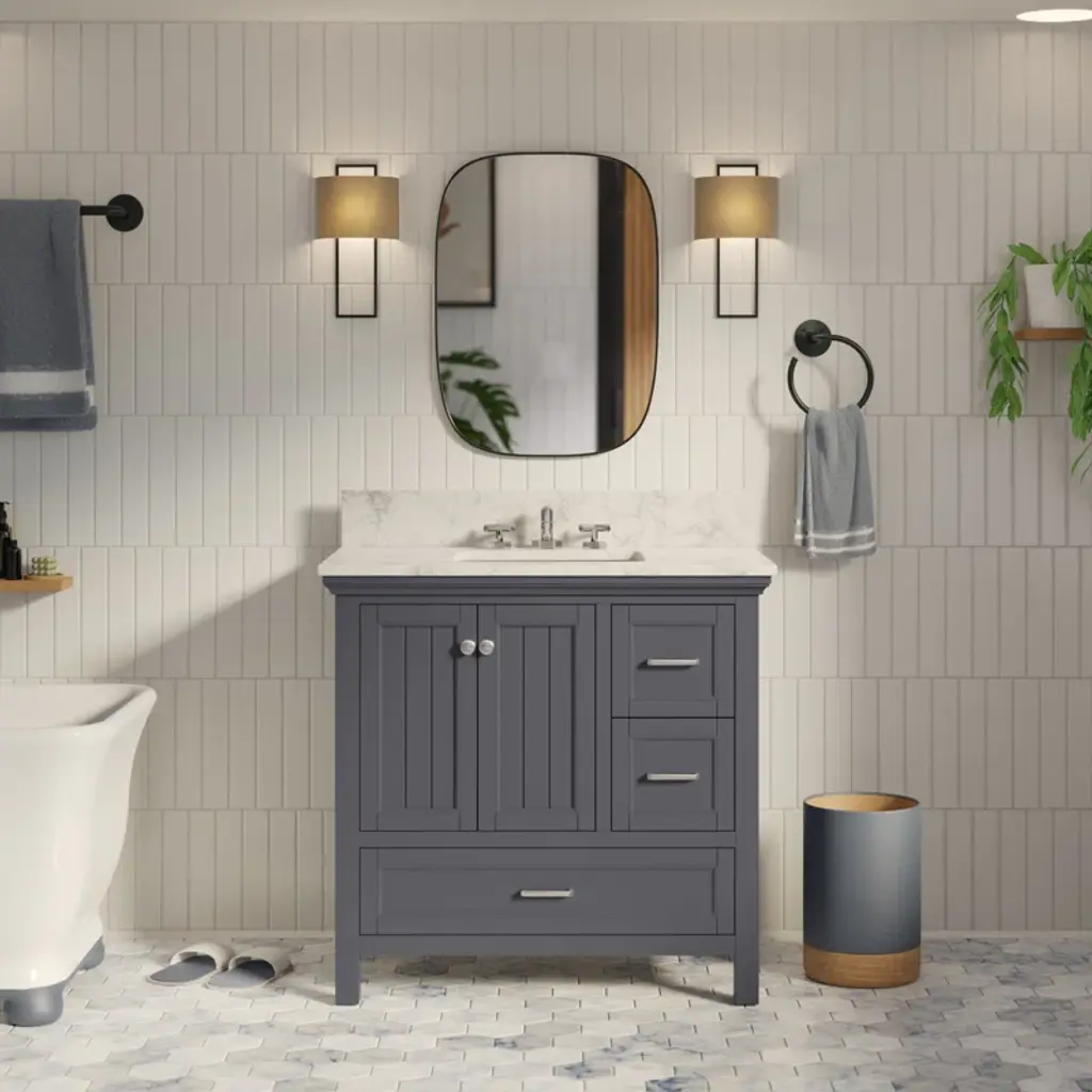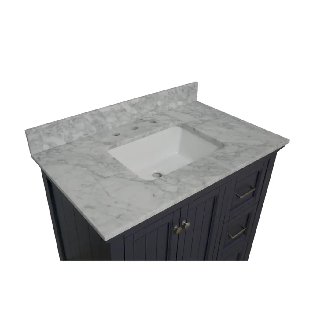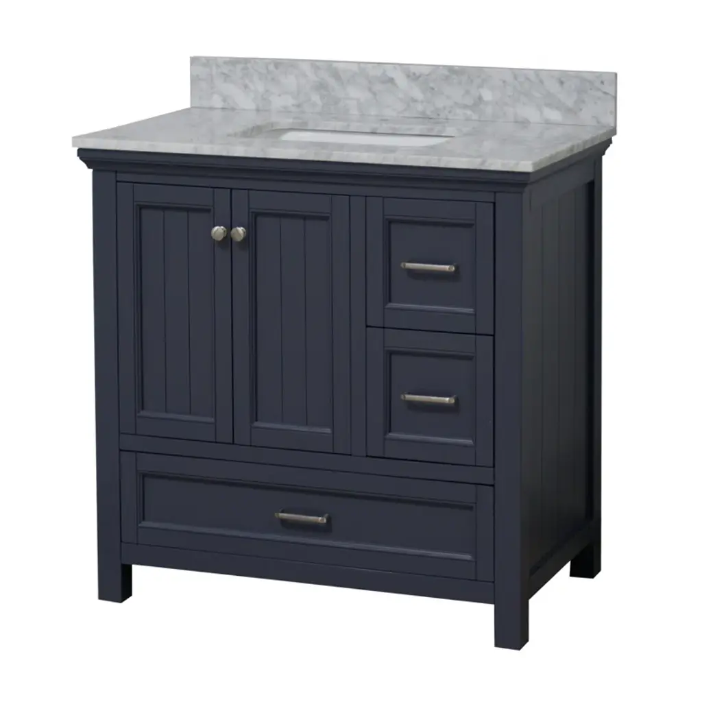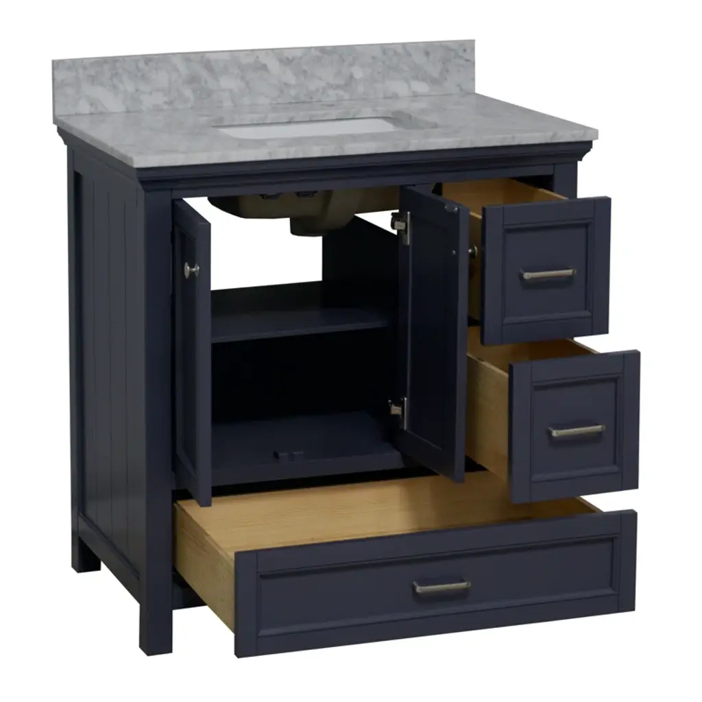 Elevate your morning routine with this handcrafted bathroom vanity. Made with genuine Carrara marble, the countertop exudes a luxurious and timeless appeal. With doors and drawers for storage, as well as a soft-close feature, functionality meets style. Sink and cabinet hardware included.