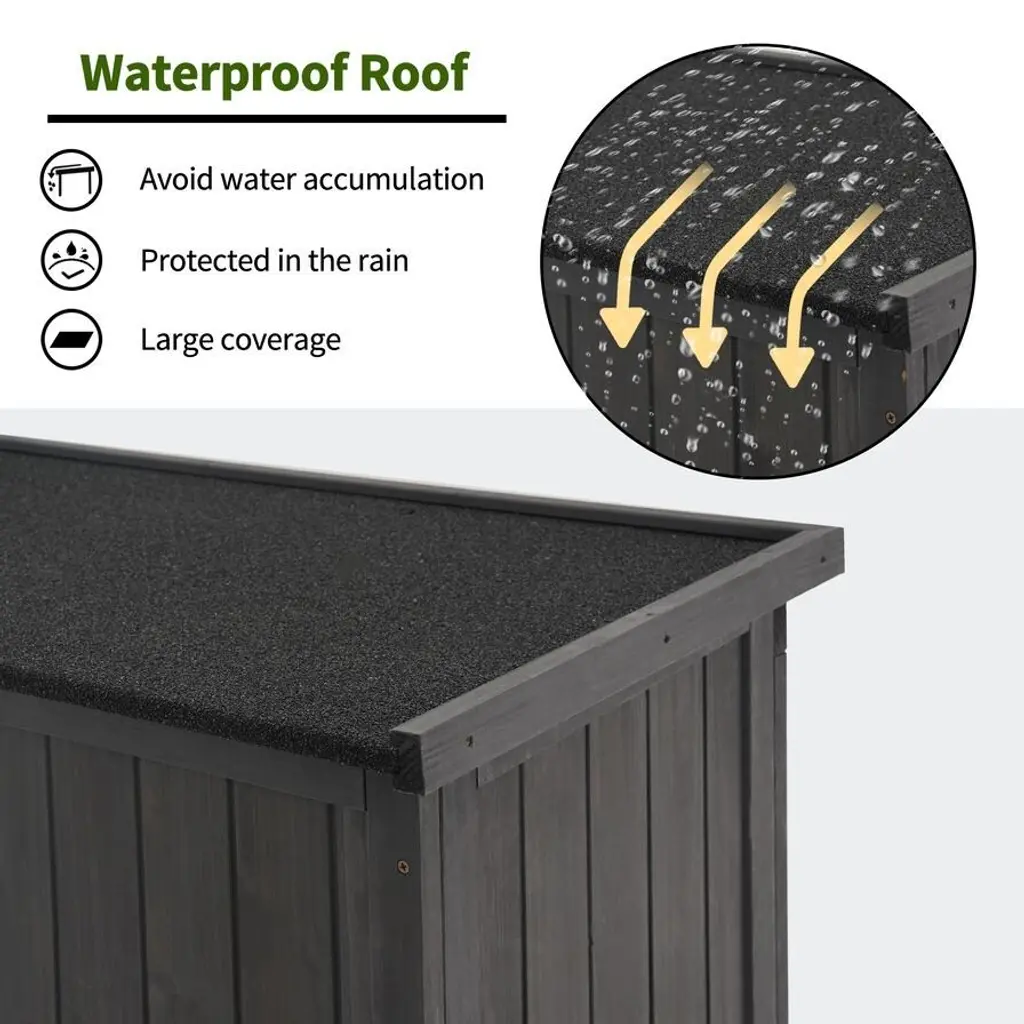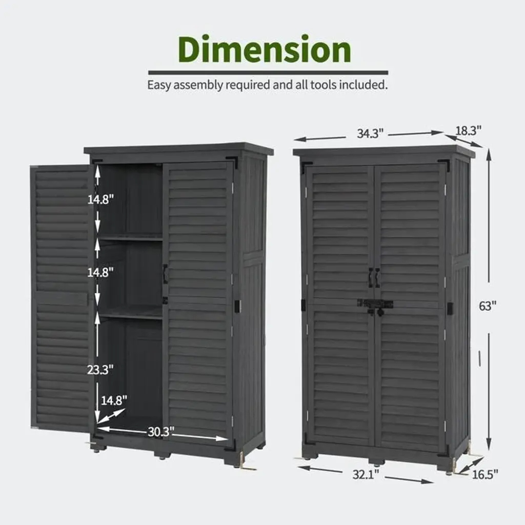 Get your garden tools organized and tidy with ease using the Mcombo Garden Storage Tool Shed. Made of high-quality fir wood, this outdoor wood tool cabinet stores your watering can, hoses, spades, pots, and more. The waterproof sloping asphalt roof prevents water accumulation, and the exterior polished to express a rustic style. The removable shelves offer four different storage spaces, and the shed comes with four metal brackets and six adjustable feet for stability. Measuring 34.3" L x 18.3" W x 63" H, it's the perfect size for any outdoor space.Features: