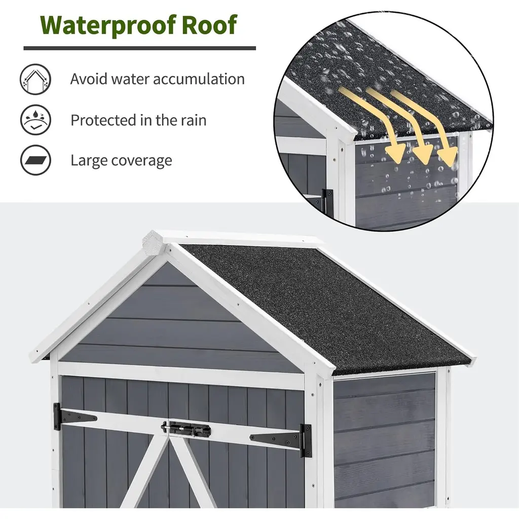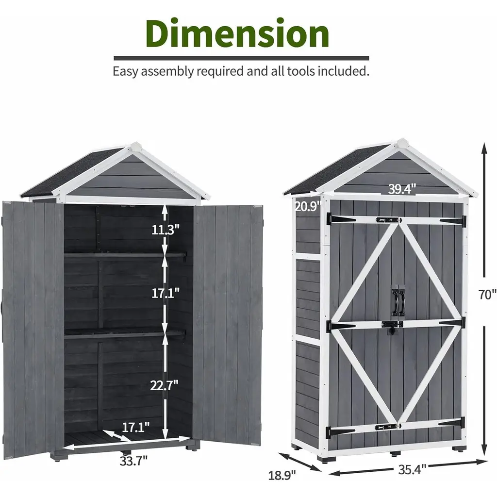 Get your garden in order with the Mcombo Outdoor Wood Storage Cabinet. Made of high-quality fir wood with a rustic finish, this cabinet features 2 removable shelves, a waterproof roof, 4 metal brackets, and 6 adjustable feet for stability. With dimensions of 35.4"x18.9"x70", you can easily store your garden tools without taking up too much space. This versatile cabinet is perfect for organizing your garden or patio, and the double doors lock for added security.Features:Additional Details: