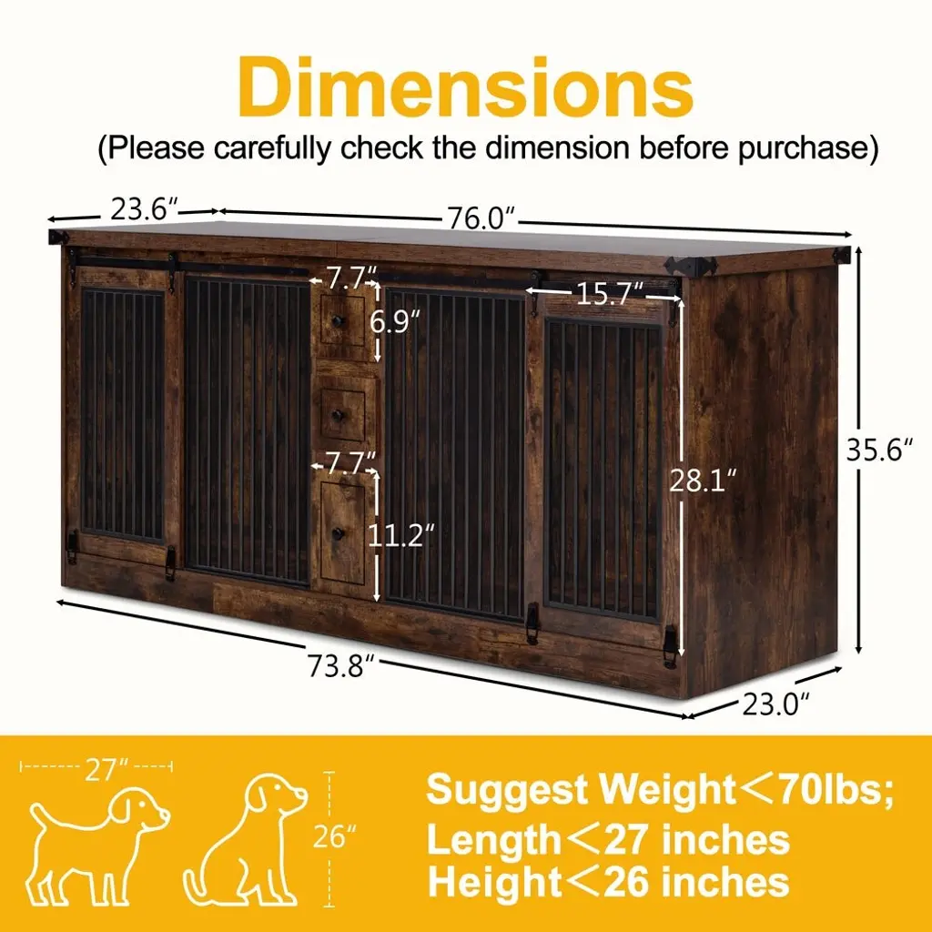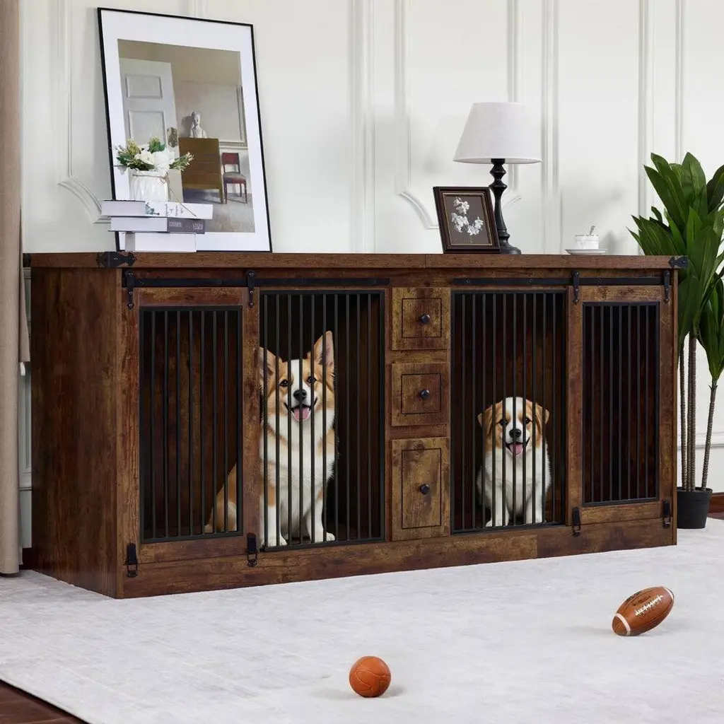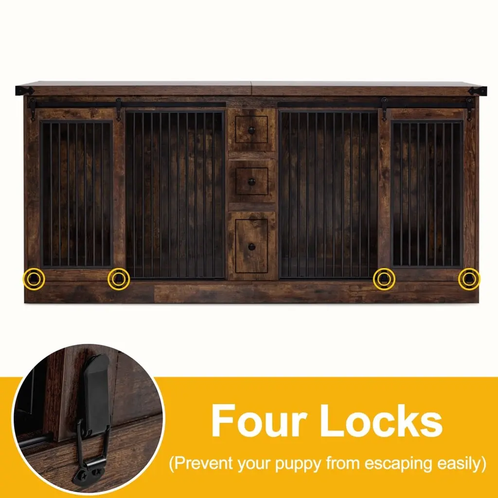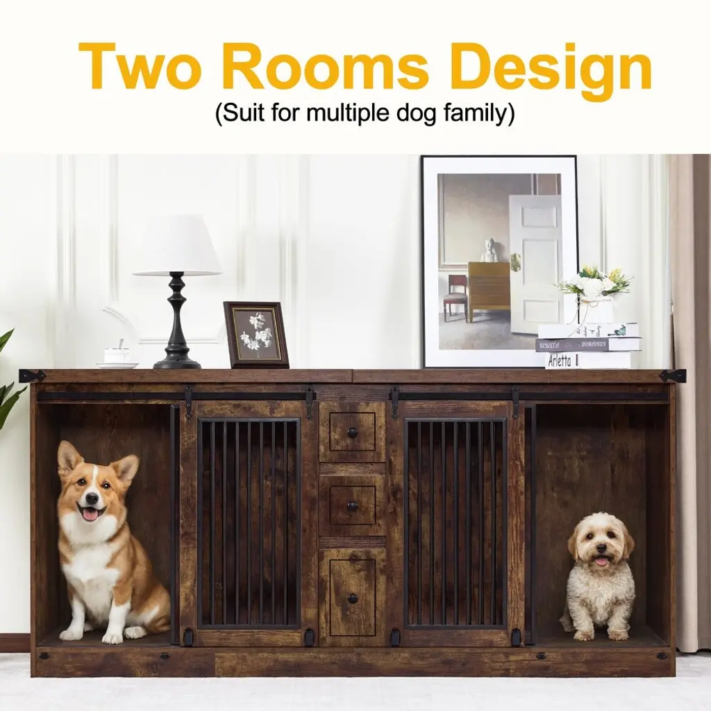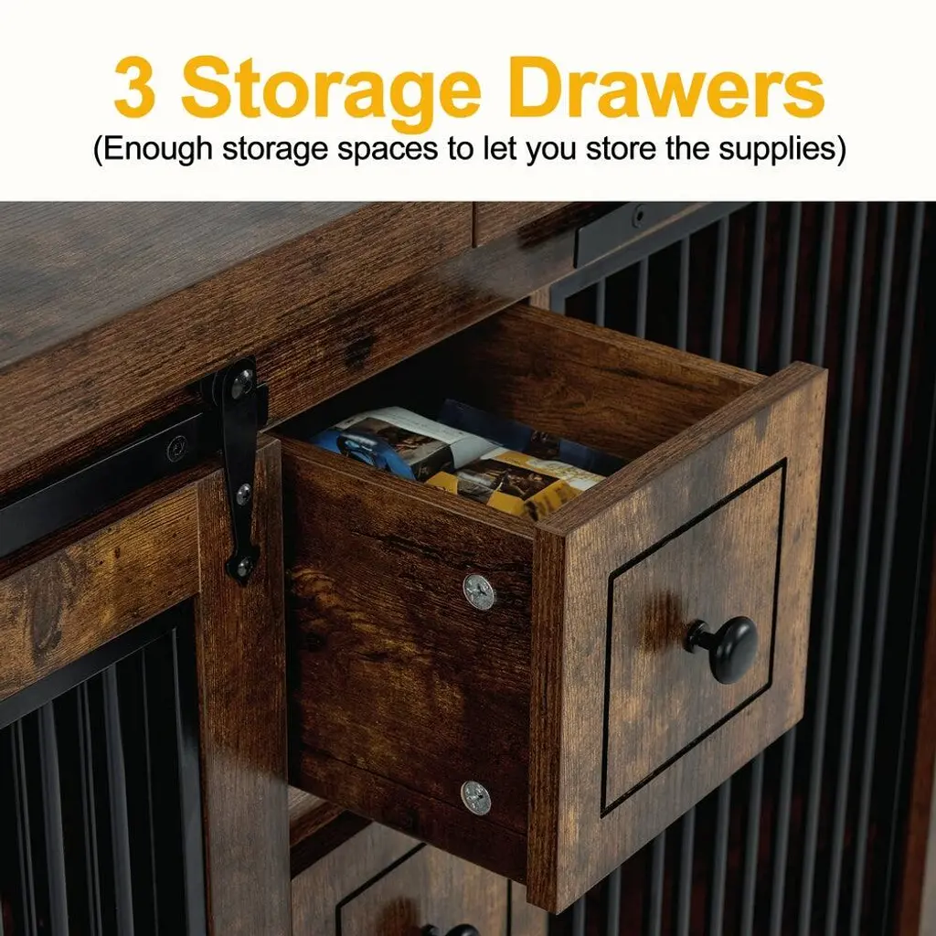 Key Features:Furniture Style: The design of the dog crate indoor combines functionality and style, blending seamlessly with the furniture style, you could use it as a TV stand, display cabinet, and more3 Drawers: The dog kennel furniture is equipped with 3 drawers to provide enough storage space for your needsTwo Rooms Design: The wooden dog crate has two rooms, making it suitable for use in multi-pet householdsSafe Design: The distance between the pet kennel bars is 1.0 inches to prevent your puppy from getting stuck4 Locks: The pet crate features 4 locks to ensure your puppy doesn't escape too easily