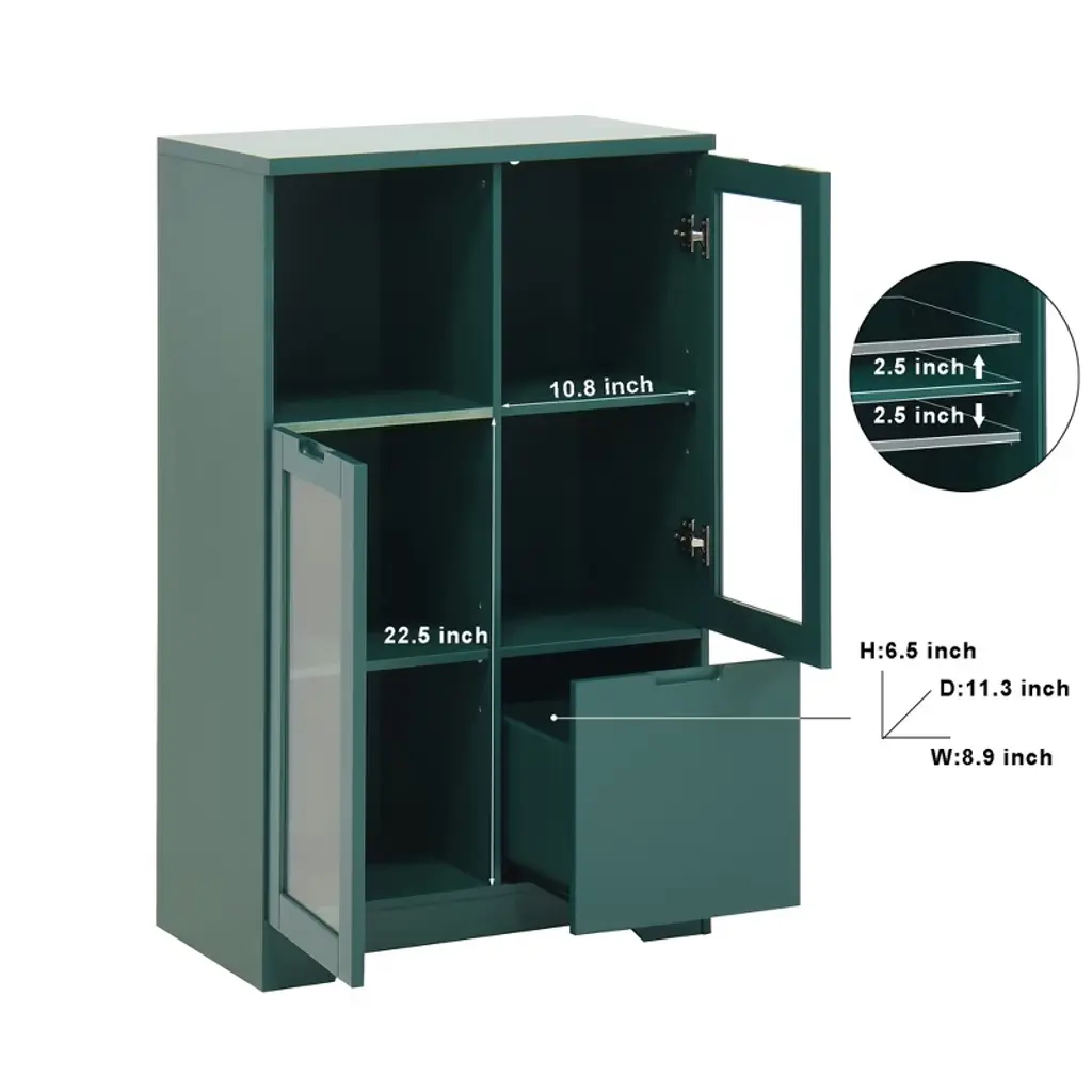 Mdf Painted Cabinet With Glass Doors And Drawer, Open Storage Space, Green ,Bedroom, Living Room