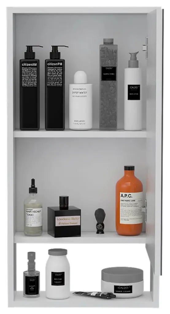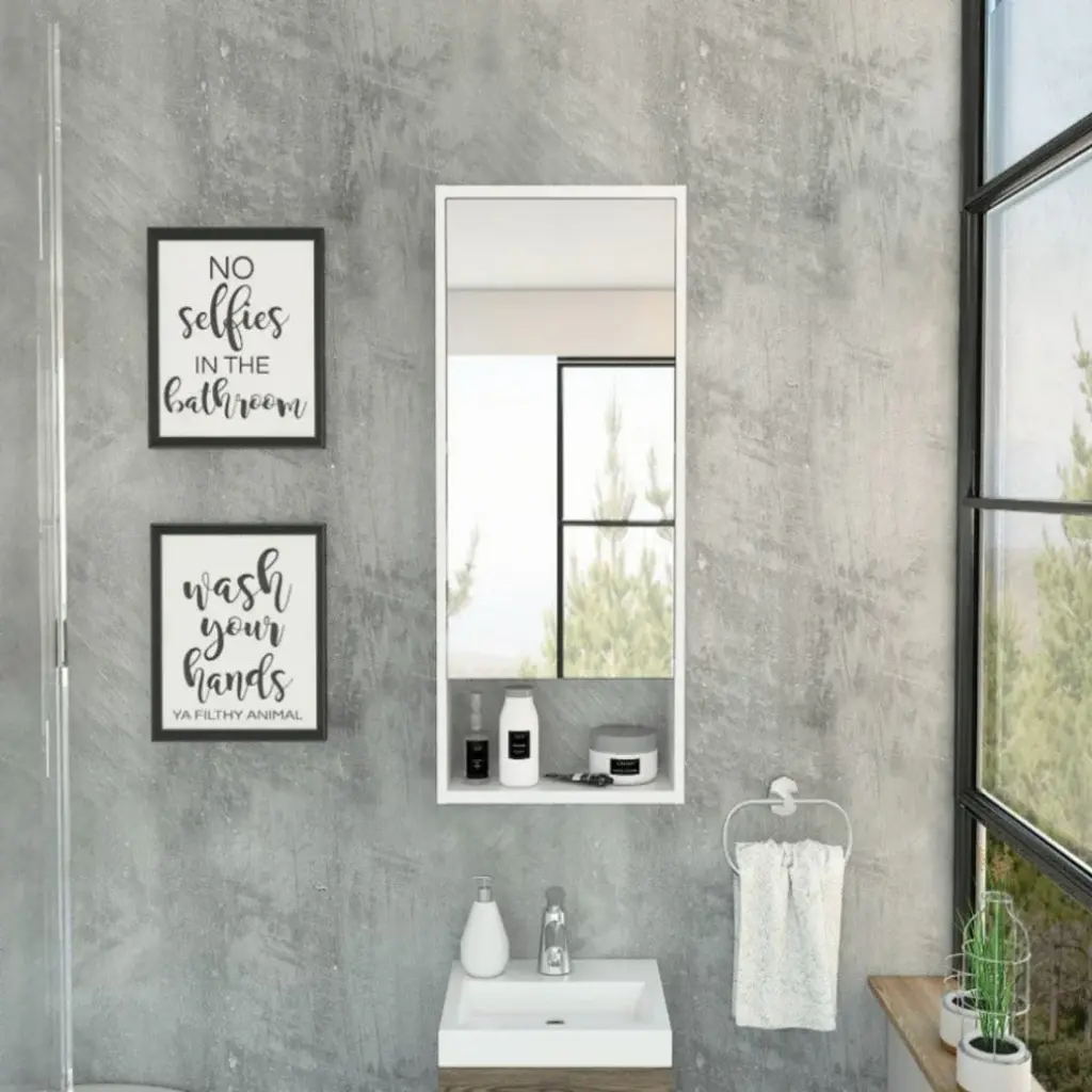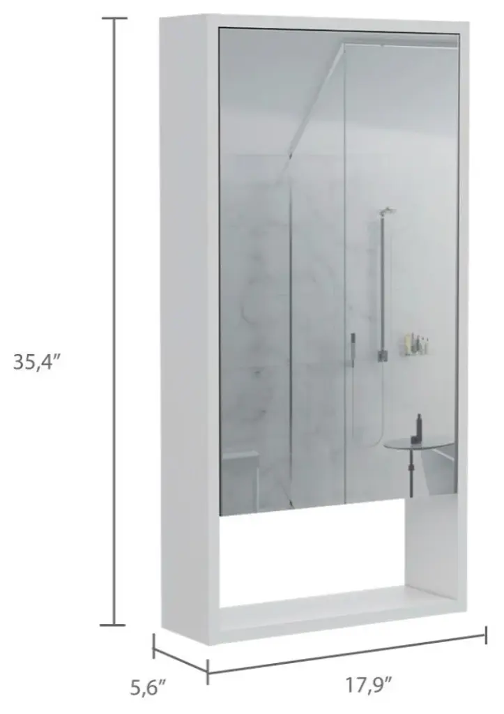 The Irvine Medicine Cabinet is a modern and elegant piece that gives you a stylish look in your bathroom. A functional and large mirror medicine cabinet that will help you to keep your bathroom organized and well maintained, and protect your things from the regular exposure to water and humidity found in a bathroom. Designed with white manufactured wood.Dimensions:Height: 35,4Width: 17,9Depth: 5,6Furniture Type:Ready to assemble (full assembly required).Certifications:CARB phase II compliant TSCA Title VI Compliant.Warranty: 1-year warranty coverage in wooden parts- 1-year warranty coverage in hardware pieces since its manufacturing date found in the lot number printed in the product box.Shipment details:Free shipping to the 48 contiguous states - delivery time: Between 2 and 5 days depending on the customer''s location, season and weather factors.Other details:''this product does not include decorative or background elements; Check that the box is in good condition, well packed and check with the help of the manual that the corresponding parts have been included.
