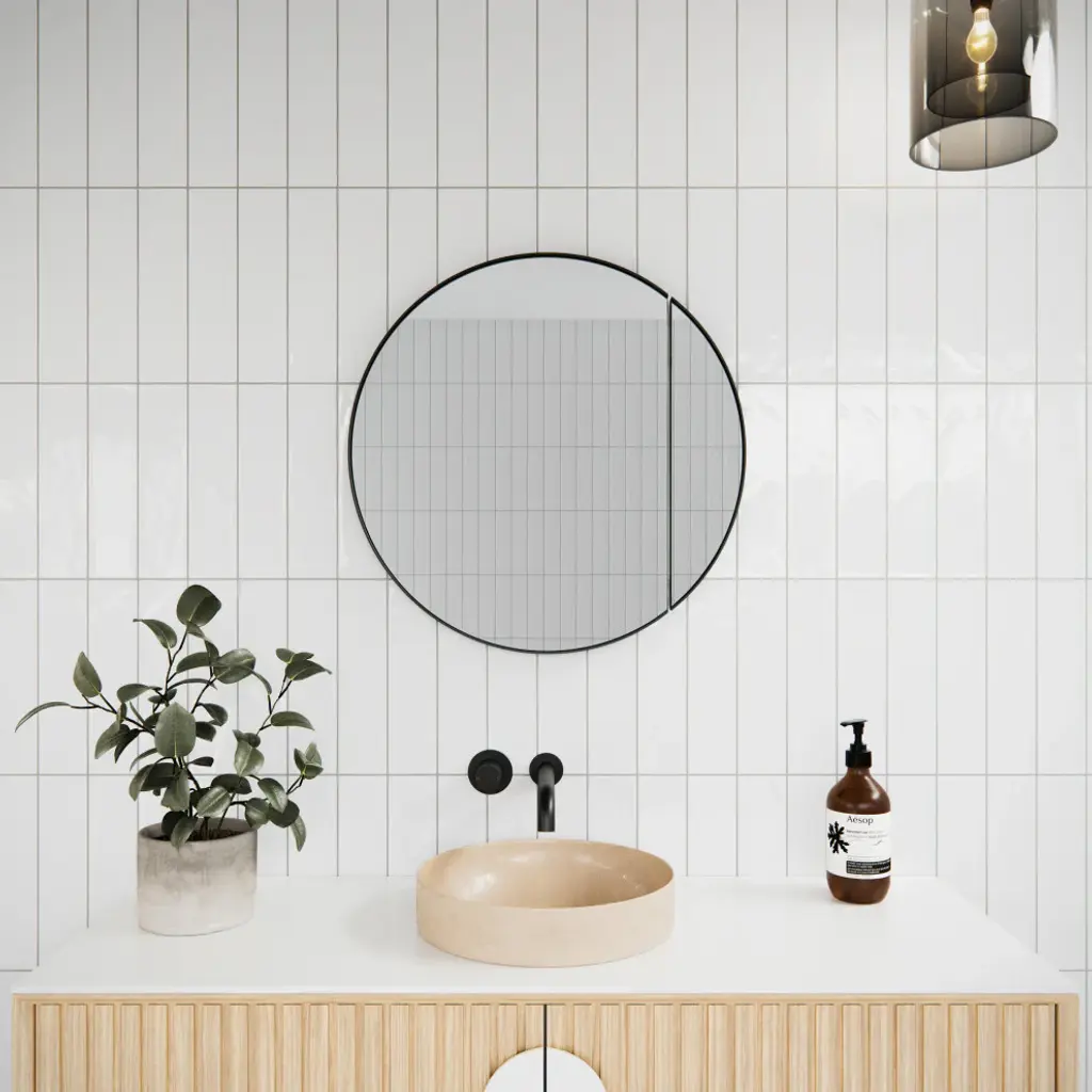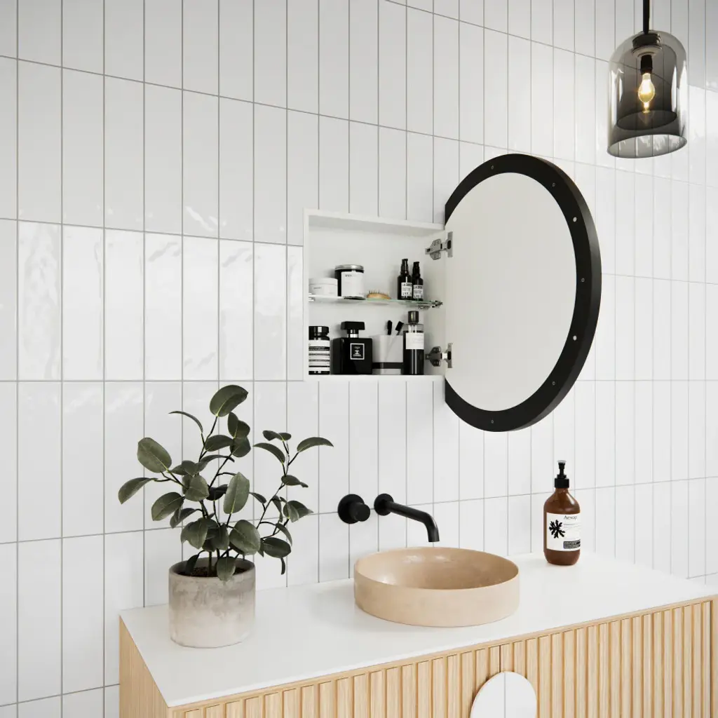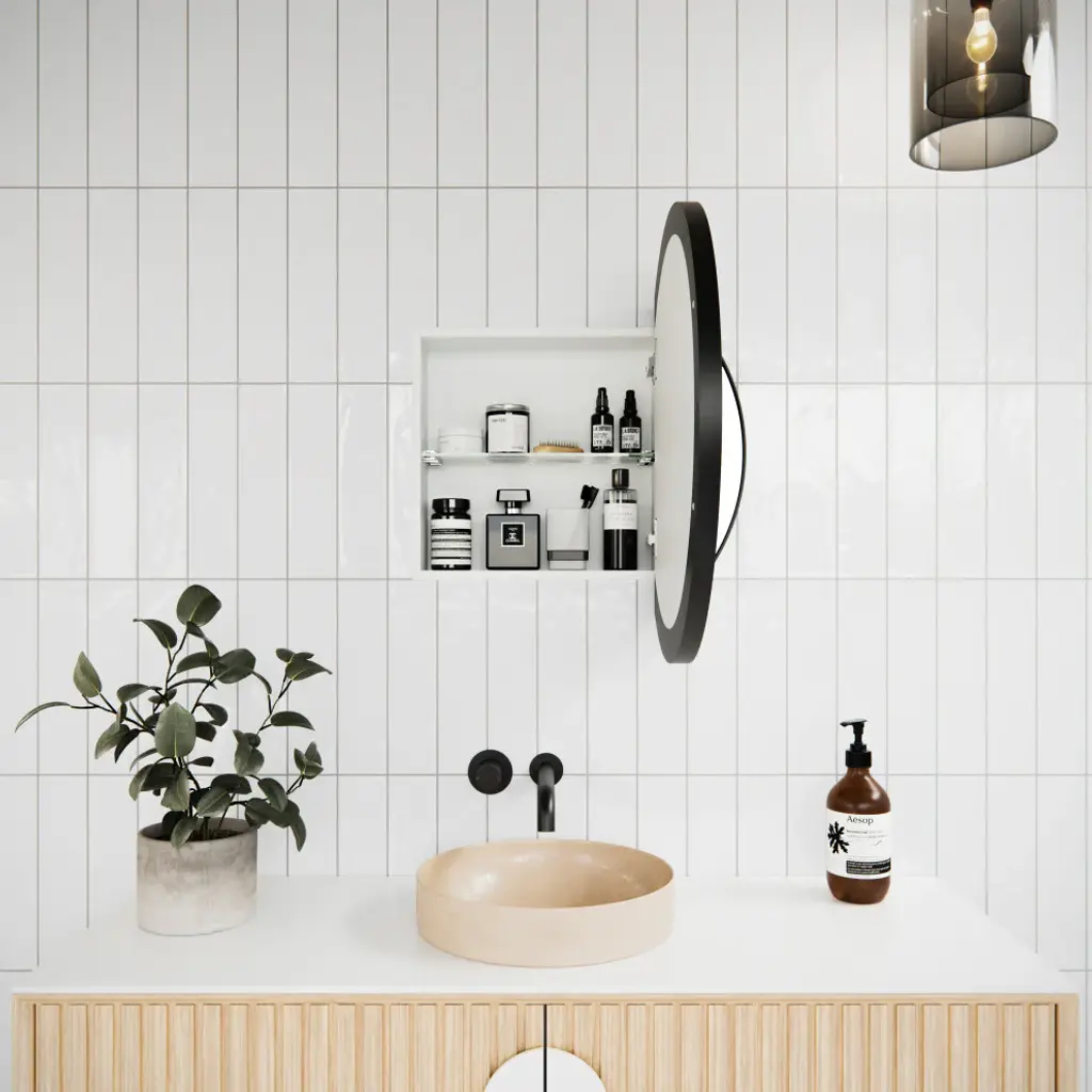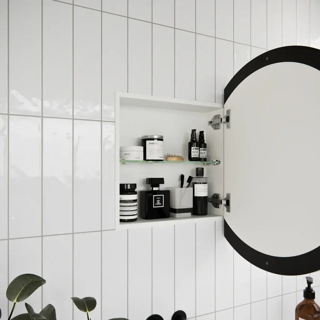 Create a sense of calm and relaxation in your bathroom with the Juno round mirror medicine cabinet. Designed to be recessed or mounted on the wall, this elegant vanity cabinet features a powder-coated rust-resistant steel frame and a circular mirrored door. In addition, a glass shelf makes it the perfect choice to keep your products hidden out of sight. With the Juno mirror cabinet by Glass Warehouse, your bathroom will become a light, bright and stylish retreat where you can relax and unwind.