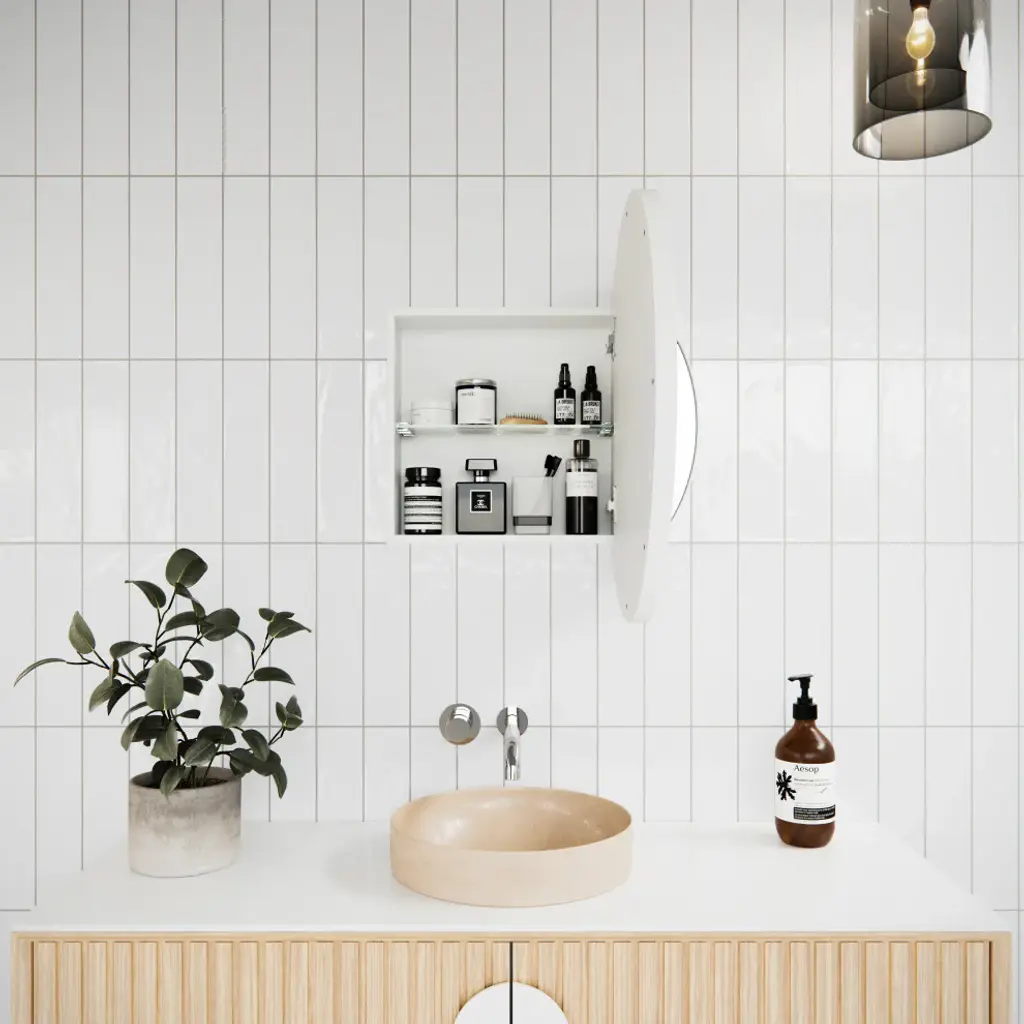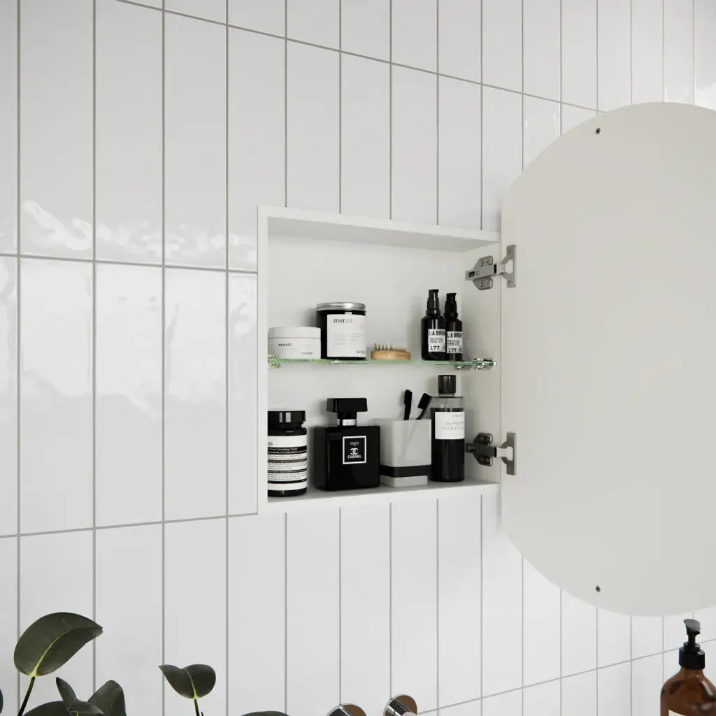 Create a sense of calm and relaxation in your bathroom with the Juno round mirror medicine cabinet. Designed to be recessed or mounted on the wall, this elegant vanity cabinet features a powder-coated rust-resistant steel frame and a circular mirrored door. In addition, a glass shelf makes it the perfect choice to keep your products hidden out of sight. With the Juno mirror cabinet by Glass Warehouse, your bathroom will become a light, bright and stylish retreat where you can relax and unwind.