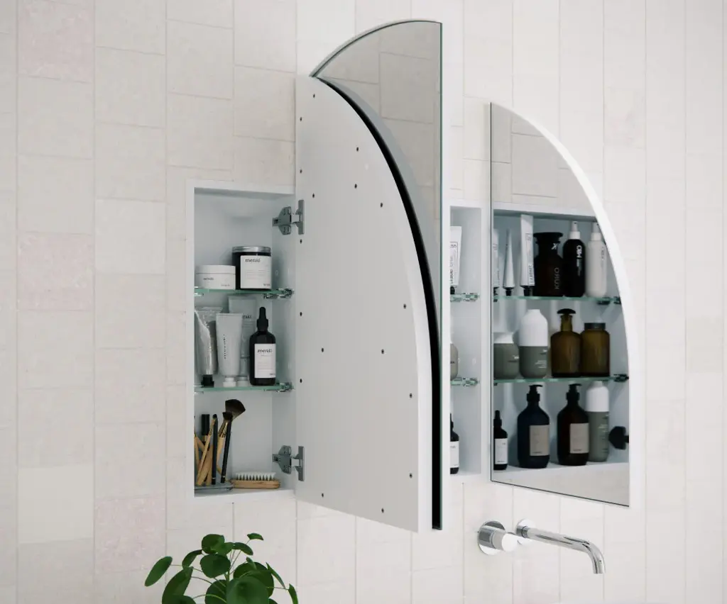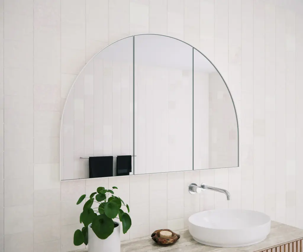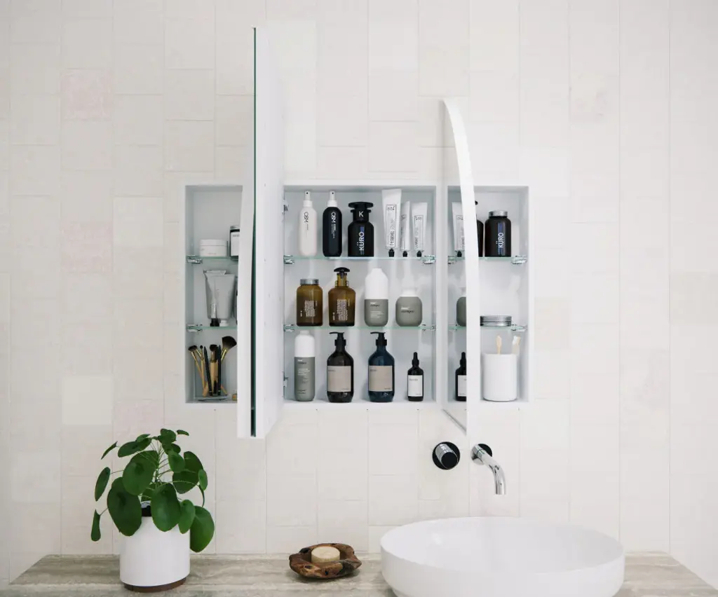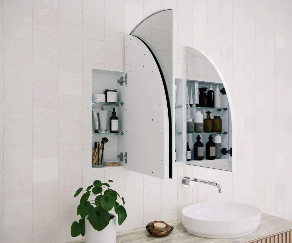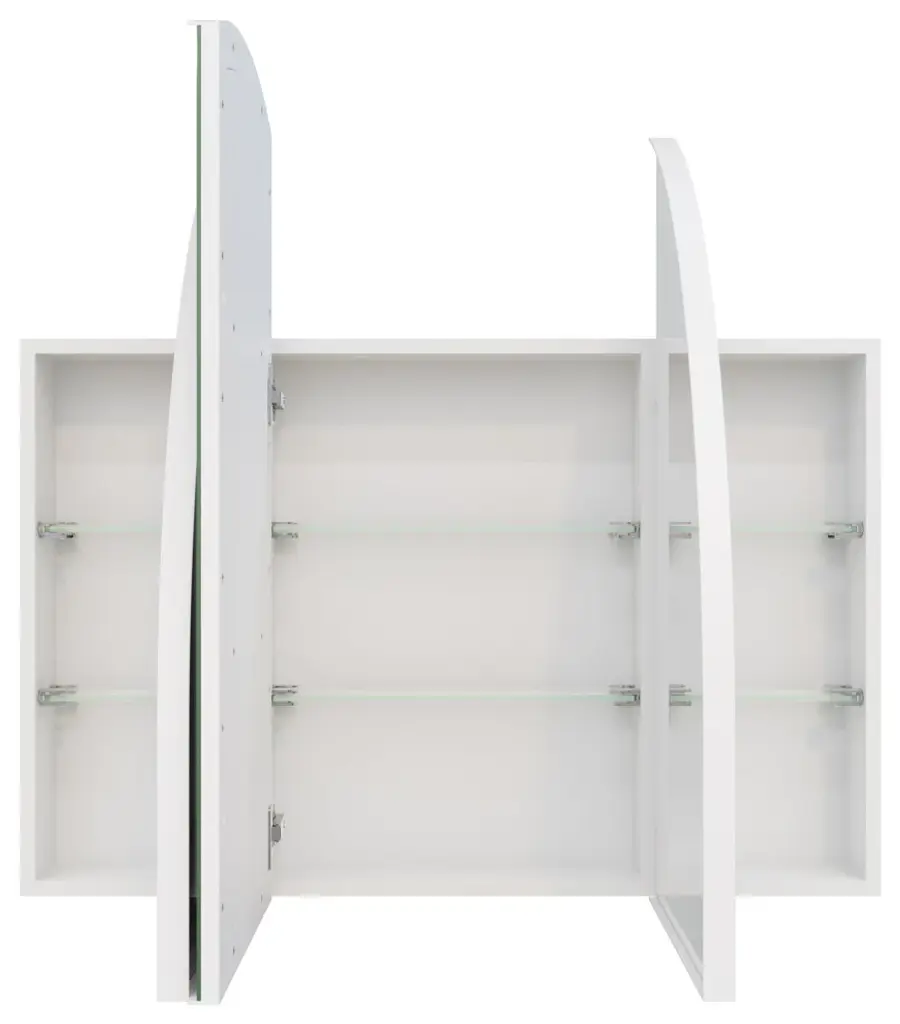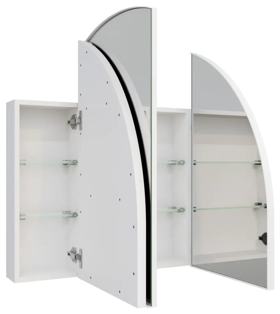 A gentle, fluid curve defines the Aria 3-door mirror medicine cabinet, creating an element of refined sophistication that will transform your bathroom. Featuring an attractive arched powder-coated rust-resistant steel frame and tri-view mirrored doors, the Aria is designed to be recessed or mounted on the wall. This gorgeous vanity mirror cabinet by Glass Warehouse also features six glass shelves, offering plenty of storage to keep your products hidden out of sight. As a result, your bathroom will look and feel like the ultimate sanctuary.