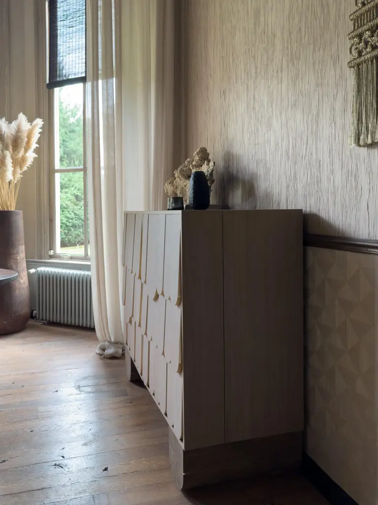 Medium Trunk Cabinet by Atelier Ruben Van MegenDimensions: W 158 x D 64 x H 134 cmMaterials: Oak (base), MDF, HPL, Brass.Ruben van Megen (1984) graduated from the Design Academy in Eindhoven in 2012, with the focus ‘public space’. Before that, he studied in Rotterdam, at het HMC College. His passion for design and fascination for developing new materials are a guarantee for high profile and unique work. Hence, starting his own design studio, Atelier Ruben van Megen, was self evident. In 2015, the first furniture collection “Uno” was born. In 2016, the second furniture collection, Café 6116, followed. Acknowledgment of the ‘Atelier Ruben van Megen-style’ became reality when the dining table from the Café 6116 was rewarded with a Red Dot Award; one of the most prestigious international labels for high quality design. The design has also won an A’ Design Award and Talente Award. Café 6116 is unique because it is inspired by re-use of materials and precious memories of the former owners. On top of that: the contemporary series is just stunningly executed. In 2018, Atelier Ruben van Megen launched the chairs ‘Antimacassar III’ and ‘The Cord Connection’ and in 2020, ‘Sandcastles’ followed; a range of designs made out of sand. The work of Atelier Ruben van Megen is often international presented. For example, during the Salone del Mobile in Milano, New York Design Week (NYCxDesign), the London Design Festival and Dutch Design Week. The pieces are included in the collections of several international galleries and are regularly displayed in various museums. The designs are carefully produced in our own workshop, only the best materials are used. For specialized techniques, we collaborate with companies in our own region. Occasionally, we lecture about designing, entrepreneurship, and international business in the creative branch.