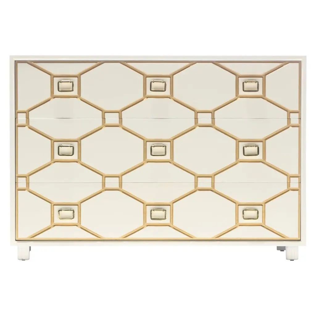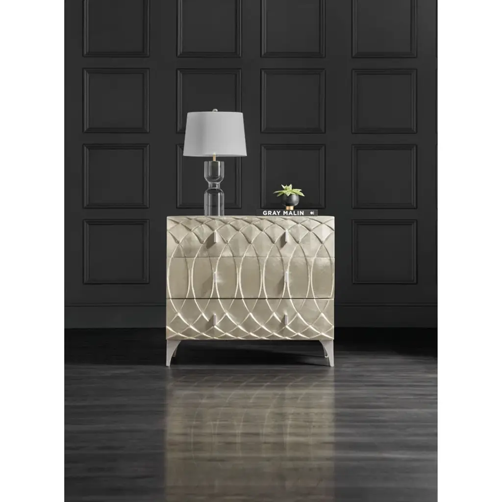 Serene symmetry in a German silver foil finish offers a tranquil style in a focal piece for any living space. Crafted of mango wood with an interlocking ovals motif on the front in German silver foil, accented by small silver bar pulls and silver metal legs, the chest has three drawers with side-mounted metal drawer guides. Come closer to Melange, and you will discover something unexpected. An eclectic blending of colors, textures, and materials in a vibrant collection of one-of-a-kind artistic pieces, Melange is meant to inspire you and fuel an experience of self-discovery, inspiring a renaissance in your home. Each piece of Melange has its own story. The designs are versatile and timeless, easily transcending from one life stage to the next, from home to home, and generation to generation.