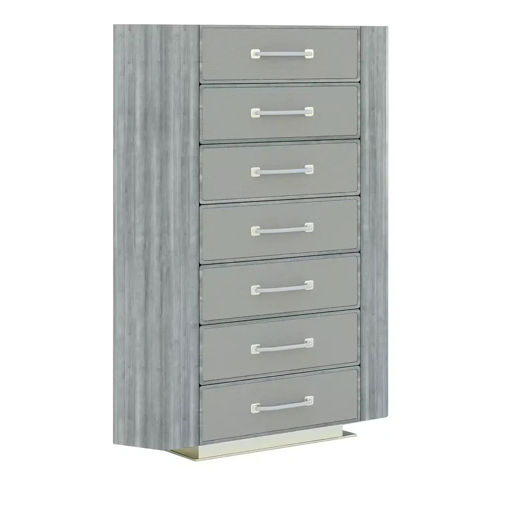 The centerpiece of the Mellifera series, this grand cabinet features ample storage space (4 small and 6 large drawers) while not compromising on luxury. The sculpted, irregular frame in Eucalyptus wood boasts a matte-gray-blue lacquer that complements the leather upholstery of the drawer fronts and handles. A Champagne-finished metal base supports the entire piece. Please consult the Artemest catalog for complementary pieces from the same collection