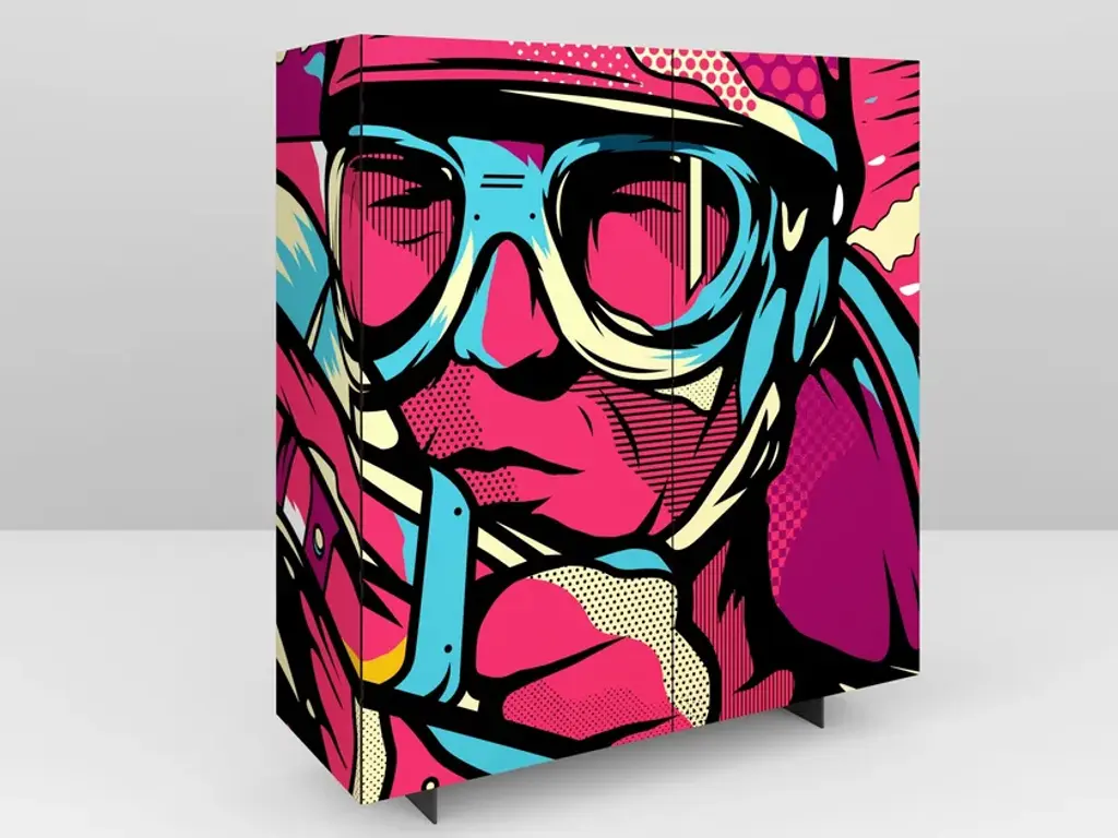 Highboards with two doors in lacquered wood. The exterior is made of digital printing with protective paint. The container is supplied with a metal pedestal.
