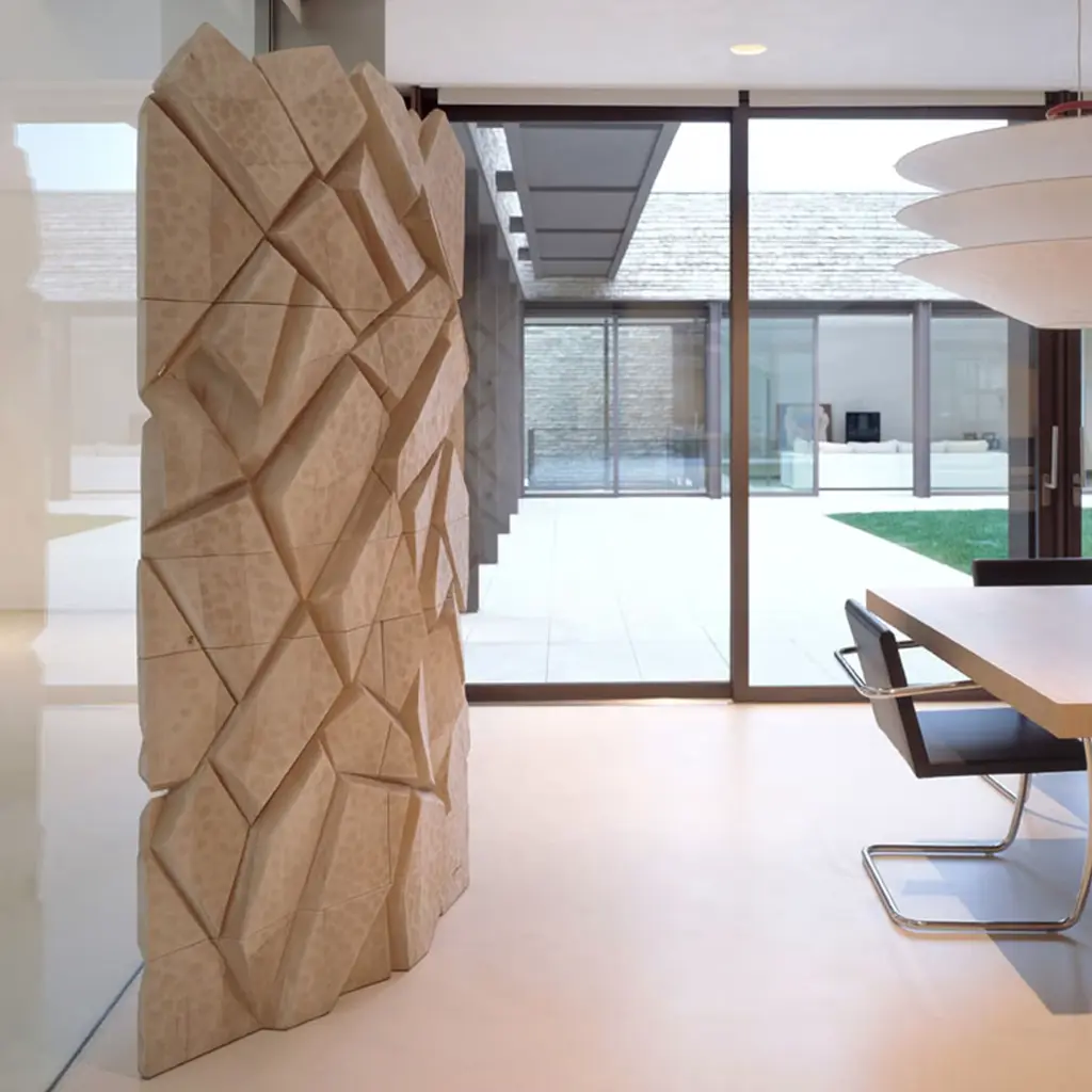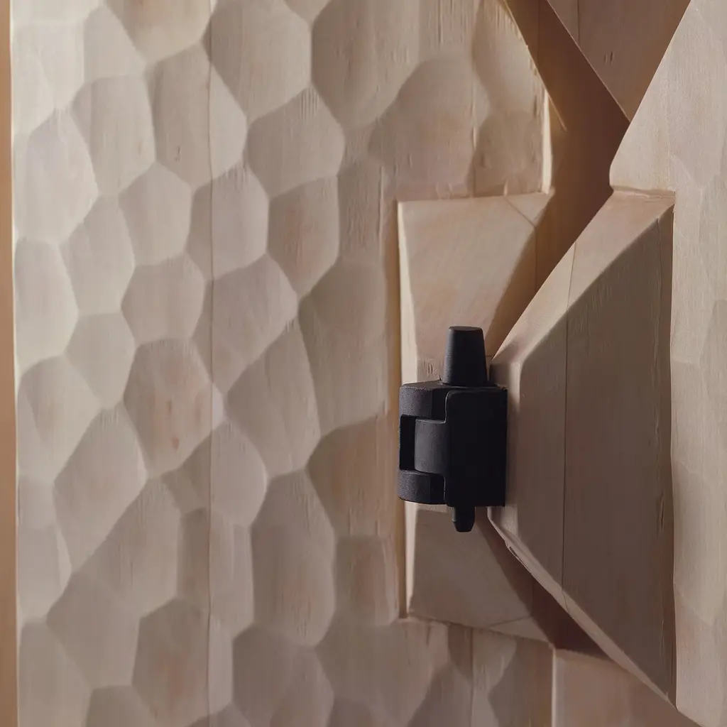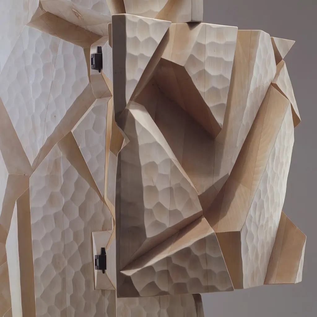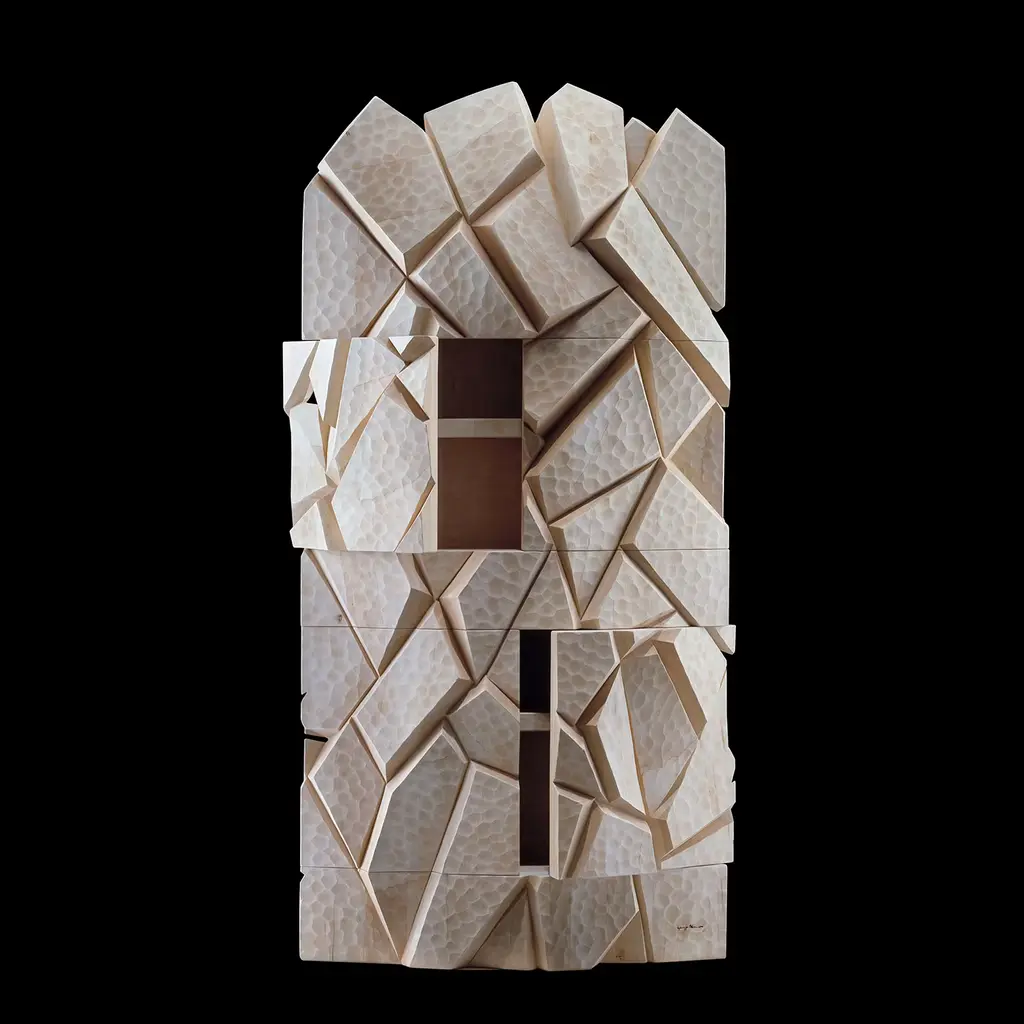 Monolithic four doors container, built with vertical fiber. Surfaces carved with a gouge. Visible hinges at the back in burnished steel.