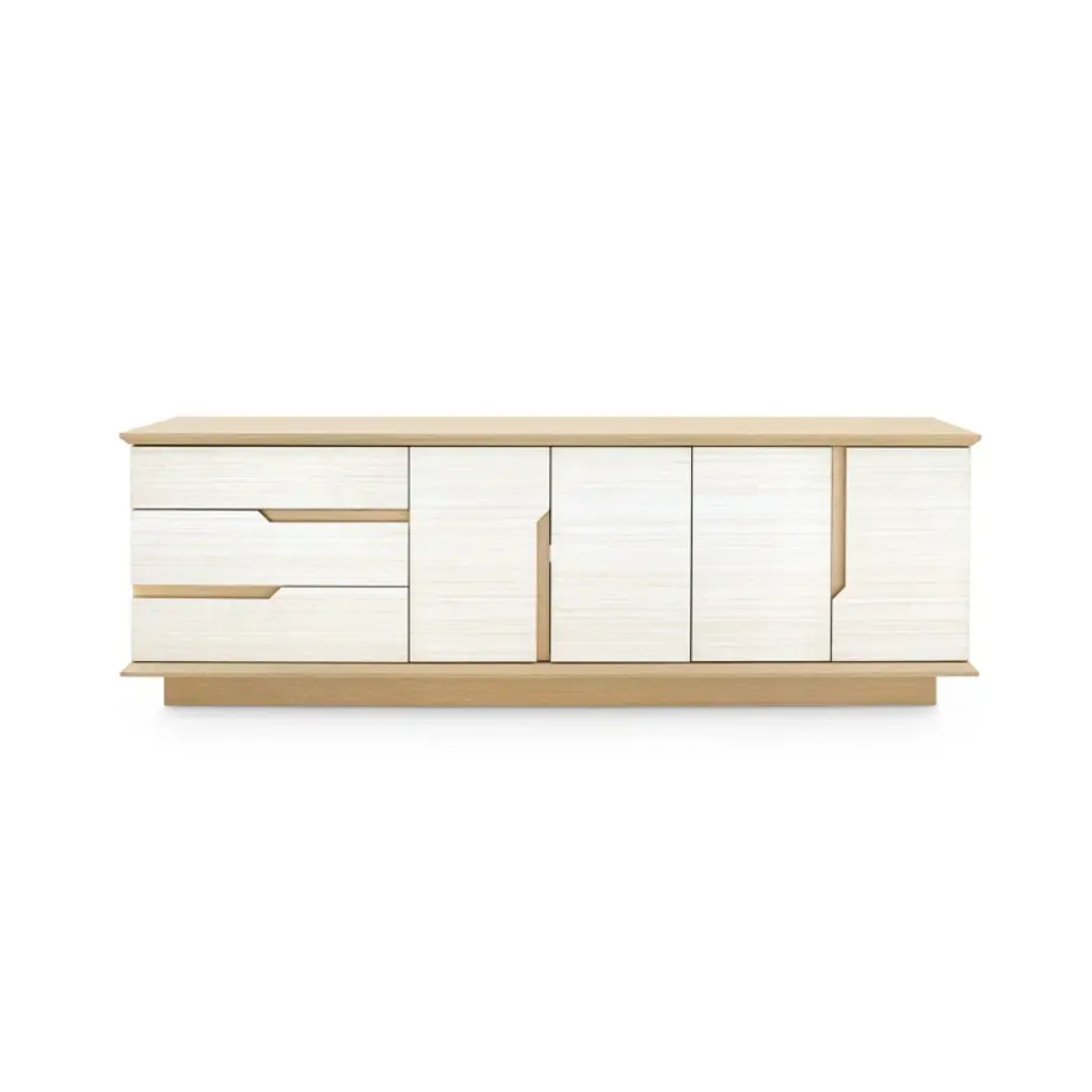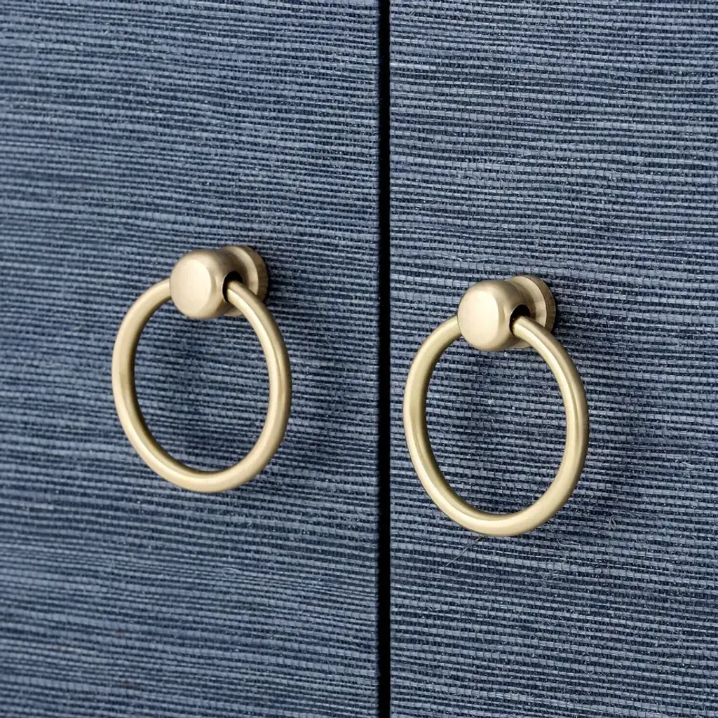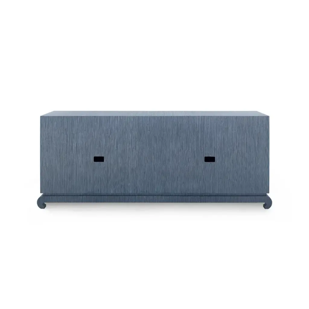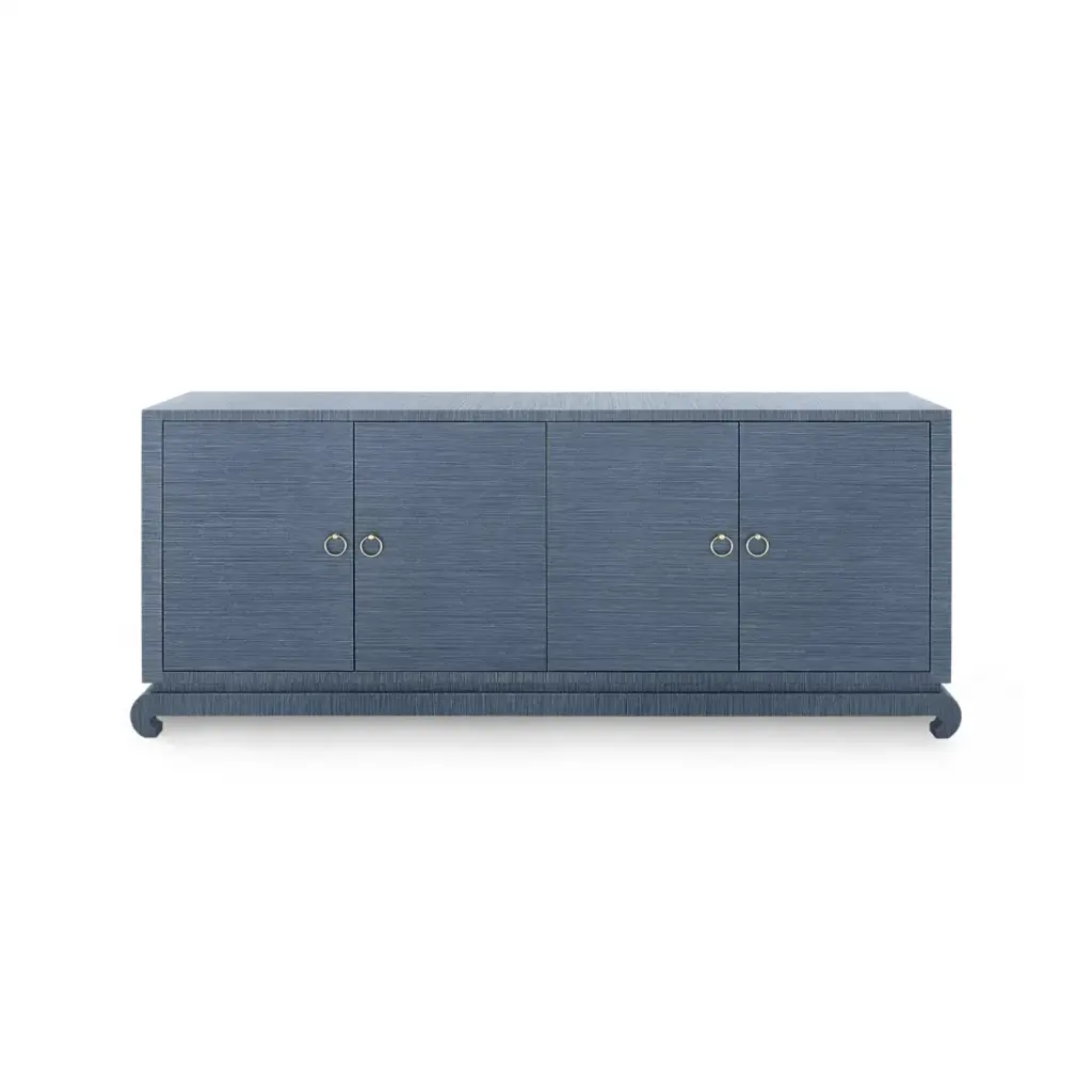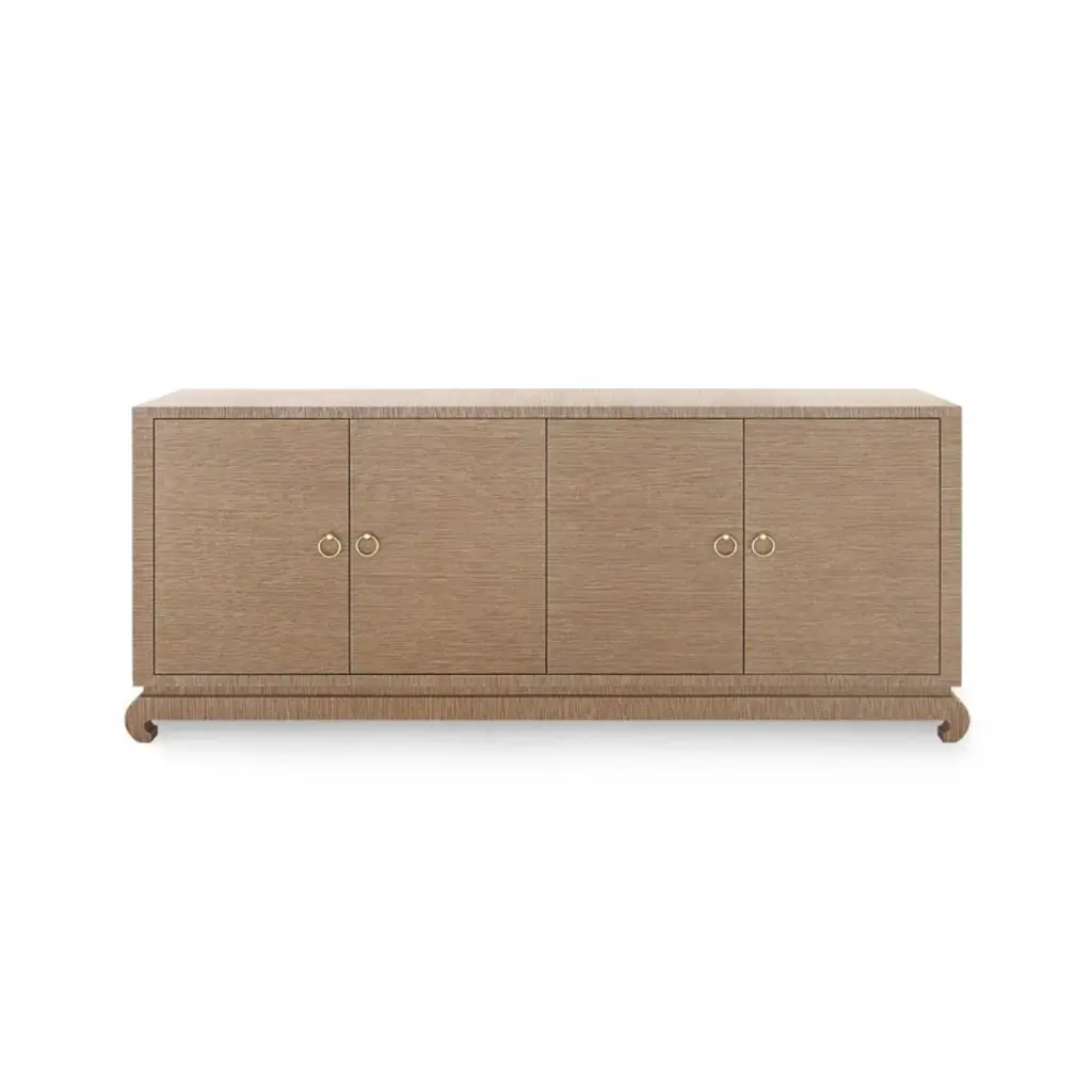 A sophisticated piece for any of your storage needs, the Meredith Extra Large 4-Door Cabinet brings handsome tailoring and luxurious finishes to a study, dining room, or home entertainment area. Its classic silhouette finds a dash of decorative refinement in its base, which features delicately curved Chow-style feet and an inset edge that adds dimension to its solid, elongated form. Four doors make up its facade, adorned with glittering gold finish ring pulls. Inside, four fixed shelves, richly stained, provide generous space for glassware, linens, or toys. The Meredith is also ideal for neatly arranging electronics, with two back openings for cables and wires. This piece is finished in lush, lightly textured lacquered grasscloth—a signature design detail showcasing Villa & House’s high-end craftsmanship.