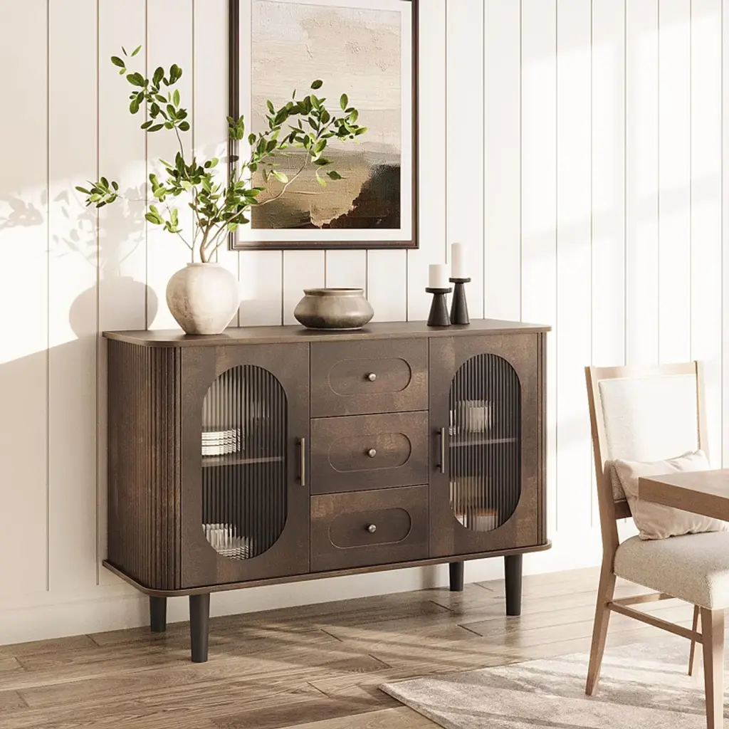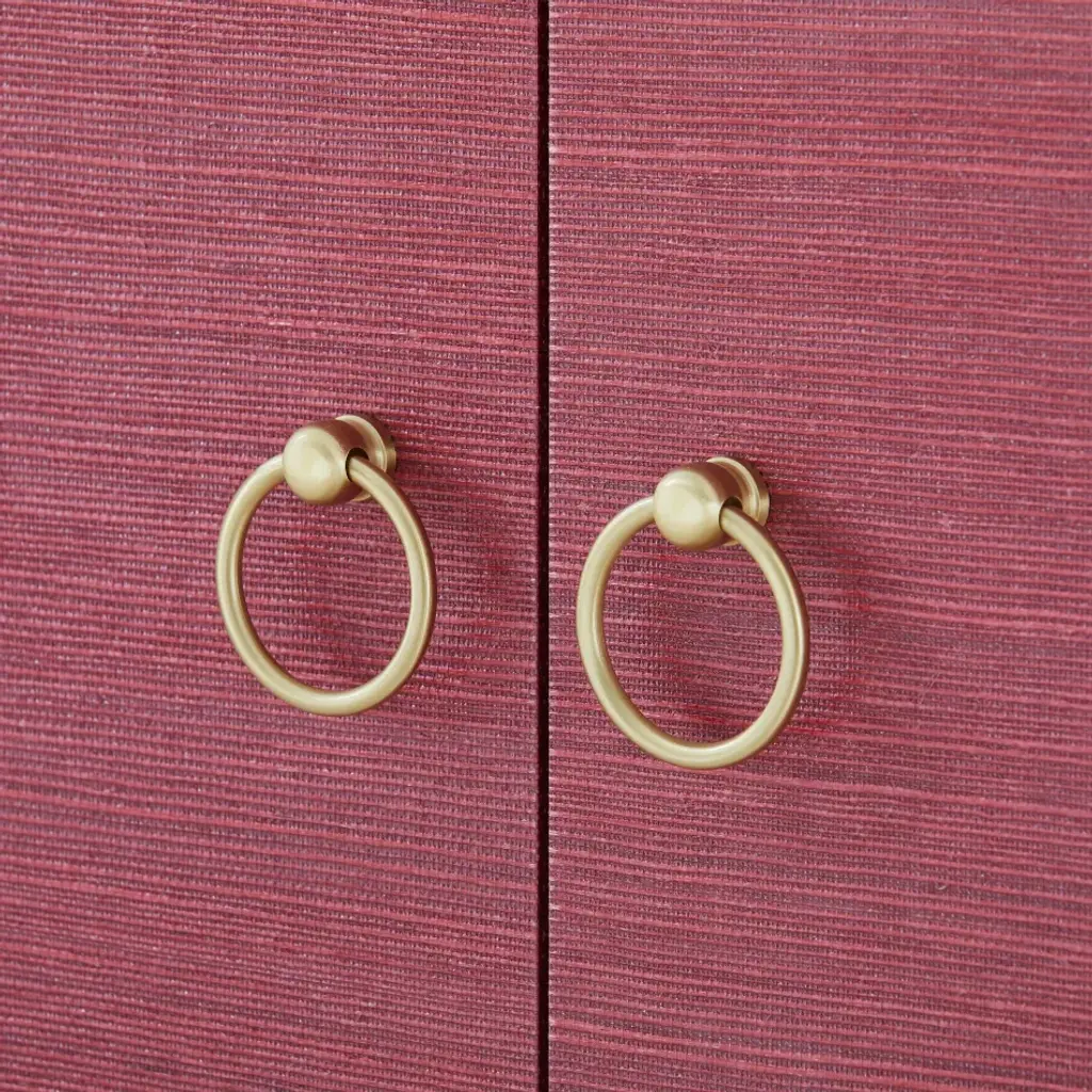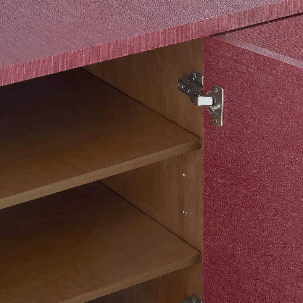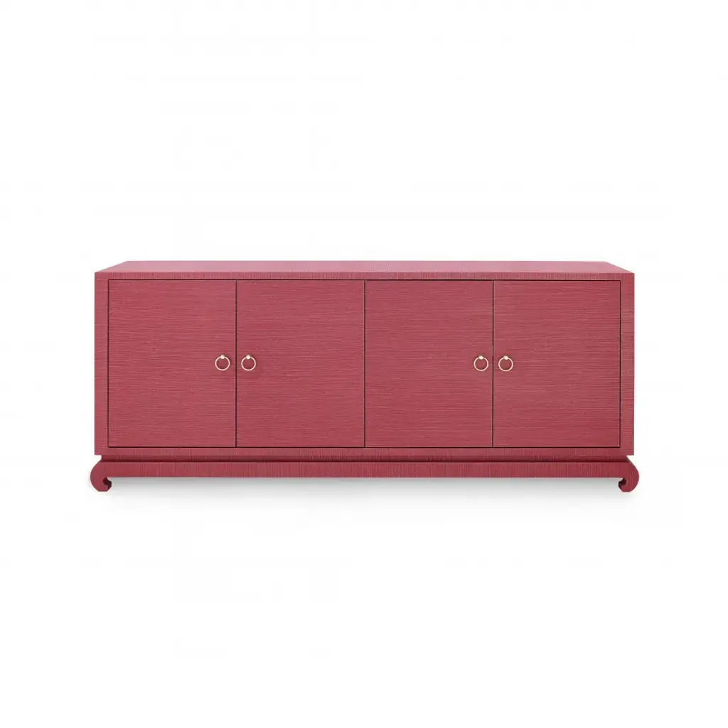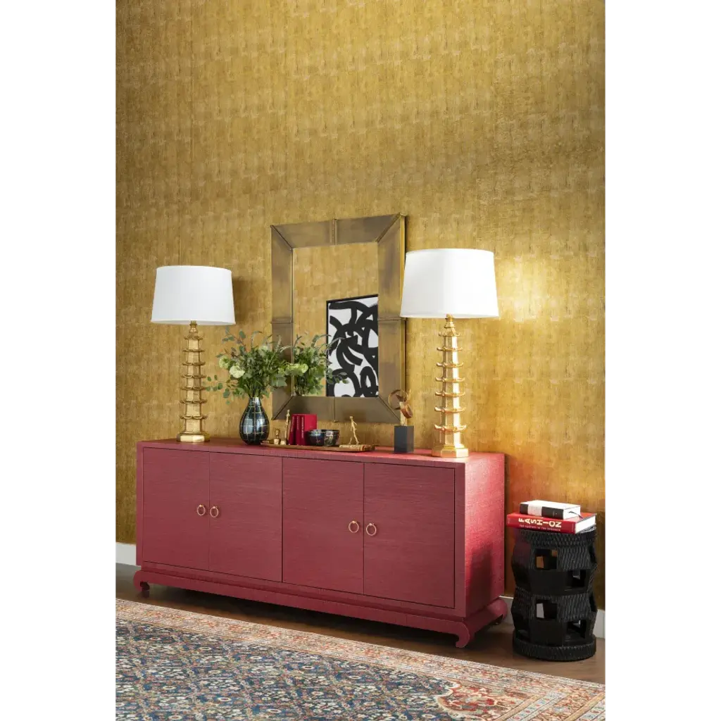 A sophisticated piece for any of your storage needs, the Meredith Extra Large 4-Door Cabinet brings handsome tailoring and luxurious finishes to a study, dining room, or home entertainment area. Its classic silhouette finds a dash of decorative refinement in its base, which features delicately curved Chow-style feet and an inset edge that adds dimension to its solid, elongated form. Four doors make up its facade, adorned with glittering gold finish ring pulls. Inside, four fixed shelves, richly stained, provide generous space for glassware, linens, or toys. The Meredith is also ideal for neatly arranging electronics, with two back openings for cables and wires. This piece is finished in lush, lightly textured lacquered grasscloth—a signature design detail showcasing Villa & House’s high-end craftsmanship.
