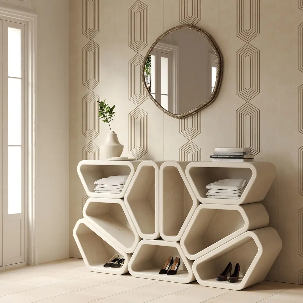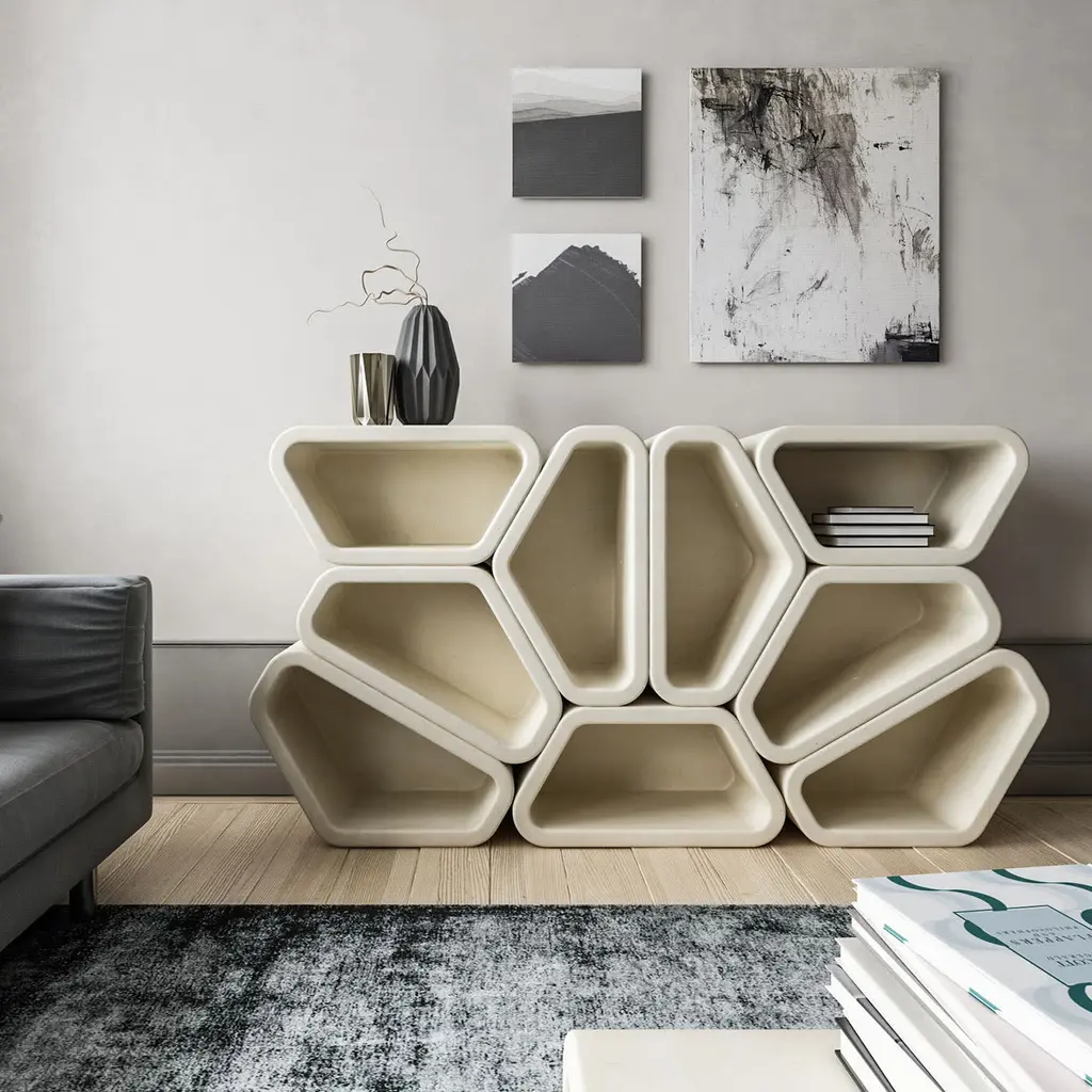 Squarish blocks of precious and naturally bright Lecce limestone are combined into a spectacular symmetric composition in this eye-catching highboard inspired by rock walls typical of the Salento countryside. Designed by Noii Studio with versatility in mind, the blocks can be assembled and disassembled as desired to achieve customized compositions tailored to one's needs, from private to hospitality settings.