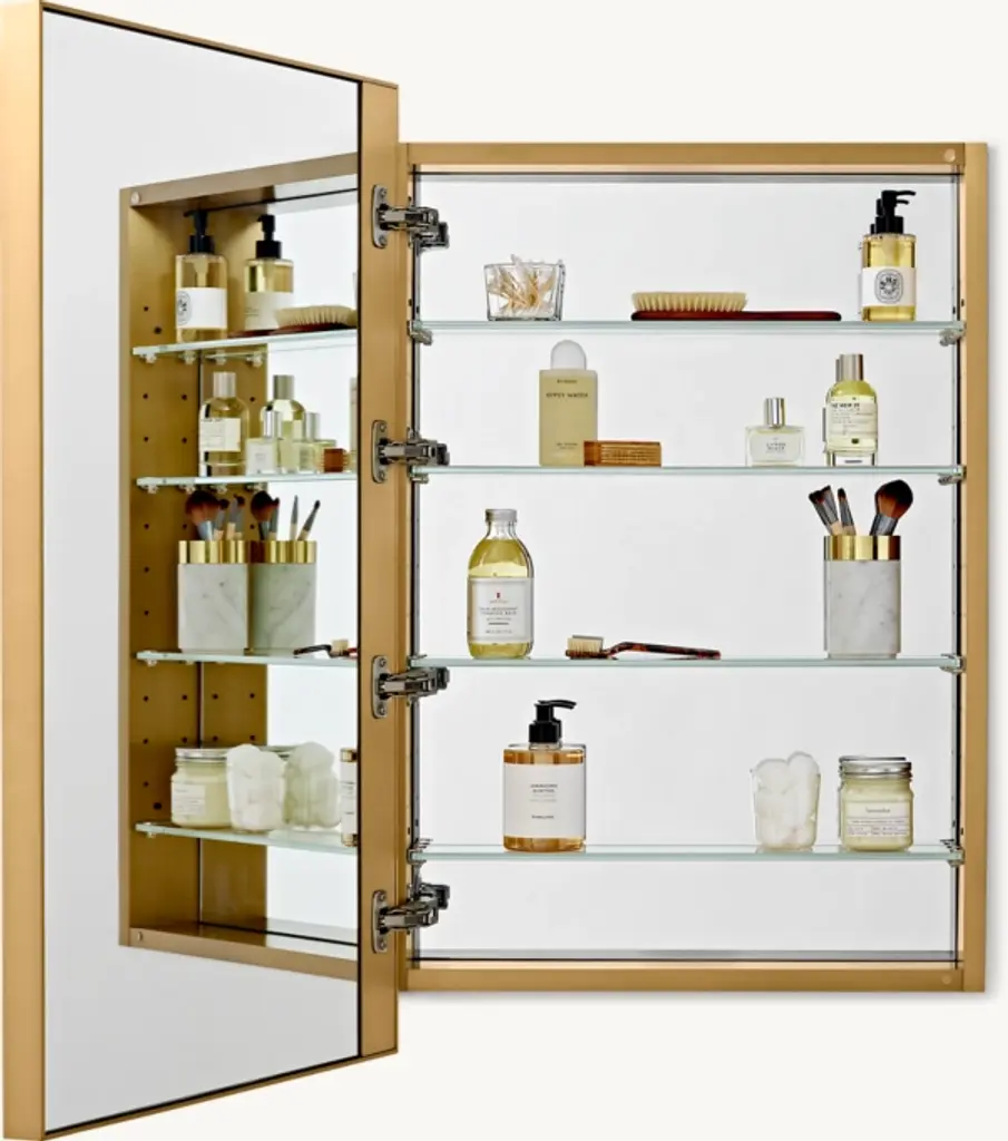 A floating mirror lends depth and visual interest to our minimalist medicine cabinet, combining with the clean lines of the hand-crafted metal frame to make a statement in any bath. The oversized mirrored door opens to adjustable, tempered-glass shelves with ample storage.