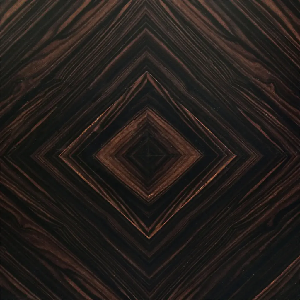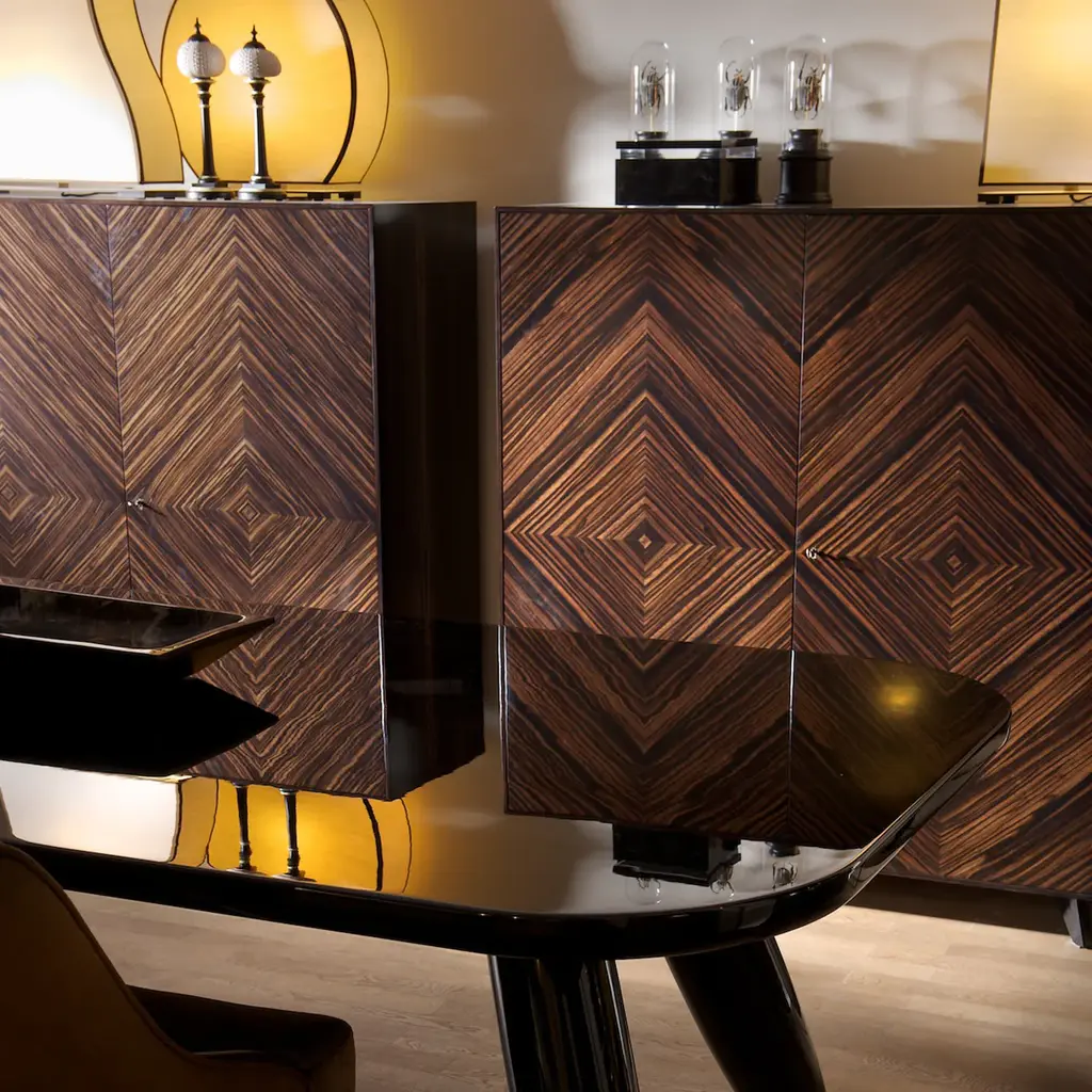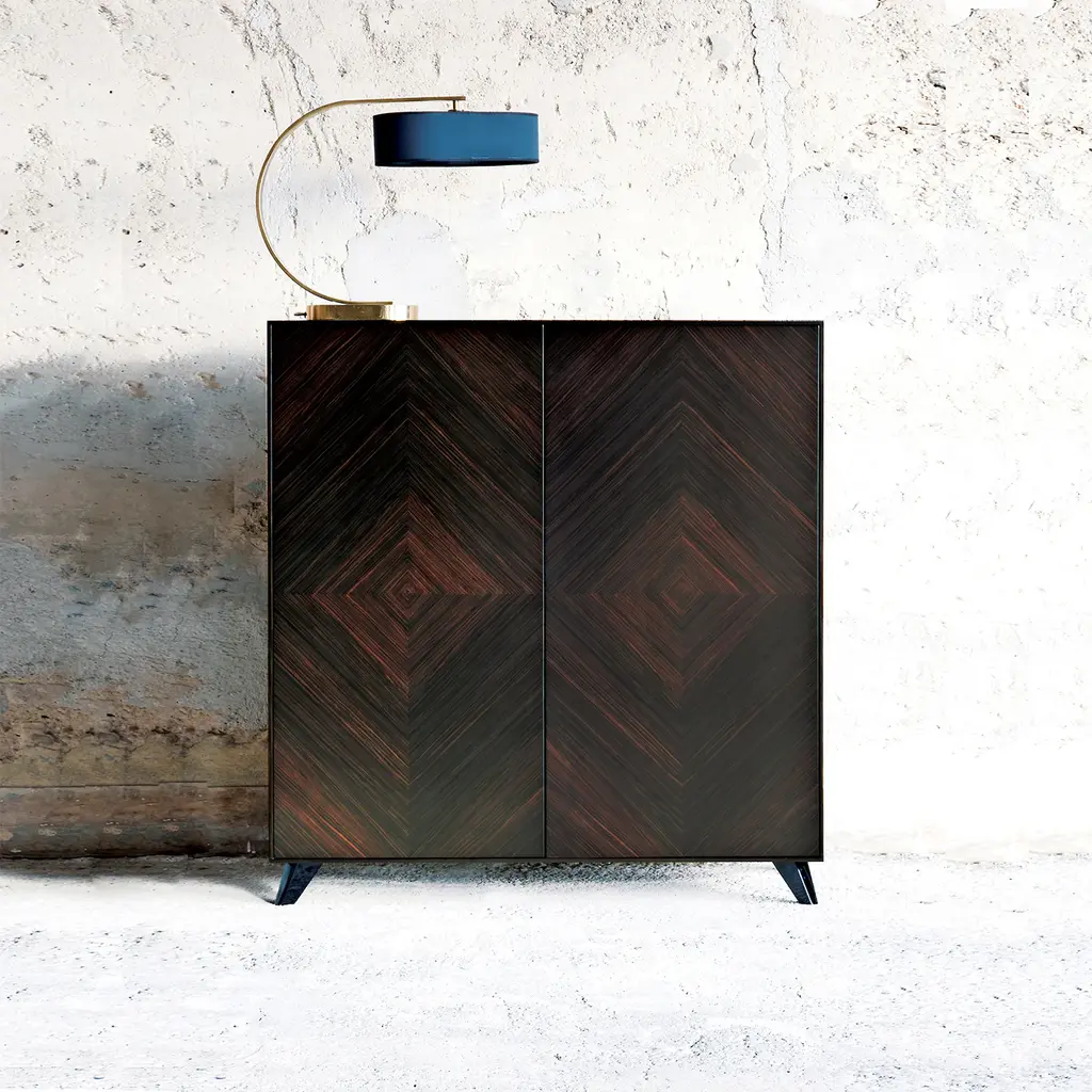 Part of the Michel series, this tall cabinet is a superb addition to a modern or vintage-inspired decor. An ode to the charm of the '50s style, this piece is distinctive for its geometric silhouette supported by short, slanted legs in ebony with a glossy black lacquer, and characterized by a superb front equipped with two doors elegantly adorned with a diamond-shaped Macassar ebony veneer with a matte finish. Worked by hand, the two front panels are equipped with a key-lock closure. Inside the dark stained interior has two internal shelves.