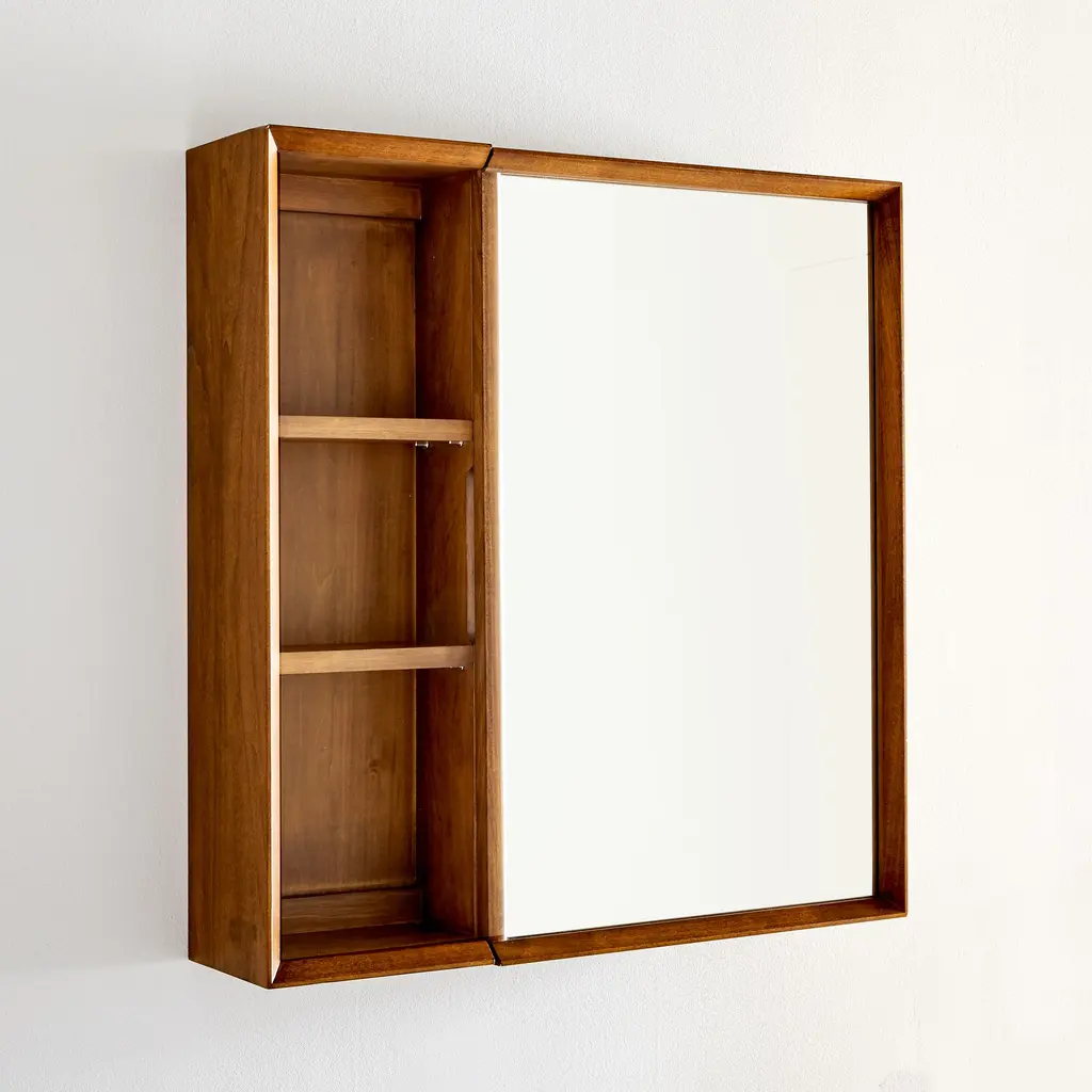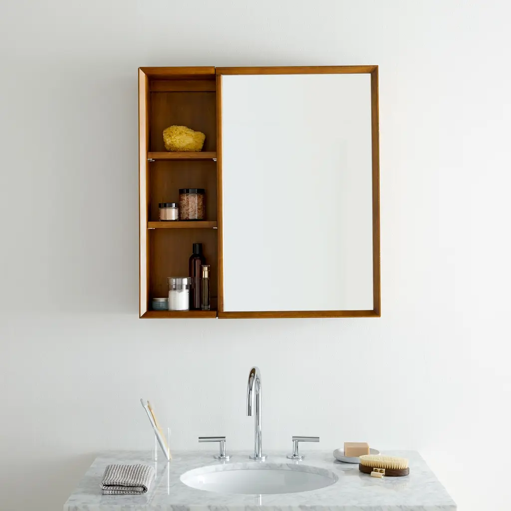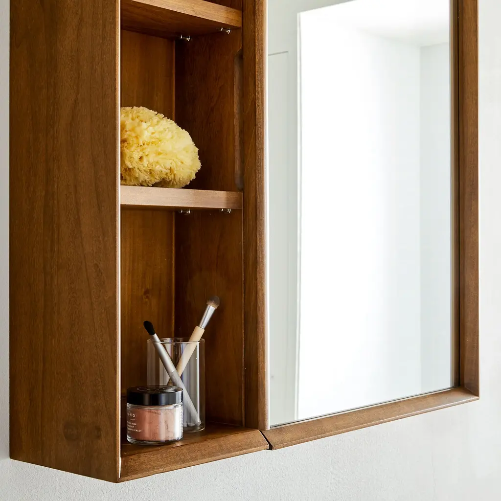 Its mid-century inspired design. Has plenty of storage for all your needs. Made of bathroom-safe materials.