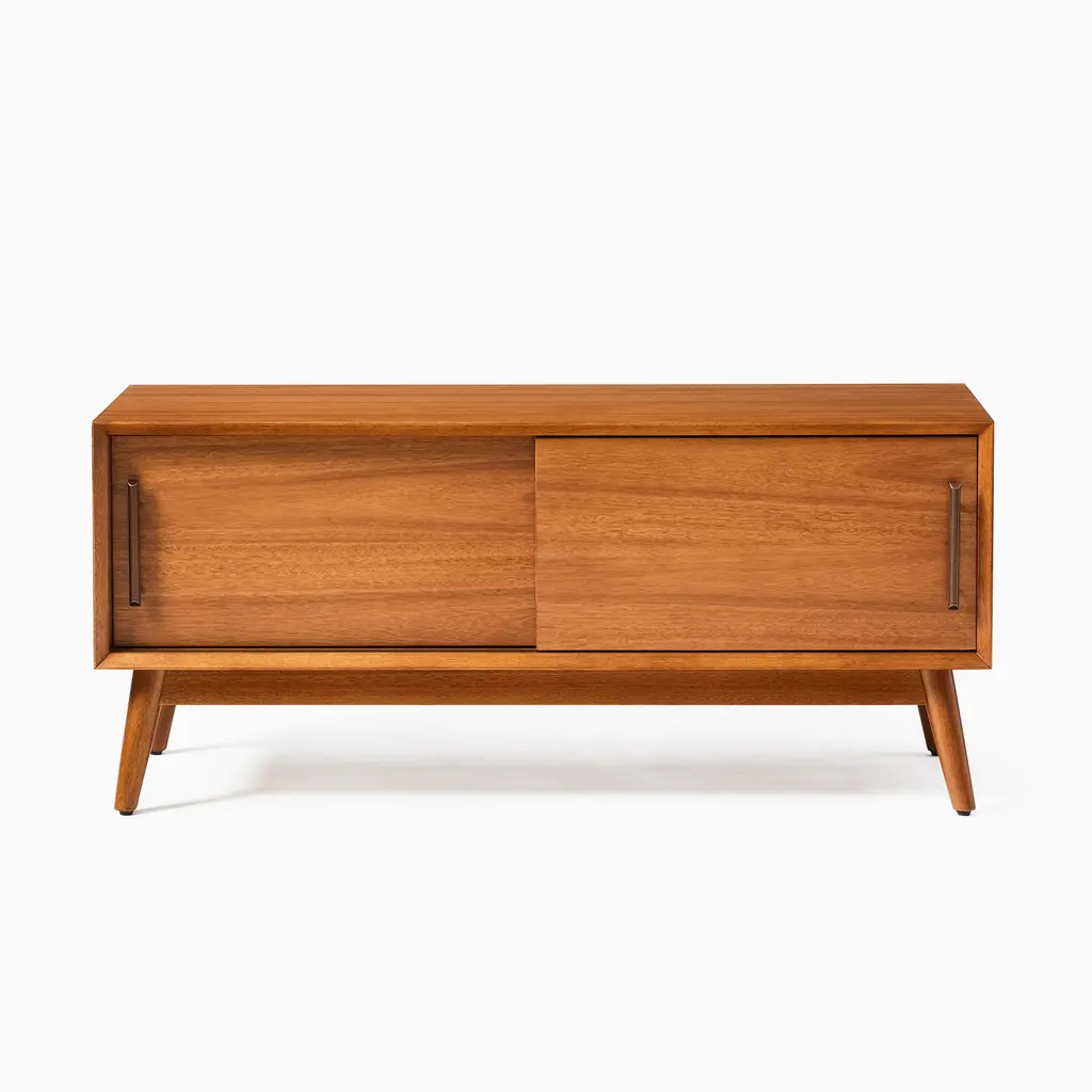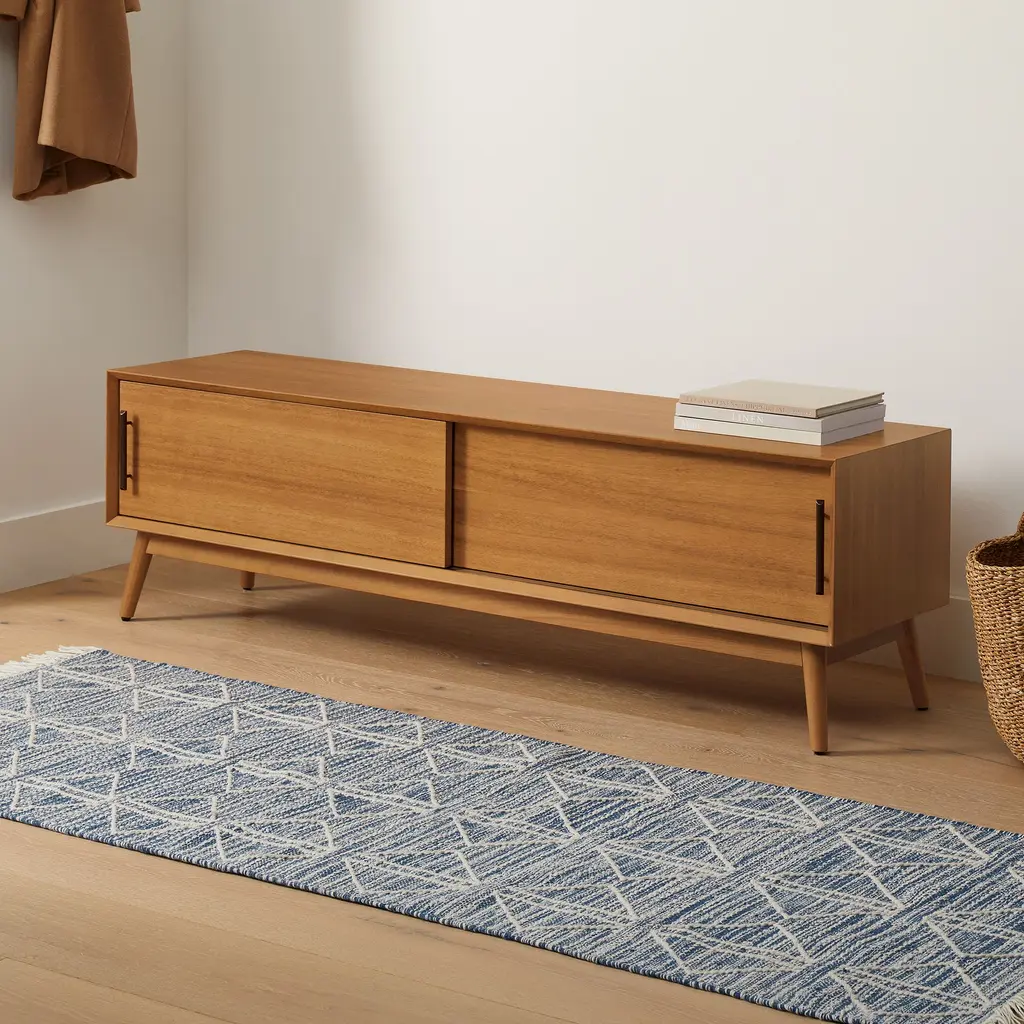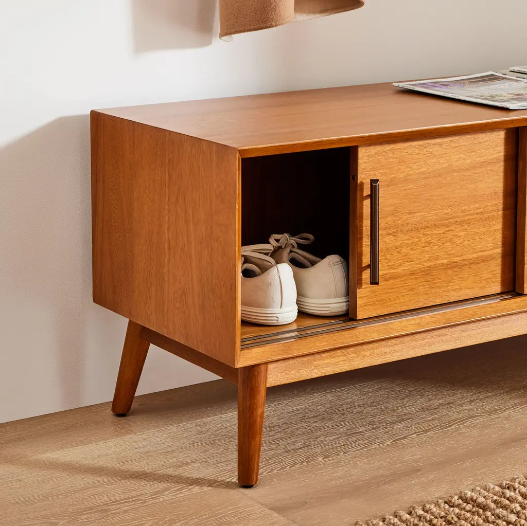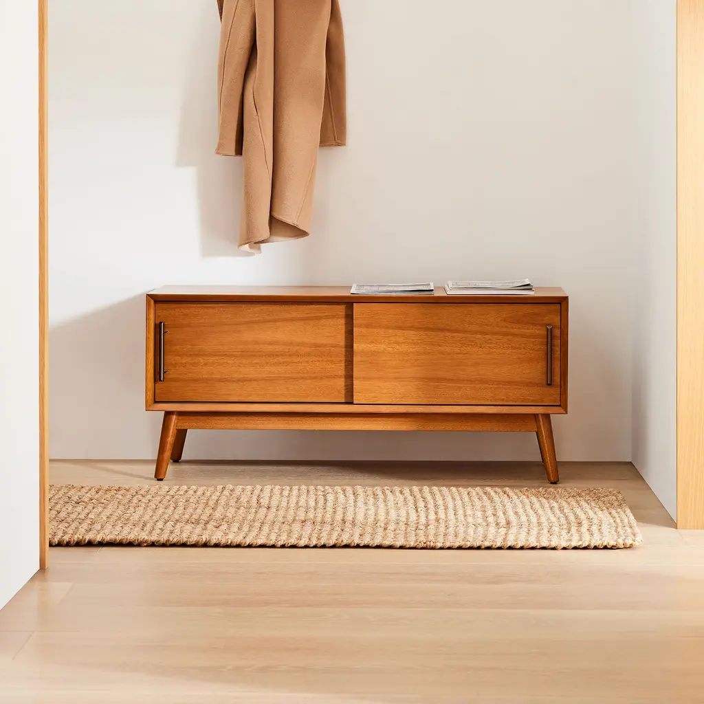 It adds retro-inspired flair to the entryway. Two roomy cabinets provide plenty of storage space. It's made from solid sustainably sourced wood. Crafted in a Fair Trade Certified™ facility.