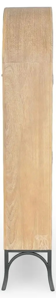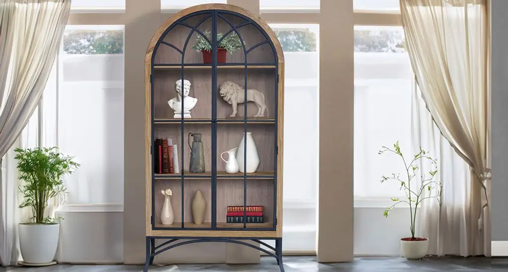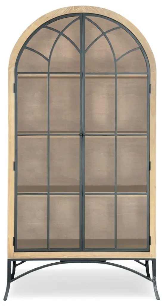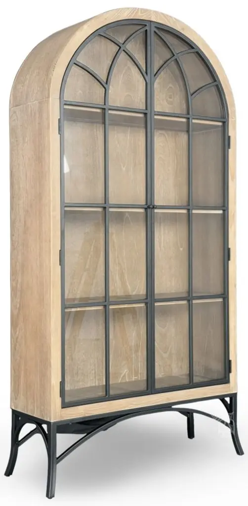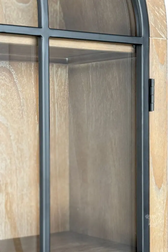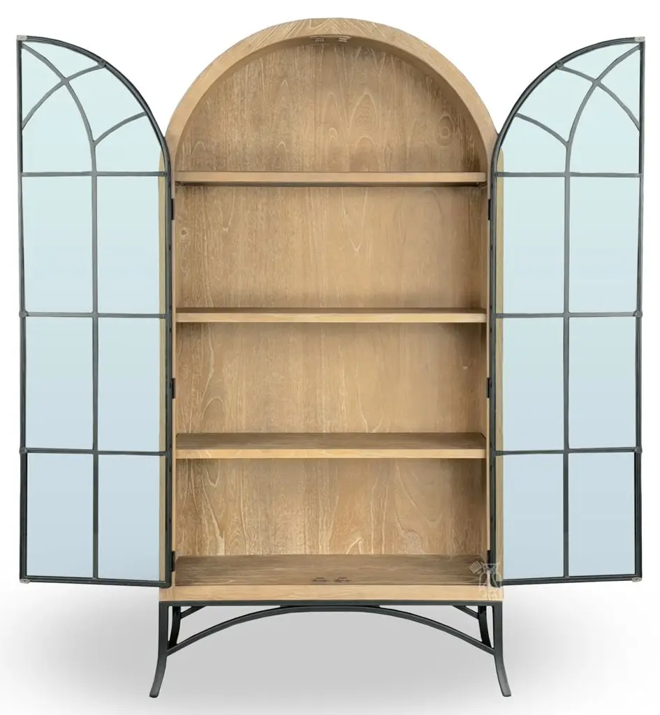 Mindi Wood Ella Arched Cabinet in Oak Grove Finish. Experience modern design and functionality with our Ella cabinets, featuring arched tops and adorned with decorative metal accents. The doors are made with tempered clear glass, and the entire metal structure is powder-coated for durability and beauty. Elevate your space with this perfect blend of style and practicality. Fully assembled. Manufacturer: Sunny Designs.