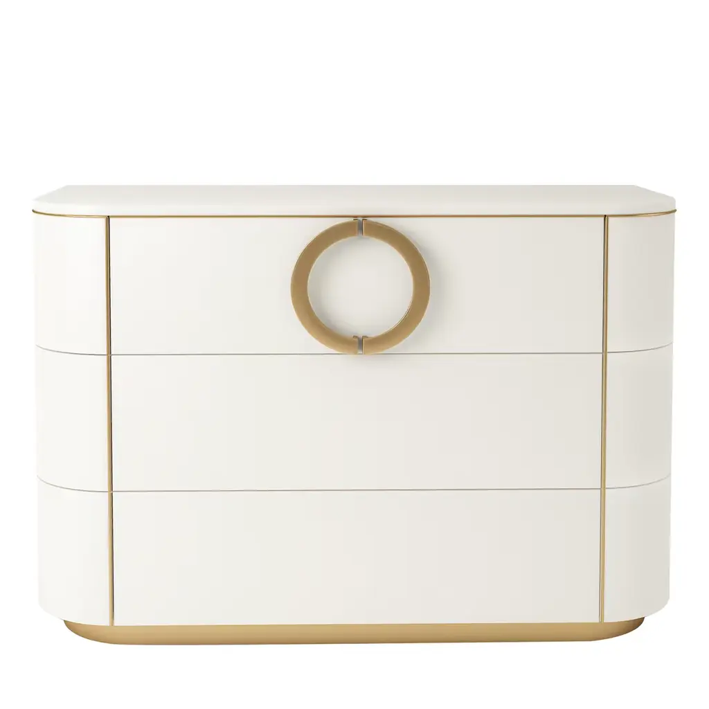 35"H X 48.5"W X 20"D The case in quartered ash veneer is finished in beluga and sits on a steel base in a natural gold finish. The decorative cast handles in gold have a wash of pearlized acrylic resin. Soft-closing hinges are fitted throughout, and a single adjustable shelf completes the interior.