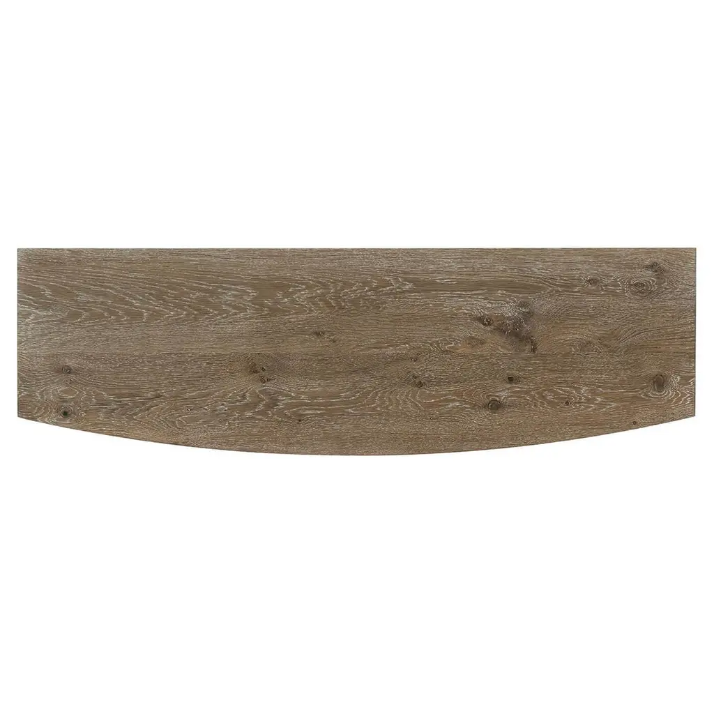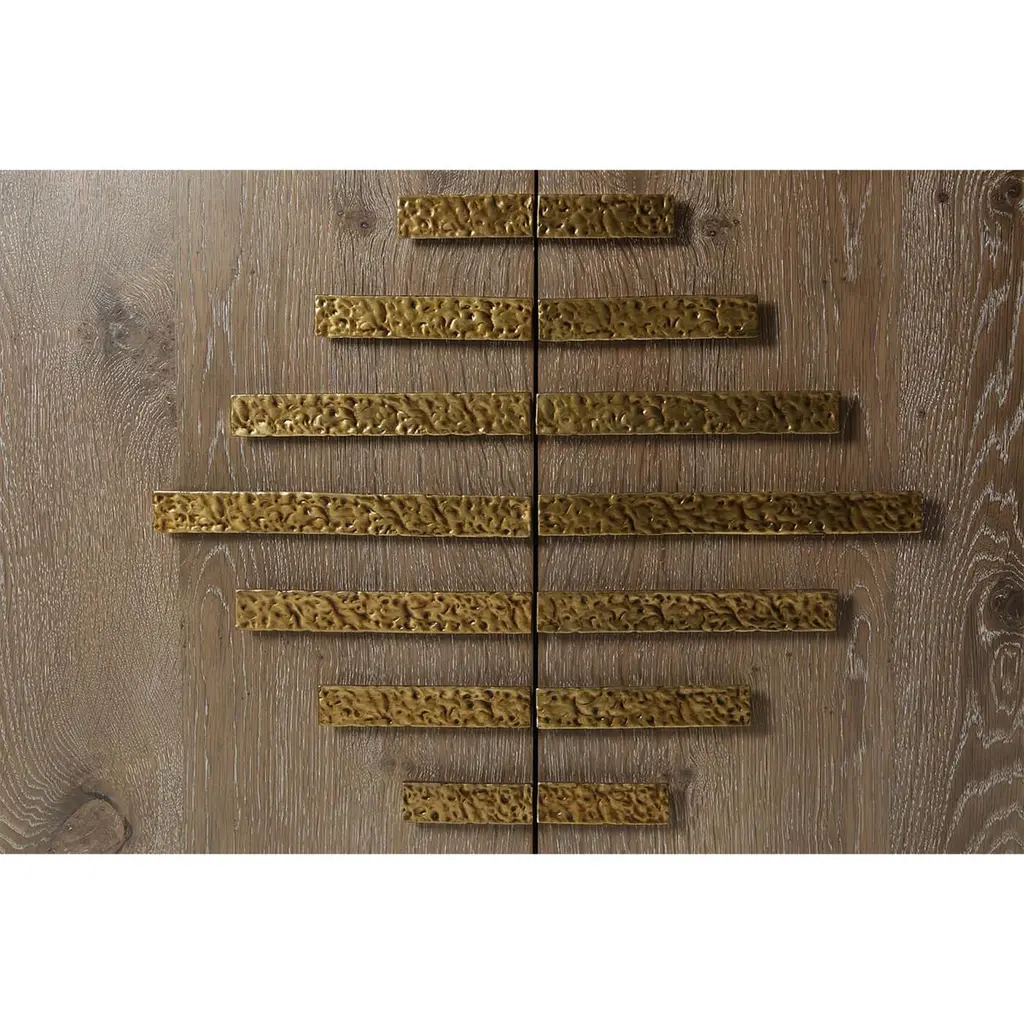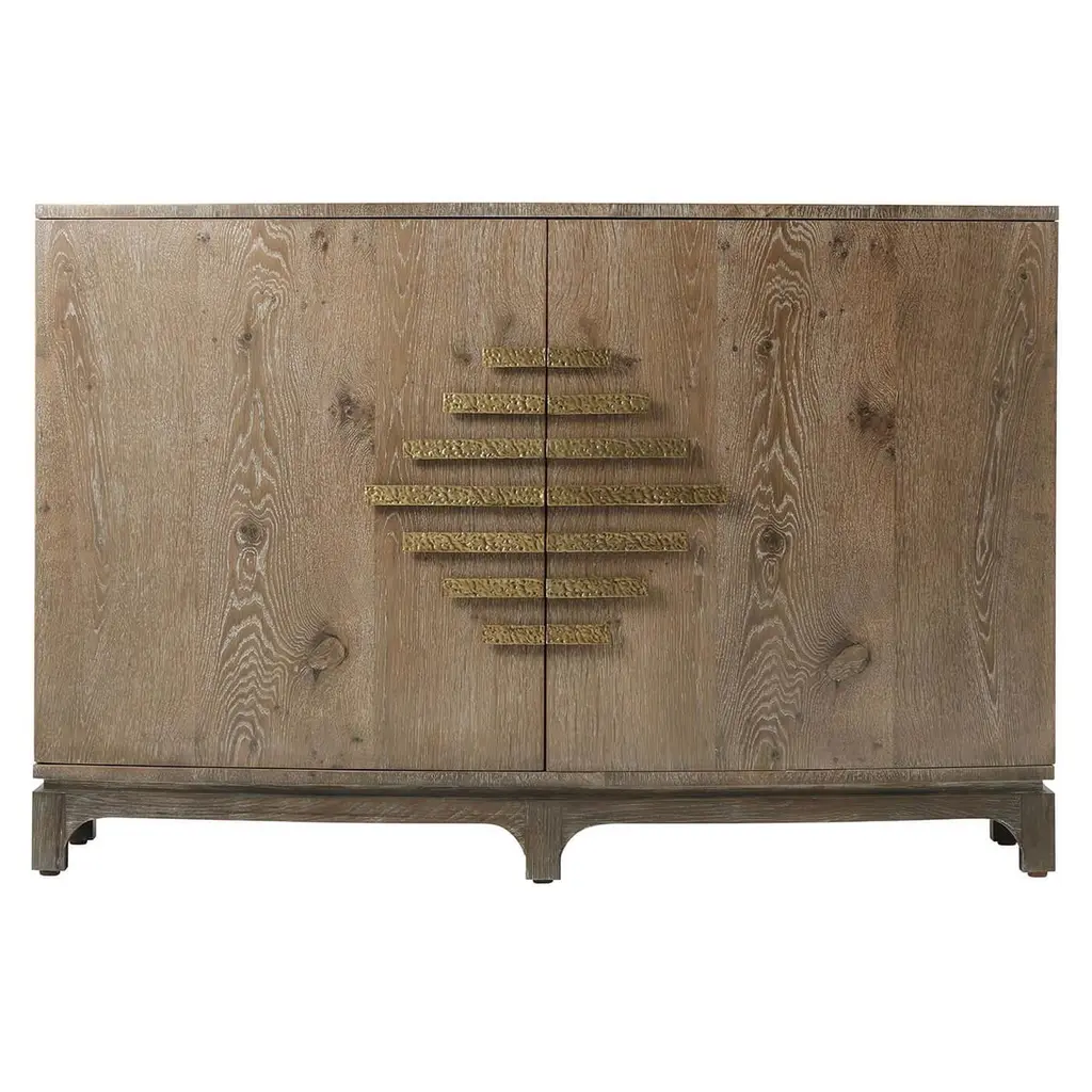 A modern aged oak veneered bowfront two-door cabinet with the Cloudy Bay Finish, with textured brass finish handles and a two-section grey lacquered interior with adjustable shelves.Dimensions: 52" W x 16" D x 34" H.