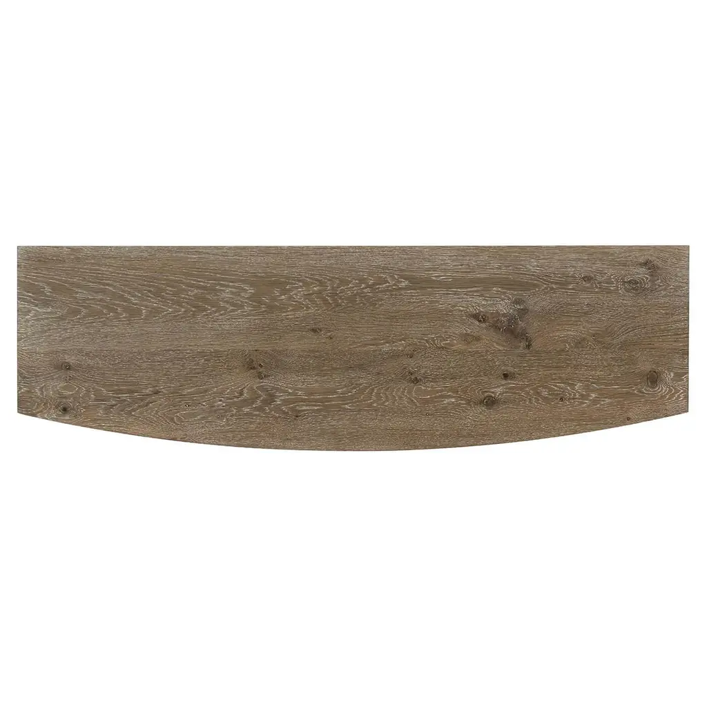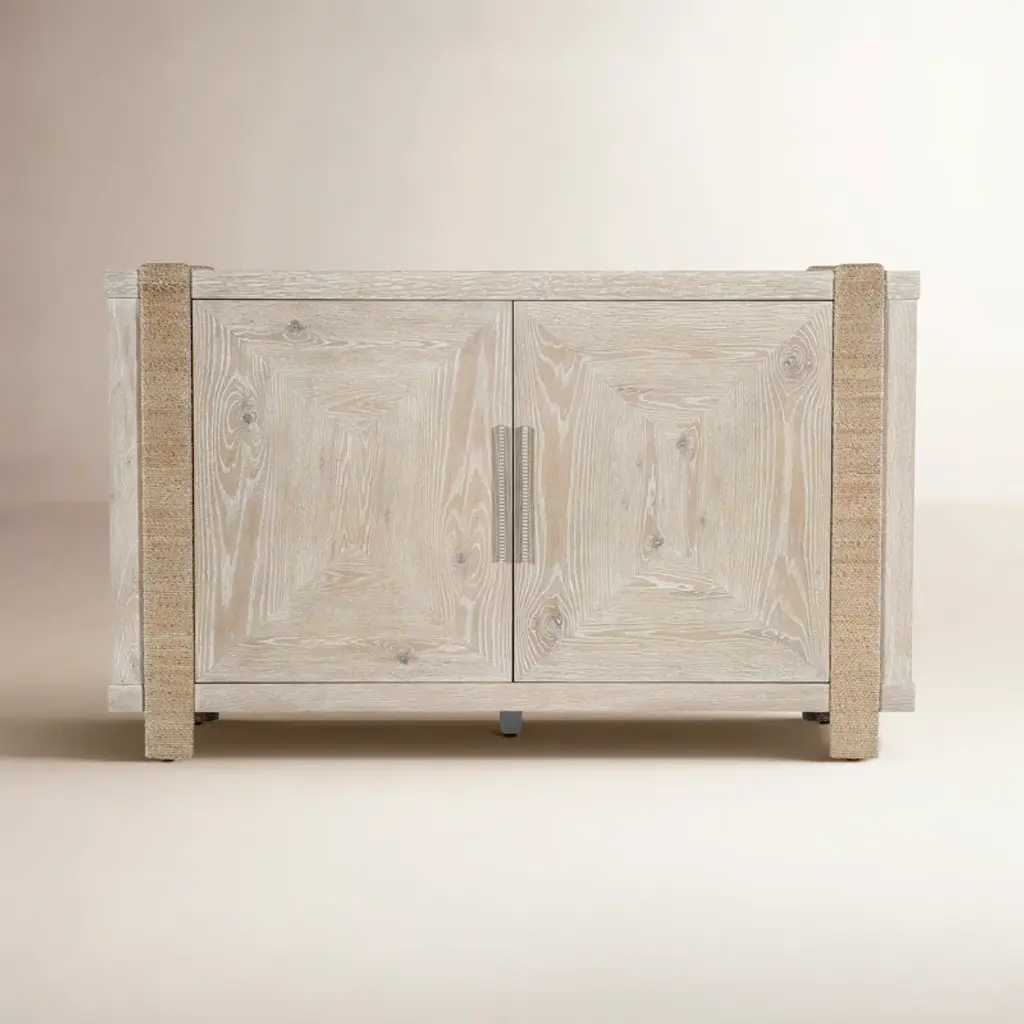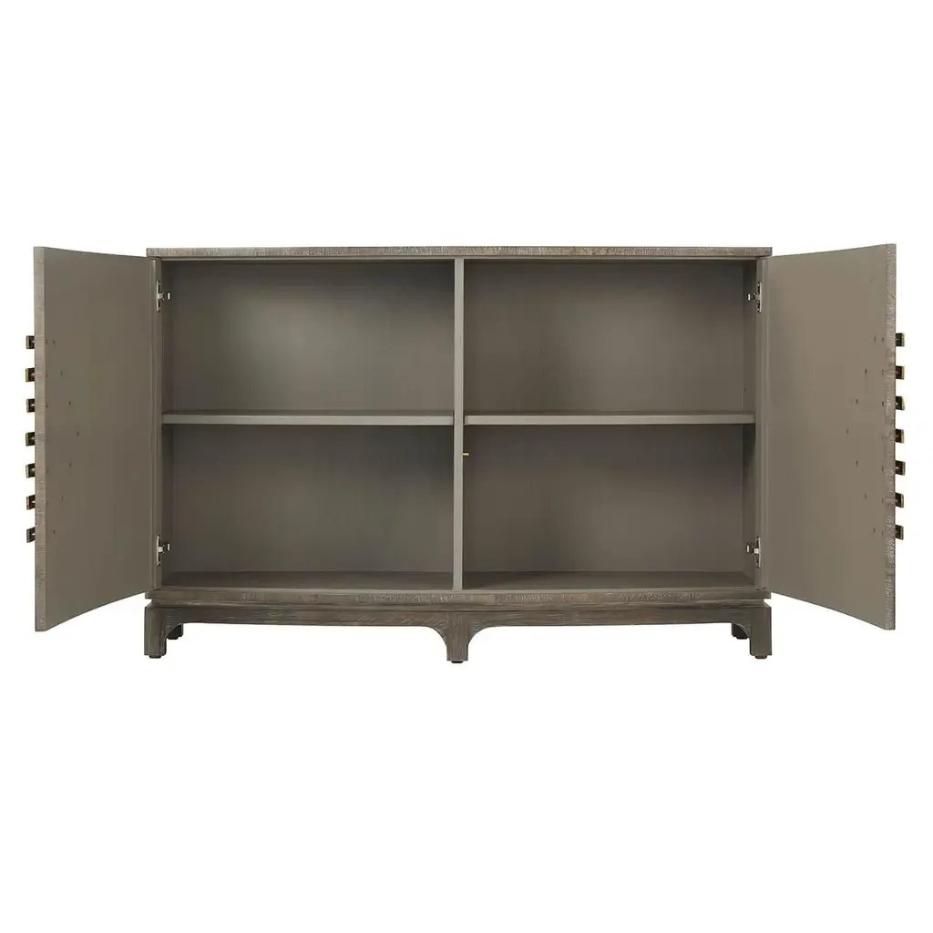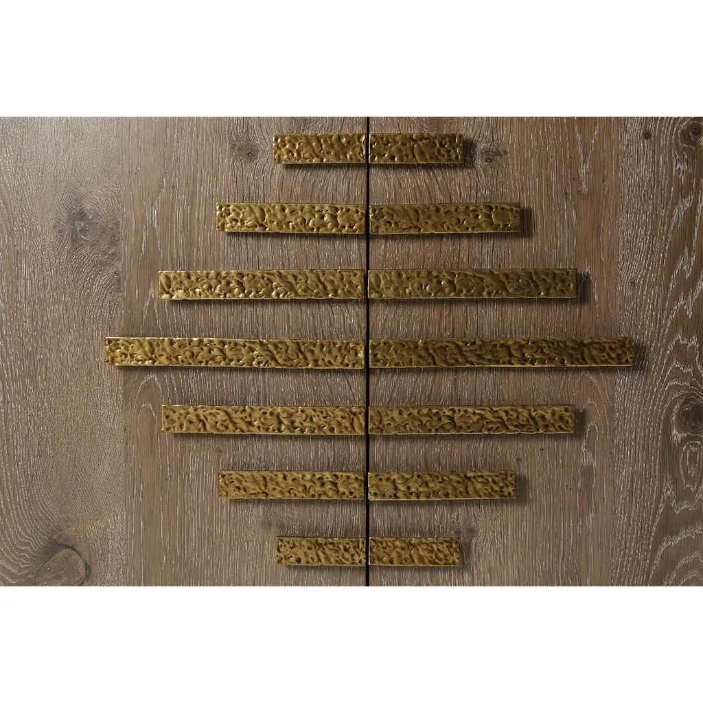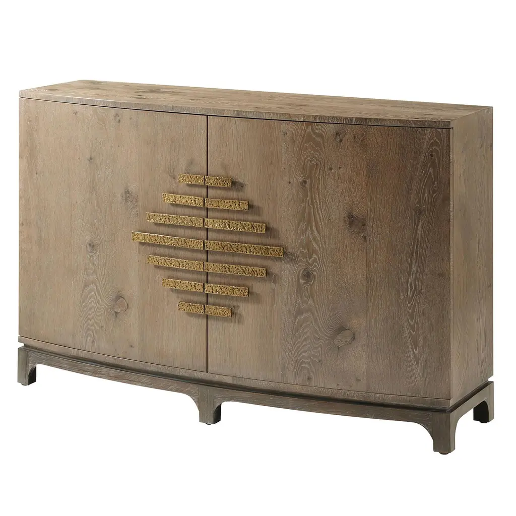A modern aged oak veneered bowfront two-door cabinet with the Cloudy Bay Finish, with textured brass finish handles and a two-section grey lacquered interior with adjustable shelves. Dimensions: 52" W x 16" D x 34" H