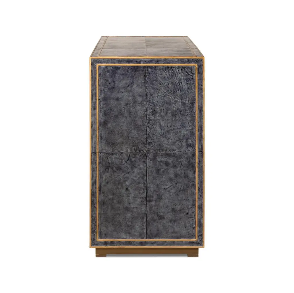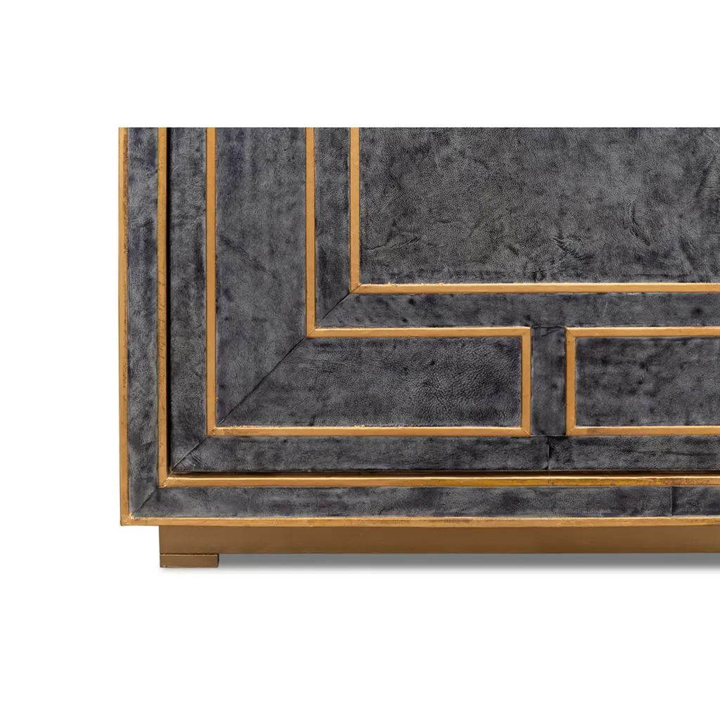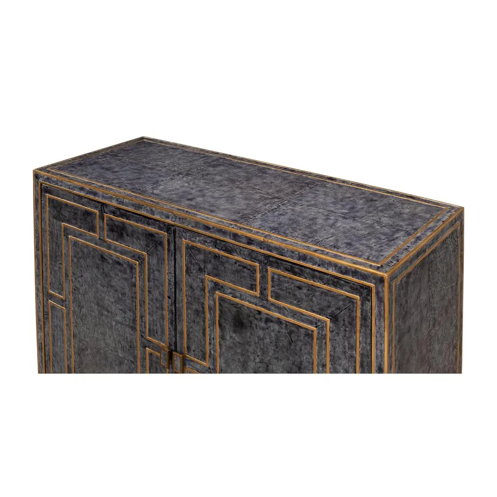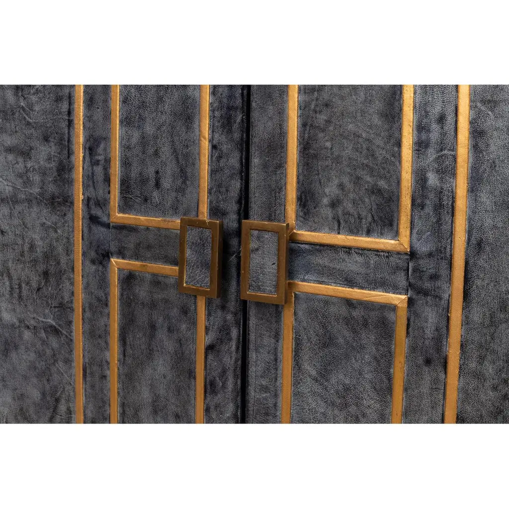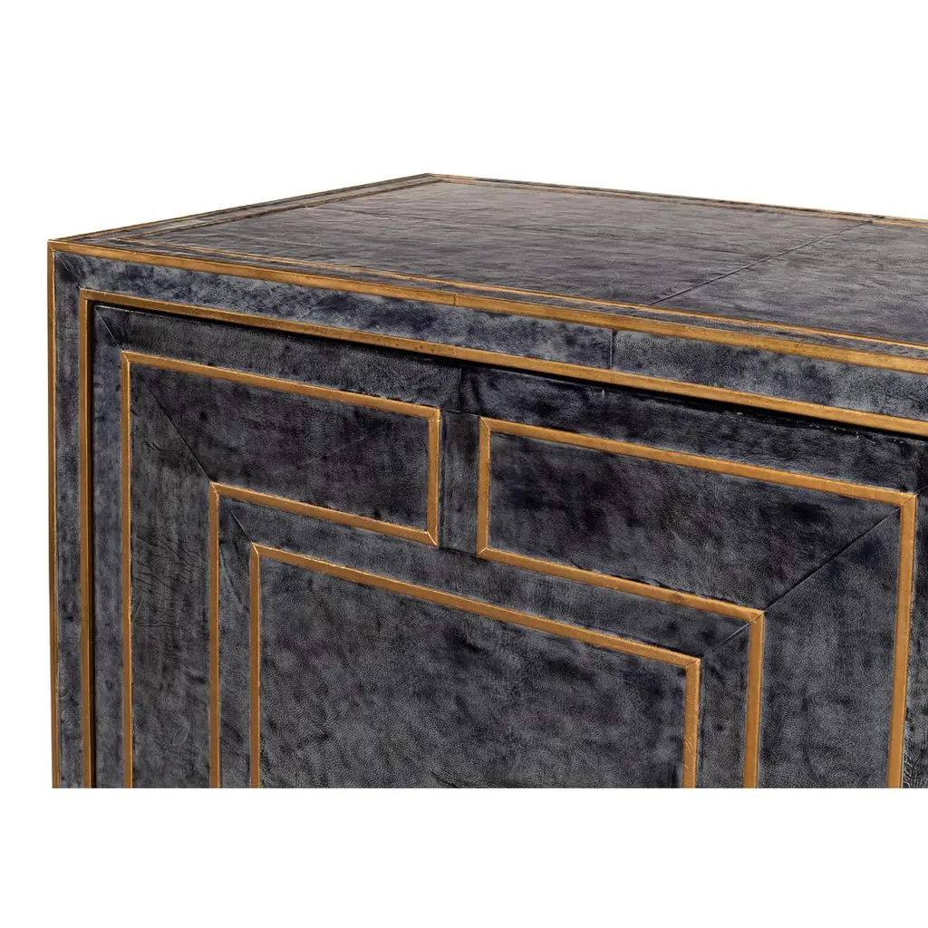 Modern leather cabinet, the two-door cabinet with gold piping in a geometric design, with a natural wood interior raised on a squared base.Dimensions: 53" W x 21" D x 37" H.