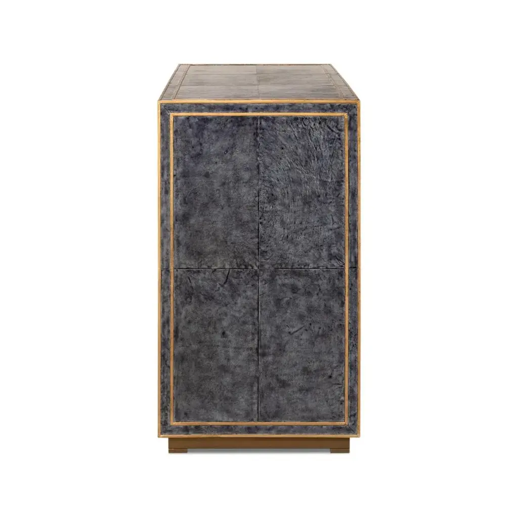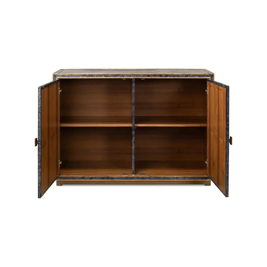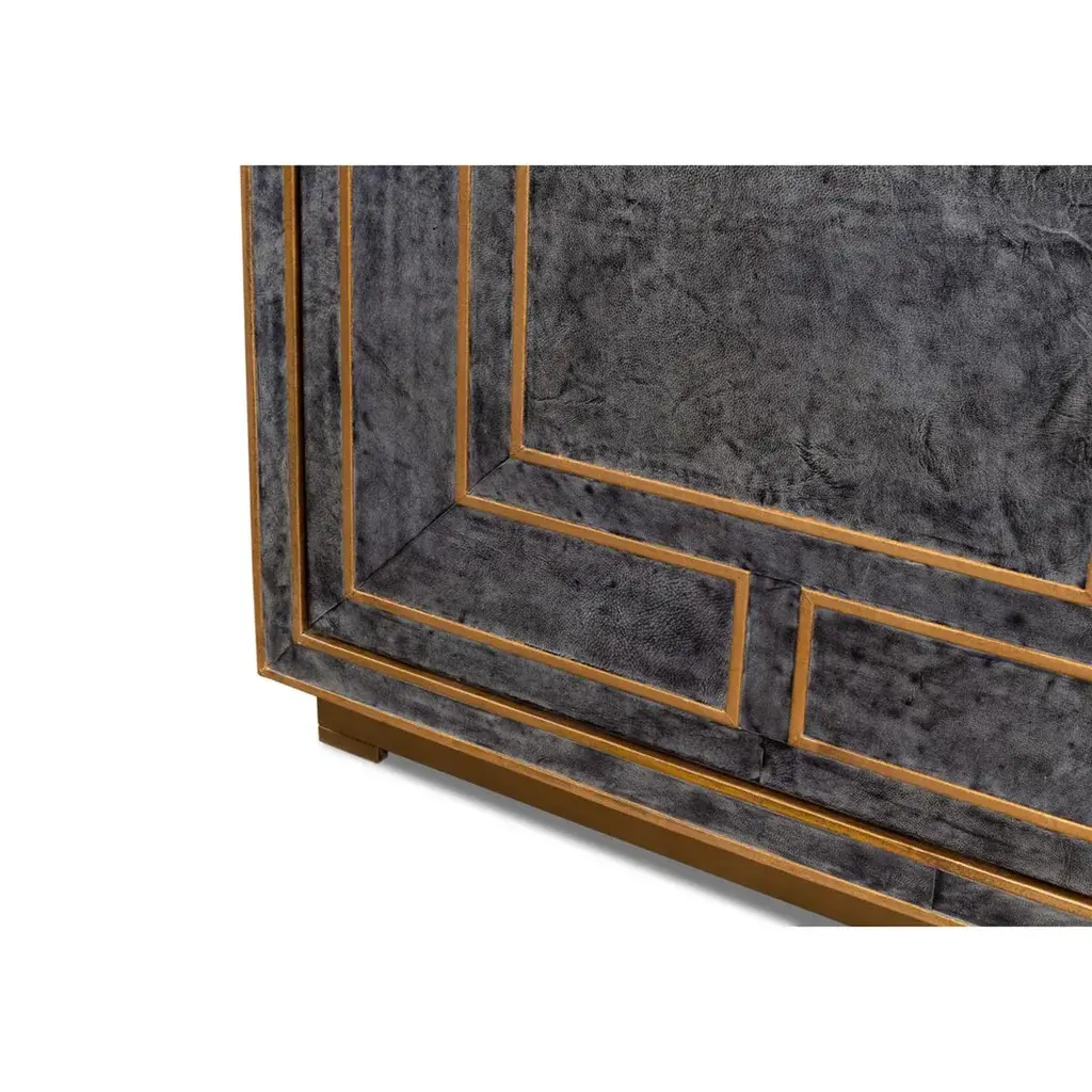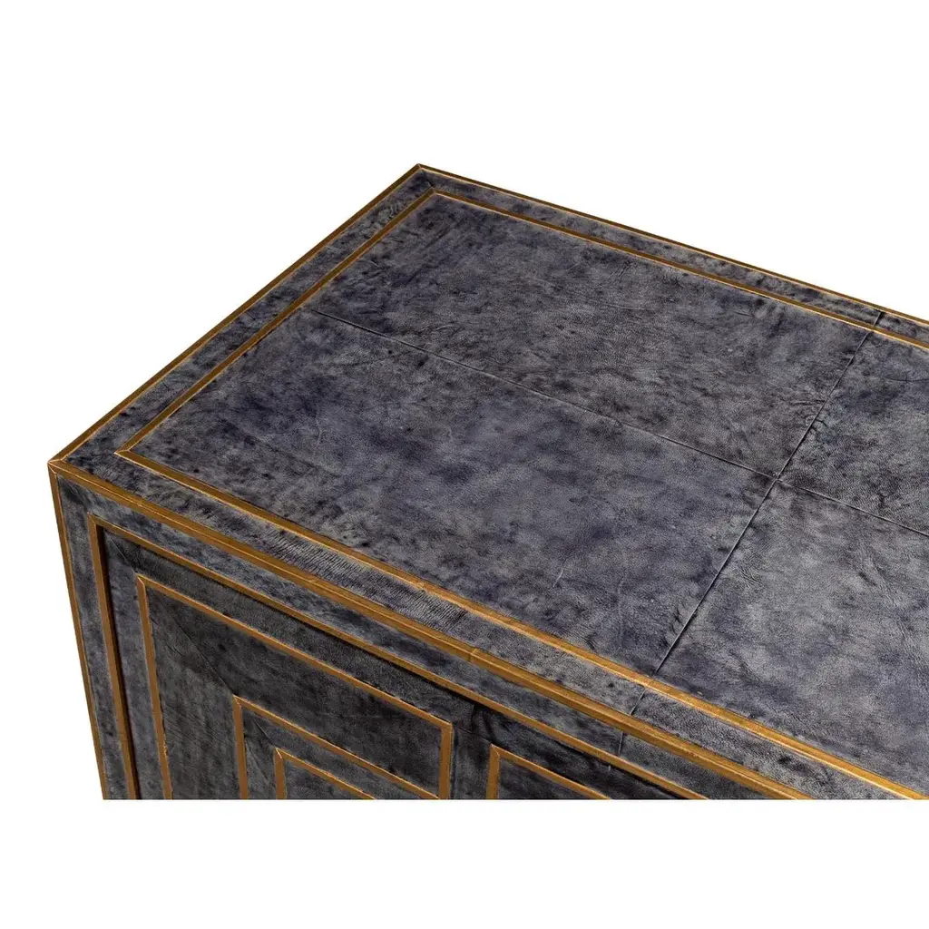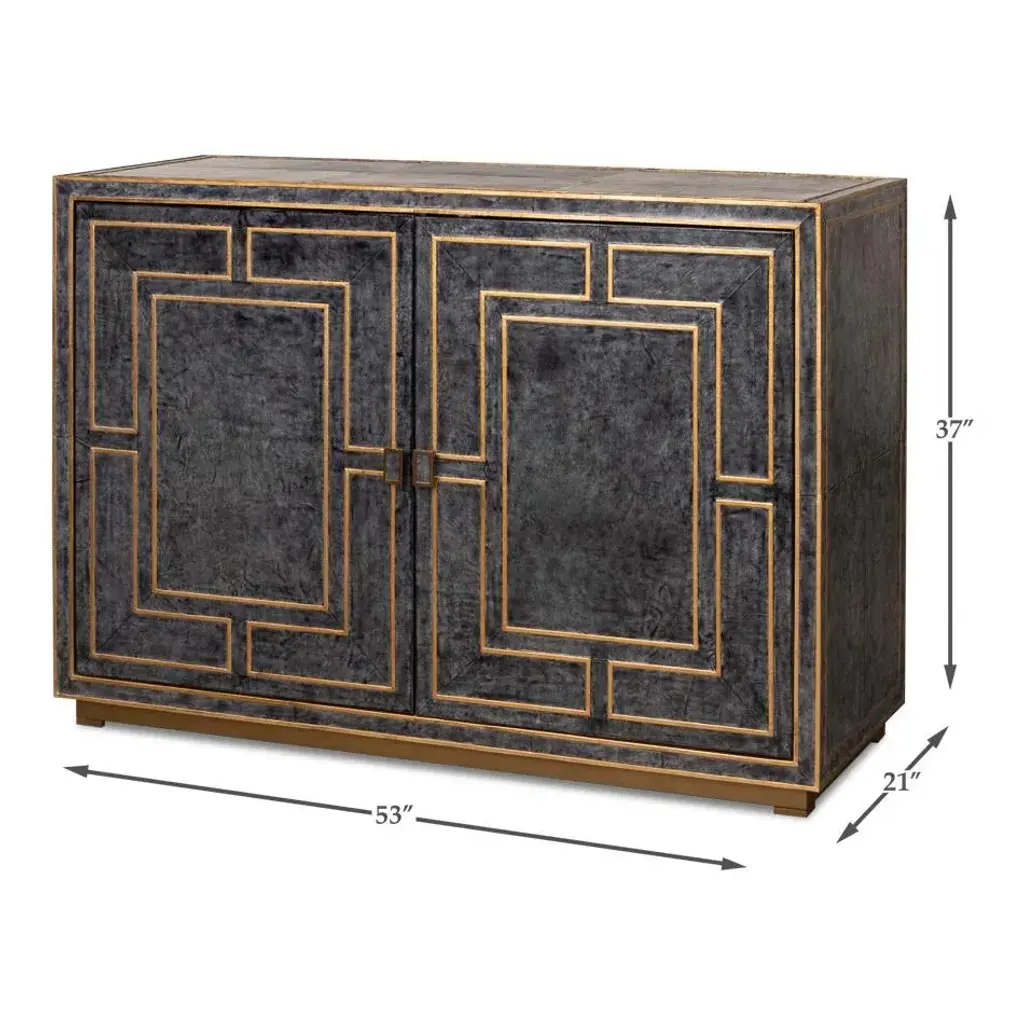 Modern Blue leather cabinet, the two-door cabinet with gold piping in a geometric design, with a natural wood interior raised on a squared base. Dimensions: 53" W x 21" D x 37" H