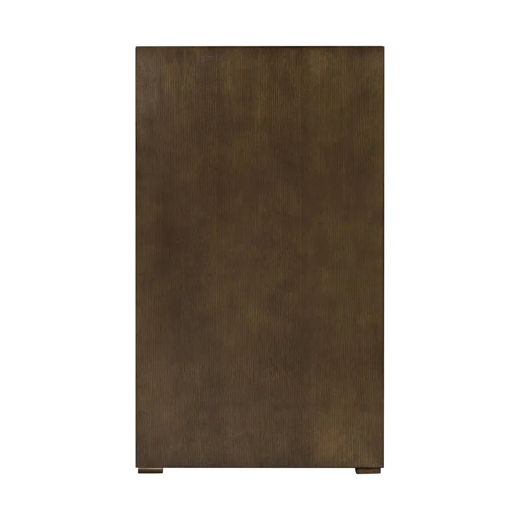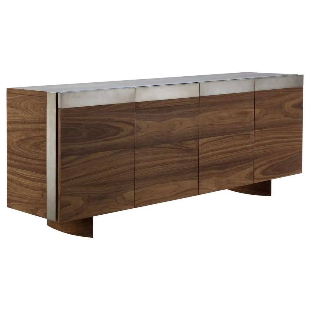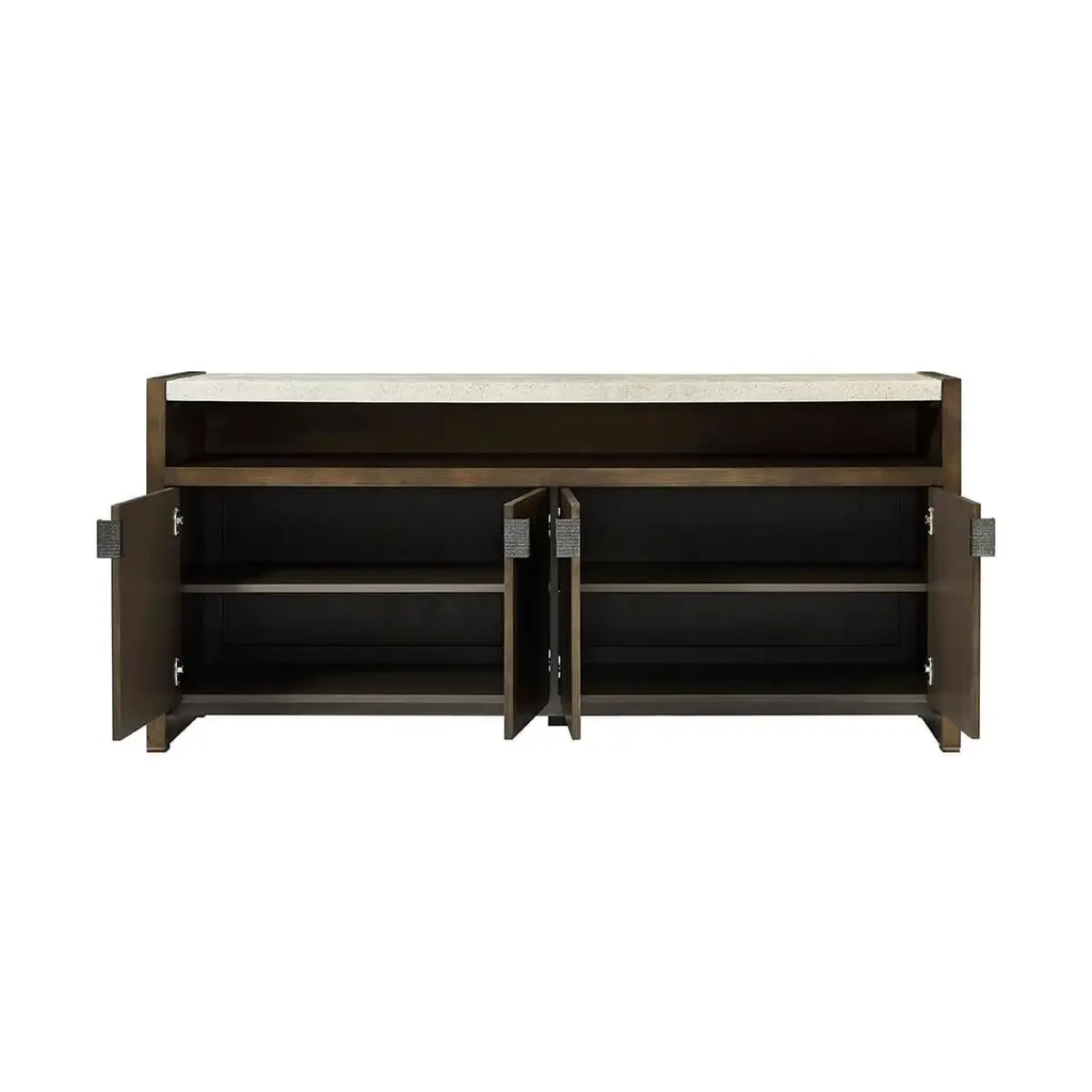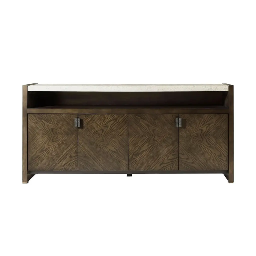 a four-door media cabinet in figured cathedral ash in an artful grain pattern in our dark earth finish. Completed with metal pulls in Ember and a top in our Mineral finish. Fitted with adjustable shelves in each cabinet.Dimensions: 70" W x 21" D x 34" H