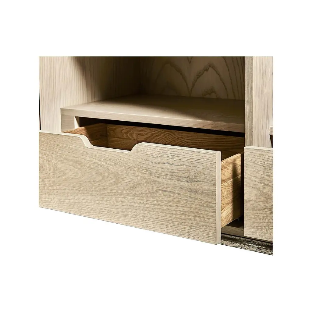 Modern etched brass flowing cabinet pairs bleached oak and metal and creates a stunning cabinet. The modern cabinet with age-old acid etched techniques on steel doors with an abstract flowing water motif in relief. Sitting atop delicate natural flared metal legs with a stretcher.The interior is fitted with a bleached oak finish and with two drawers below adjustable shelves.Dimensions: 48" W x 19 1/8" D x 35 7/8" H.