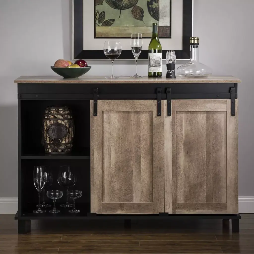 Entertain in modern industrial style with this black wine large sideboard. Crafted from MDF with paper veneer, the sideboard features a classic two-tone design and black matching natural wooden color. The hanging doors of this sideboard slide smoothly on black-finish metal hardware to reveal different shelves leaving enough storage space. TWO PERSON LIFT REQUIRED AFTER ASSEMBLED!