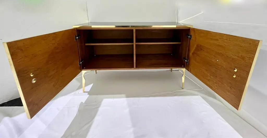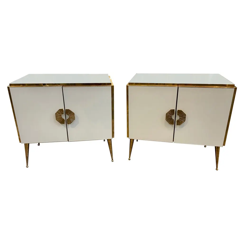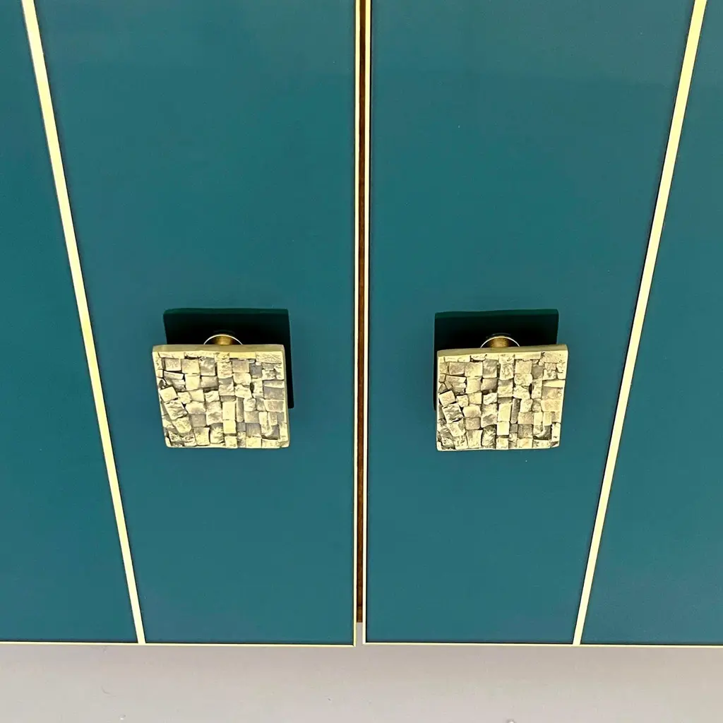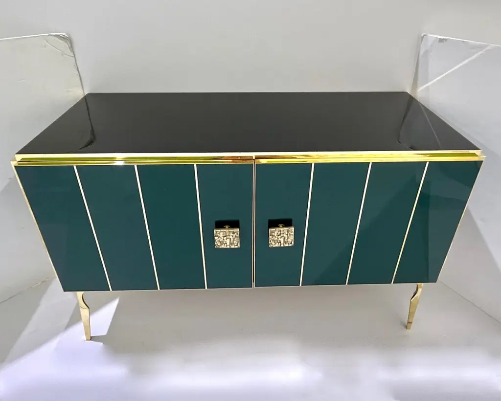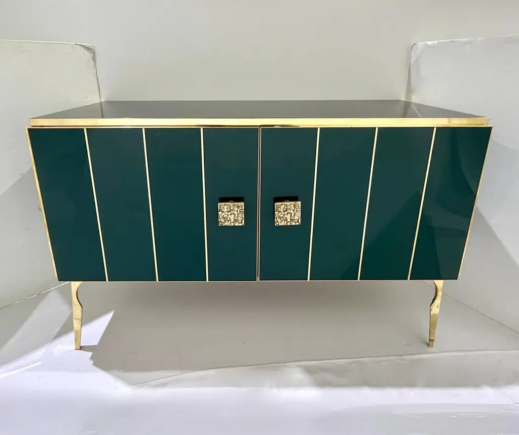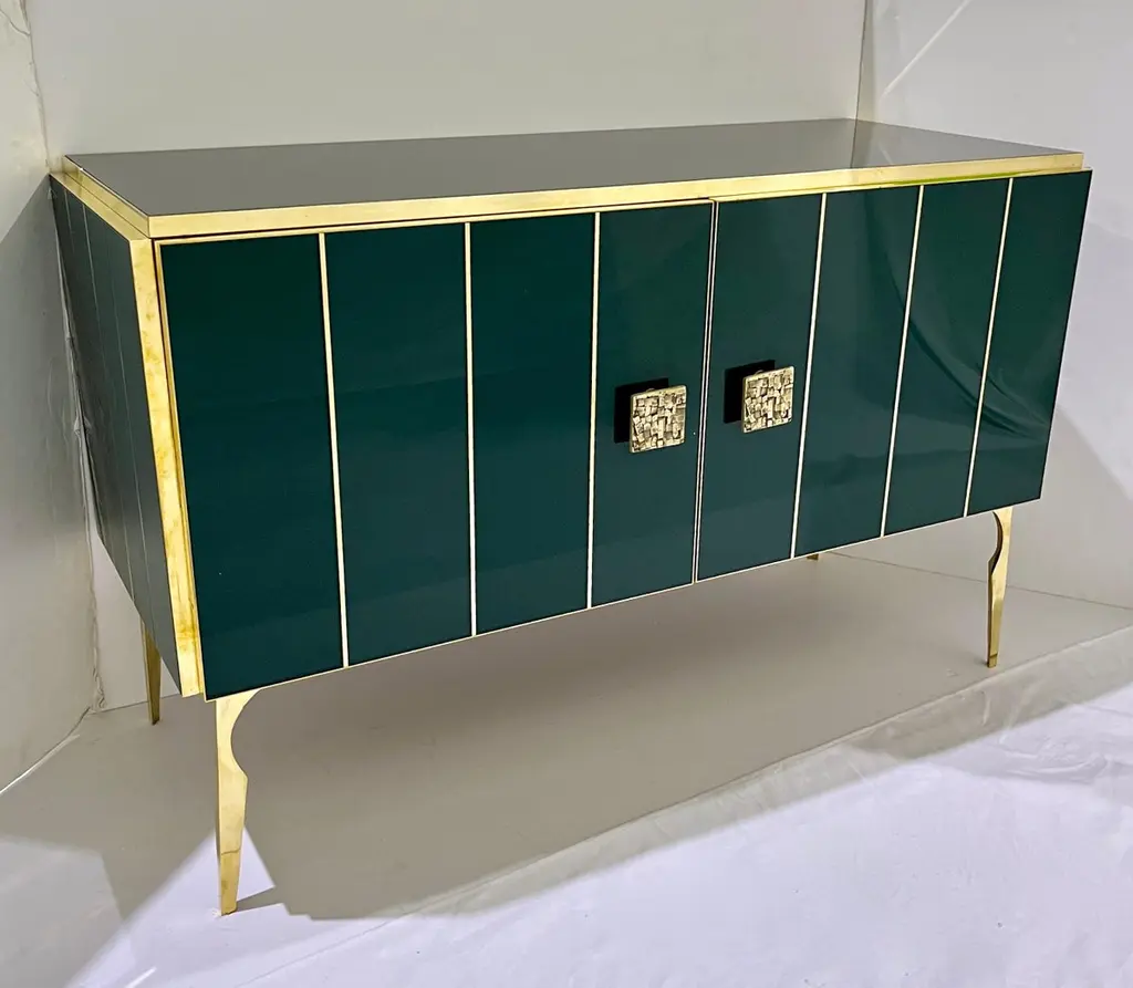Bring glamour to your interior with this bespoke customizable modern 2-door cabinet, entirely handcrafted in Italy, with a Hollywood Regency feel. The surround is decorated with art glass in a striking hunter bottle green color, striped vertically with natural brass inserts, the glass stripes creating an elegant couture effect. This credenza is raised on sexy stiletto brass legs and fitted with unique cast handles individually hand-made. High quality of execution with great attention to detail: the whole body and doors are exquisitely edged with brass profiles, veneer interior with one shelf, or can be fitted as a dry bar with a curved glass shelf to accommodate bottles.A versatile and functional design that can be personalized in finishes, in any color of the RAL classic gloss color chart, and customizable in sizes such as a sideboard, credenza, desk, or console with drawers, nightstands, the options are limitless...