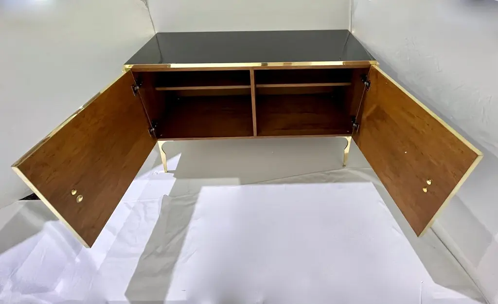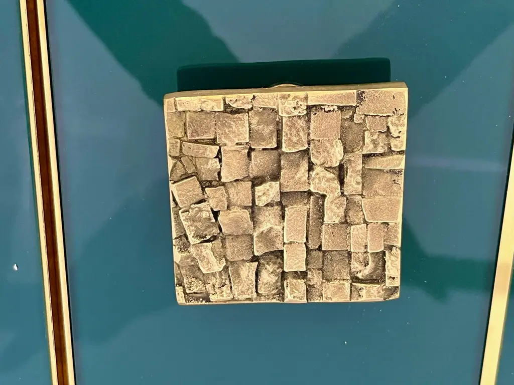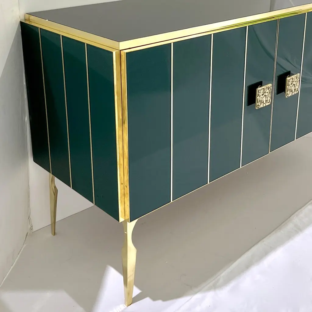 Modern Italian Custom Art Deco Style Hunter Green Black Glass Brass Cabinet /Bar