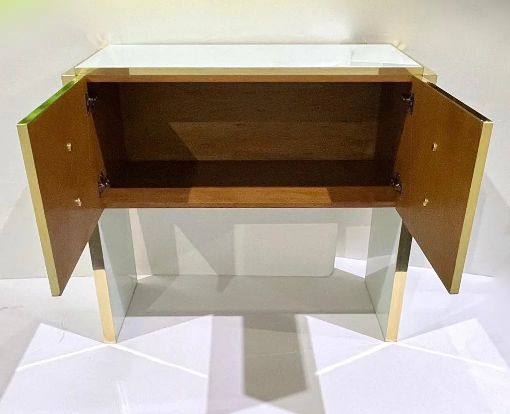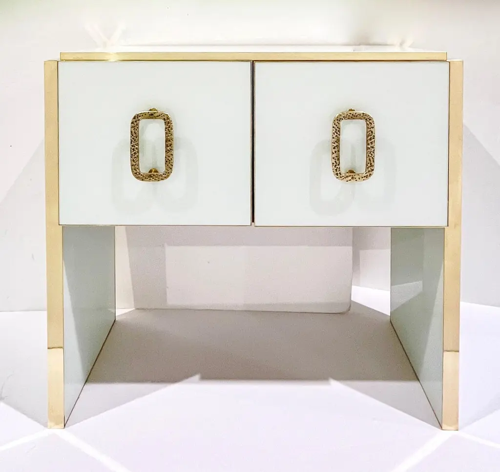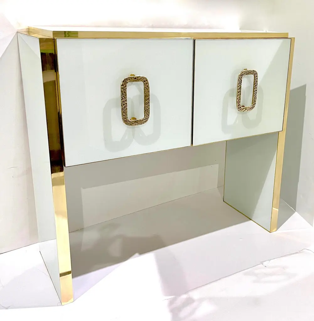 This versatile cabinet/bar is part of Cosulich Interiors & Antiques’ Contemporary Collection entirely customizable in colors, finishes, sizes, and choice of hardware. Our biggest aspiration, through this Custom Made Collection, is to communicate the power to transform hearts and minds through colors, triggering personal healthy spaces through a narrative of your own. This 2-door console / small sideboard, entirely handcrafted in Italy, with a minimalist Art Deco feeling, is decorated with art glass, hand painted on reverse, in this instance in an ivory white color. This small credenza, raised on continuous straight sides that serve as legs, is accented with hand-made stylized geometric open handles in cast brass.High quality of execution with great attention to detail with the whole body exquisitely edged with brass profiles.A versatile and functional design that can be personalized as a sideboard, credenza, chest, desk, nightstand, console... the choice is yours!