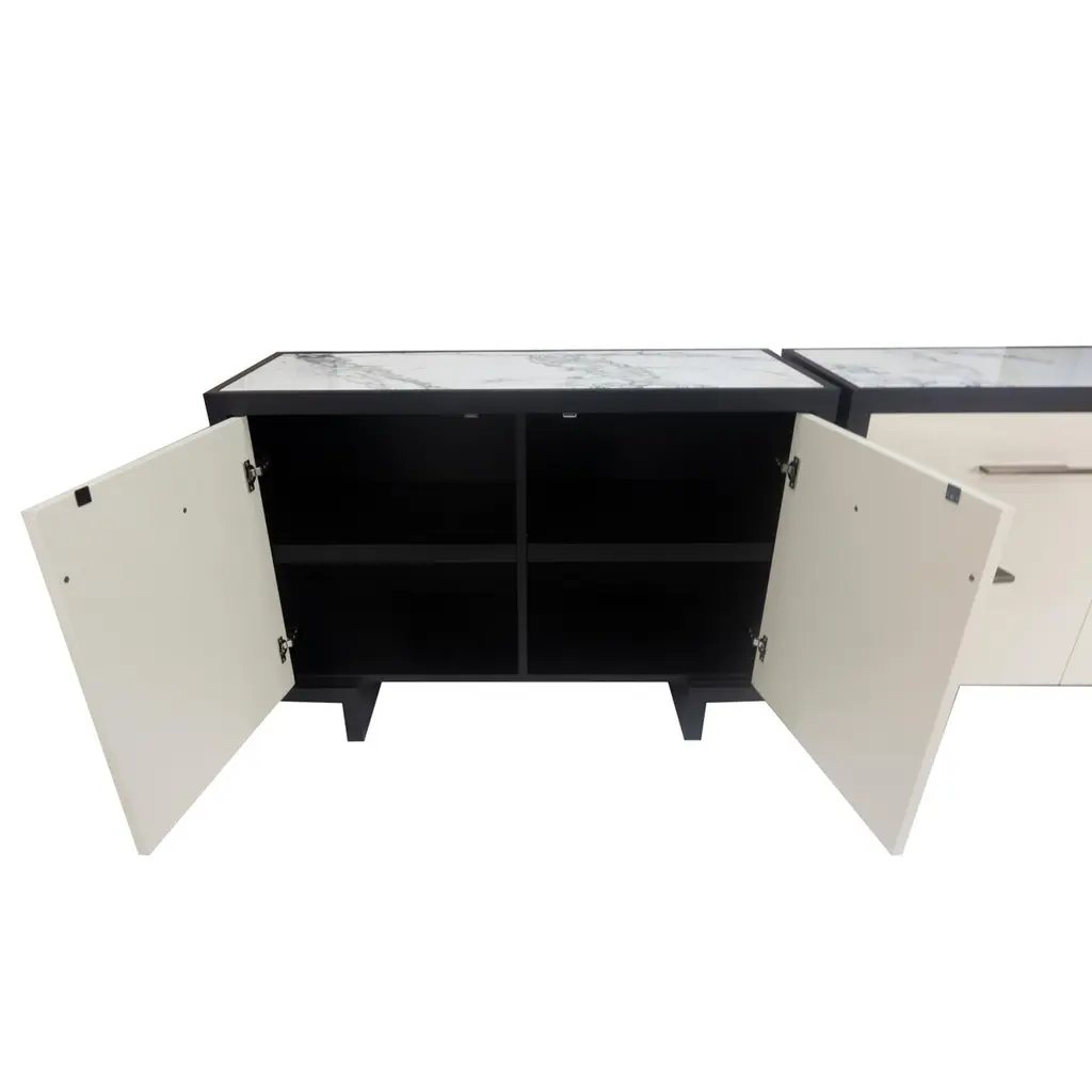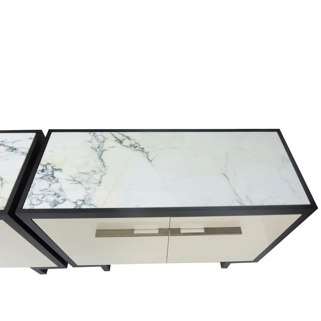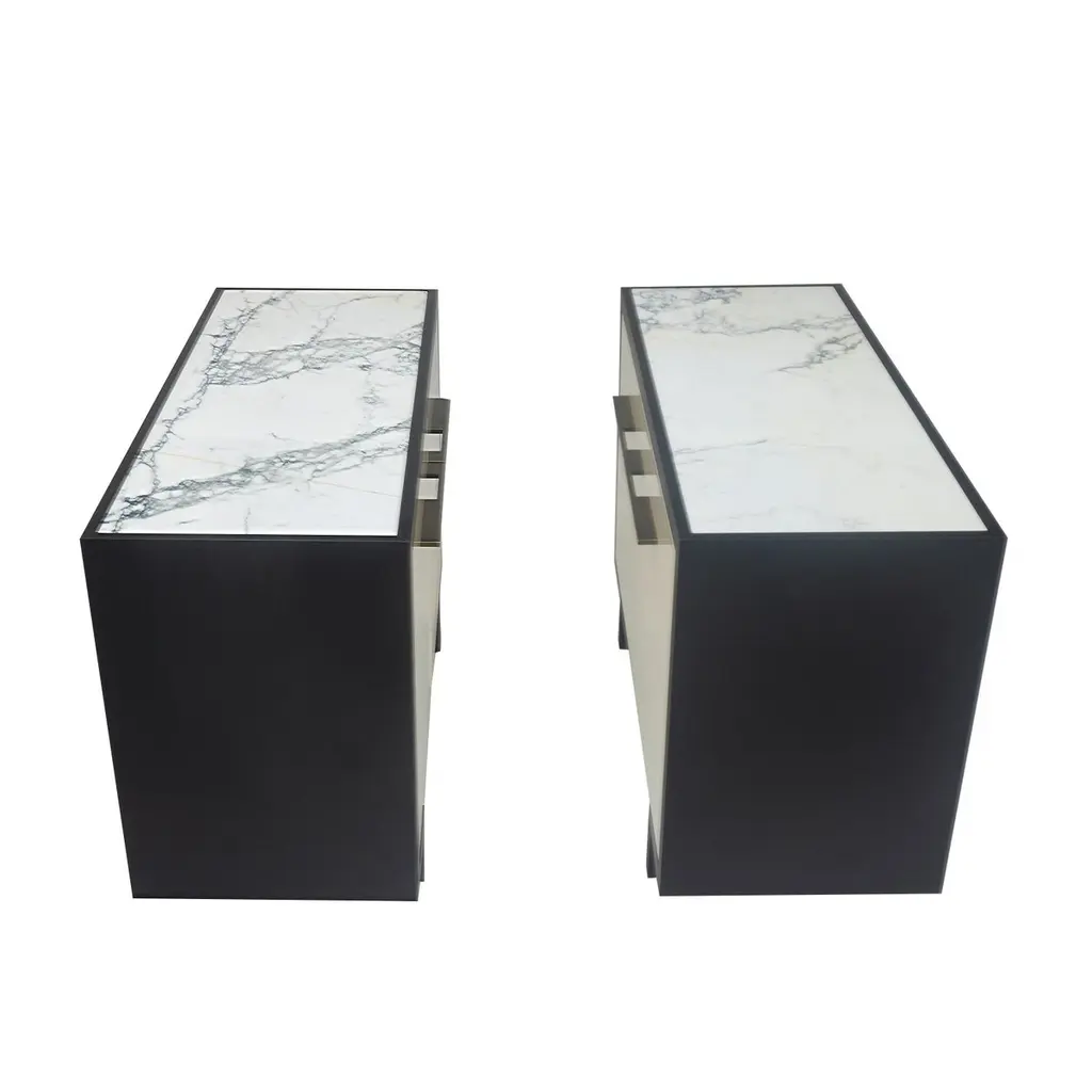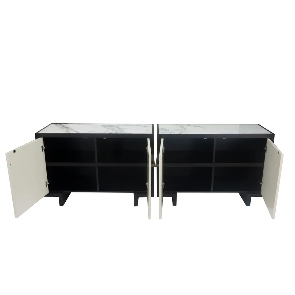 Our marble-top cabinet or side table is a modern design built for function and style. The table shown is handcrafted in a black stained maple wood frame with doors lacquered in linen white. The top features a honed Calcutta Turquoise marble inlay. Built to order with custom sizes and finishes upon request. Measurements:30” H x 44" W x 18” D.
