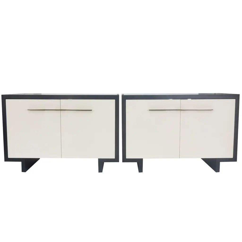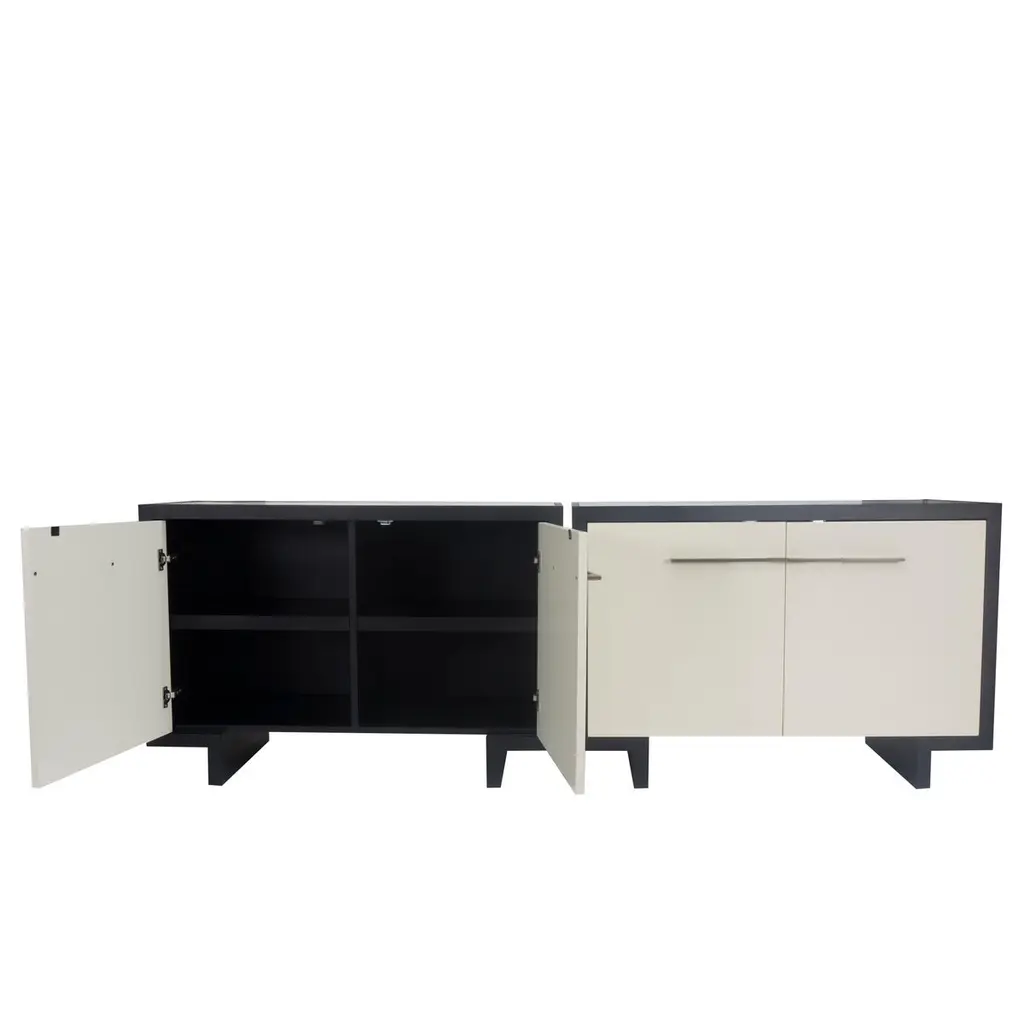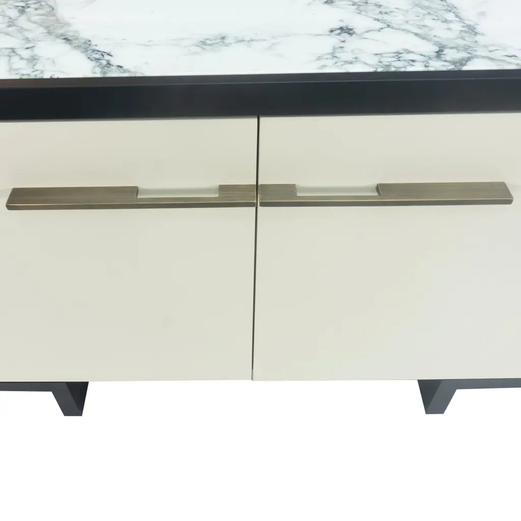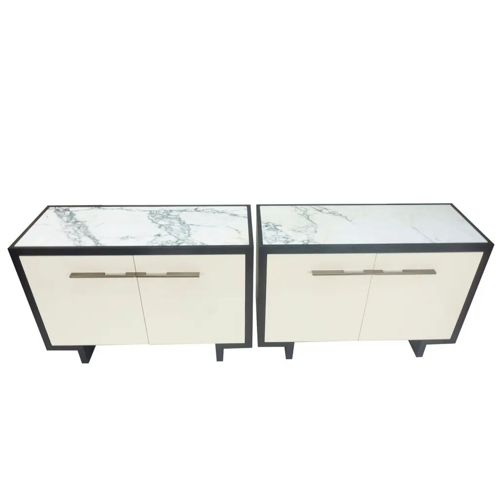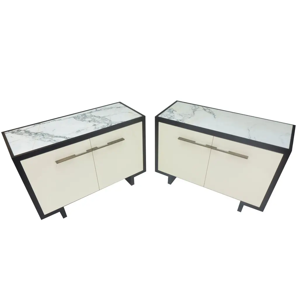 Our marble-top cabinet or side table is a modern design built for function and style. The table shown is handcrafted in a black stained maple wood frame with doors lacquered in linen white. The top features a honed Calcutta Turquoise marble inlay. Built to order with custom sizes and finishes upon request. Measurements:30” H x 44" W x 18” D.
