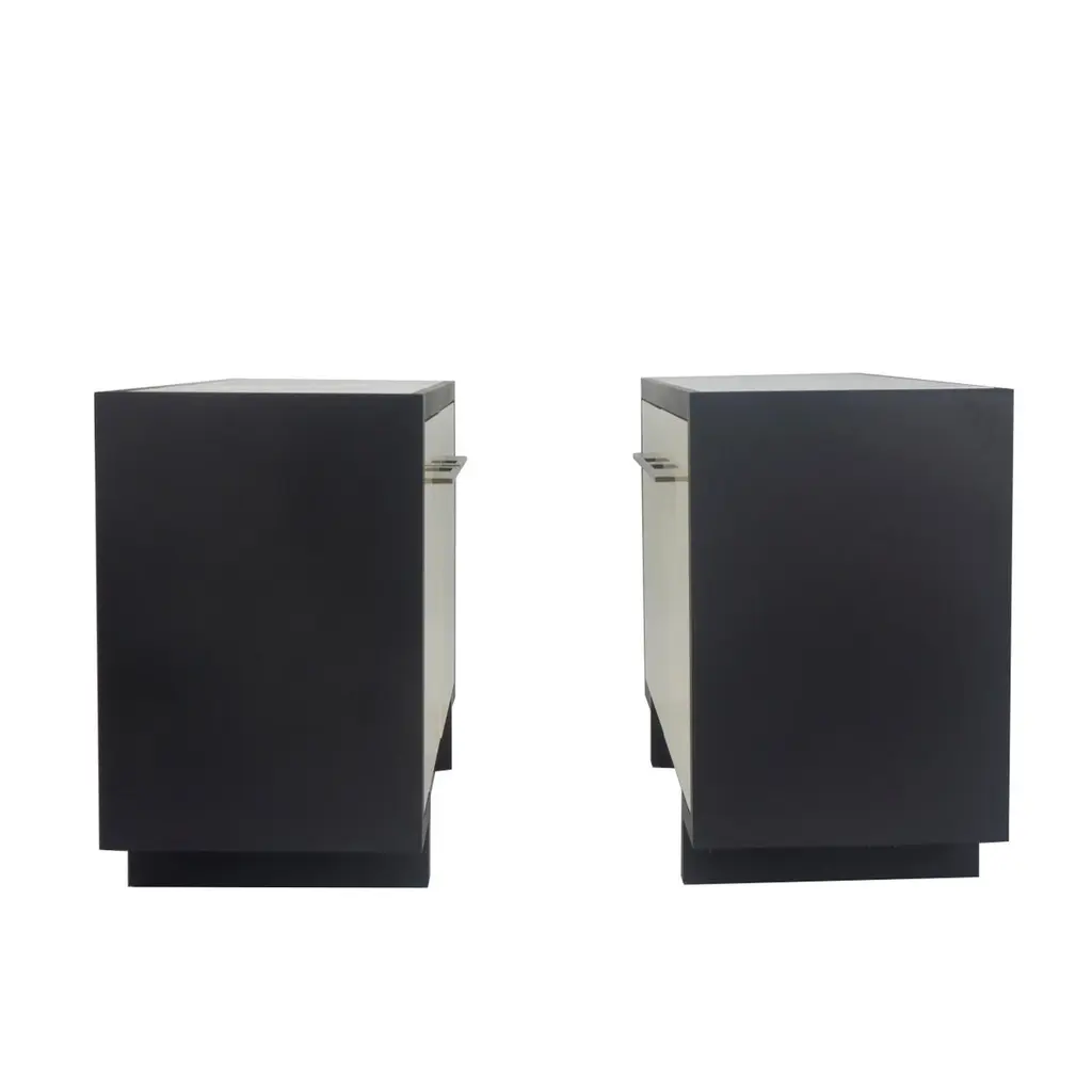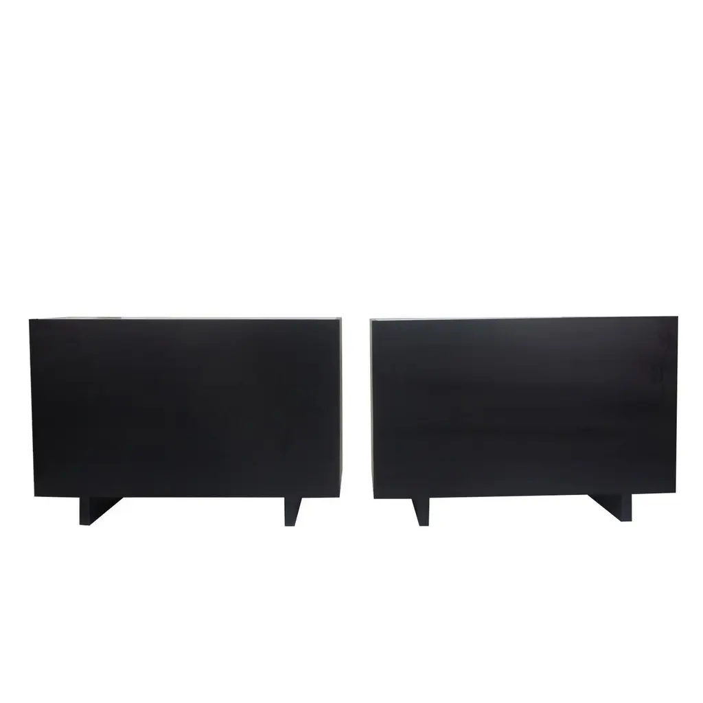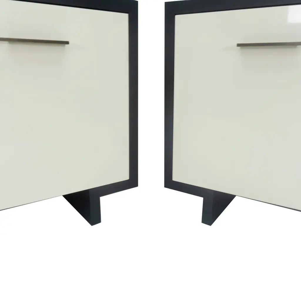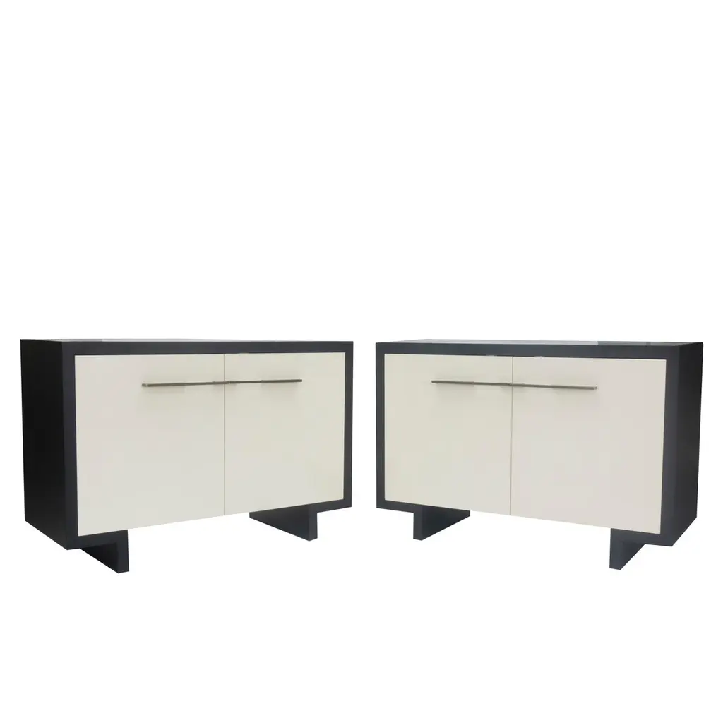 Our marble-top cabinet or side table is a modern design built for function and style. The table shown is handcrafted in a black stained maple wood frame with doors lacquered in linen white. The top features a honed Calcutta Turquoise marble inlay. Built to order with custom sizes and finishes upon request. Measurements:30” H x 44" W x 18” D.