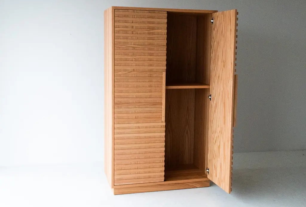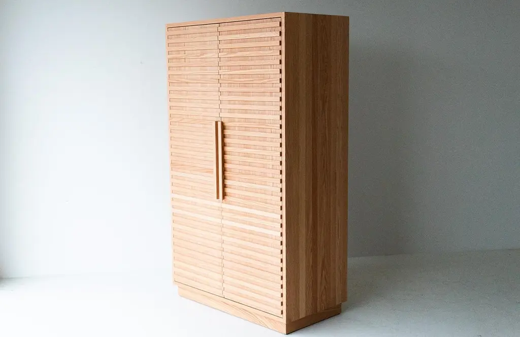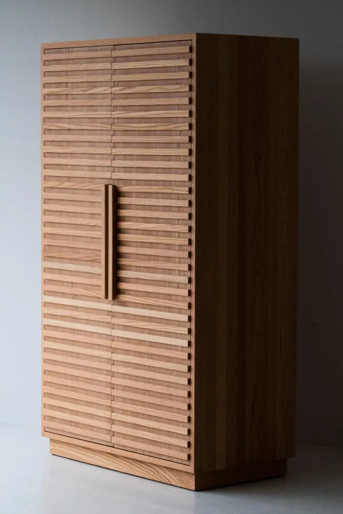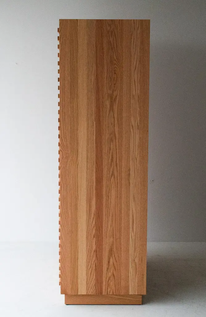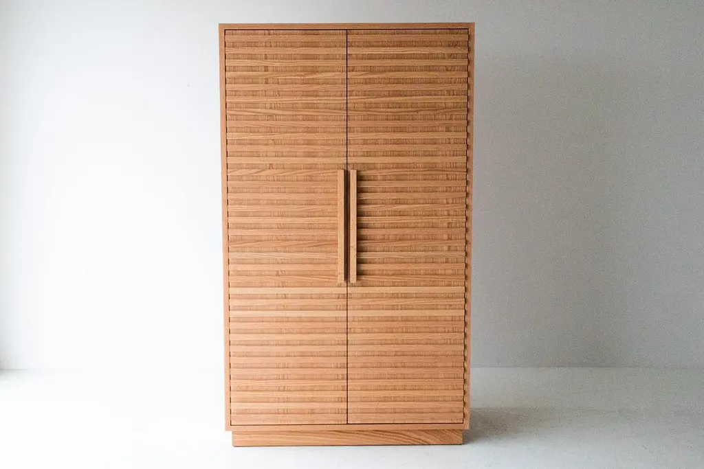 This modern oak cabinet for the Cicely collection is made in the heart of Ohio with locally sourced wood. Each cabinet is hand-made with red oak and finished with a beautiful matte commercial grade finish. It is important to us to let the natural beauty of the oak shine. The doors are finished with a beautiful solid oak slatted design across the front and veneer backs. The inside cabinet comes with 4 adjustable oak shelves for optimal storage. We absolutely love this design - fresh, modern, and looks great with any aesthetic. This is the first piece in the Cicely Collection, which will all share the beautiful slatted design.SpecsPeriod/Model: new; modernSpecs: oak, natural commercial grade finishCustomizable: Yes! It's what we do :)Dimensions H: 72"W: 42"D: 22.5".