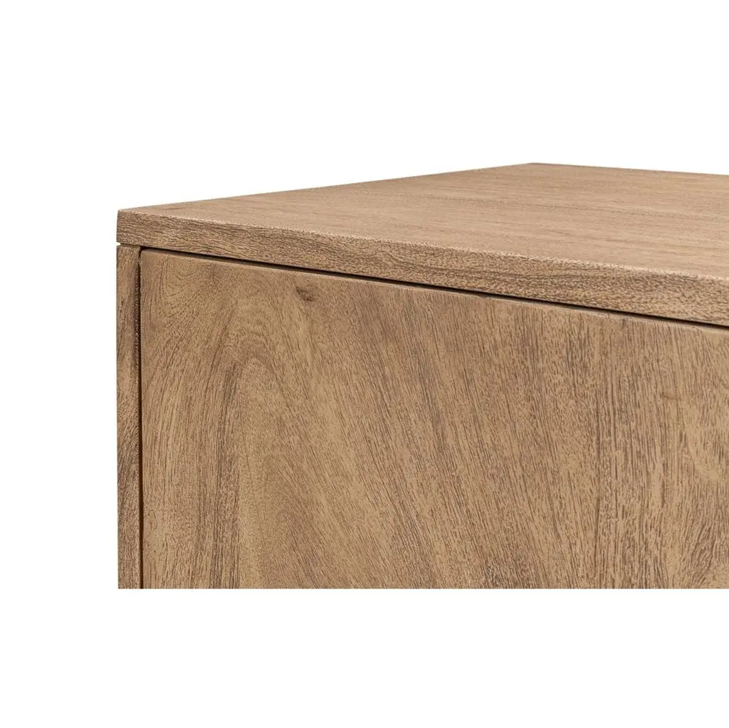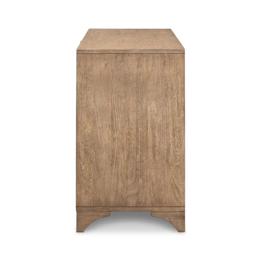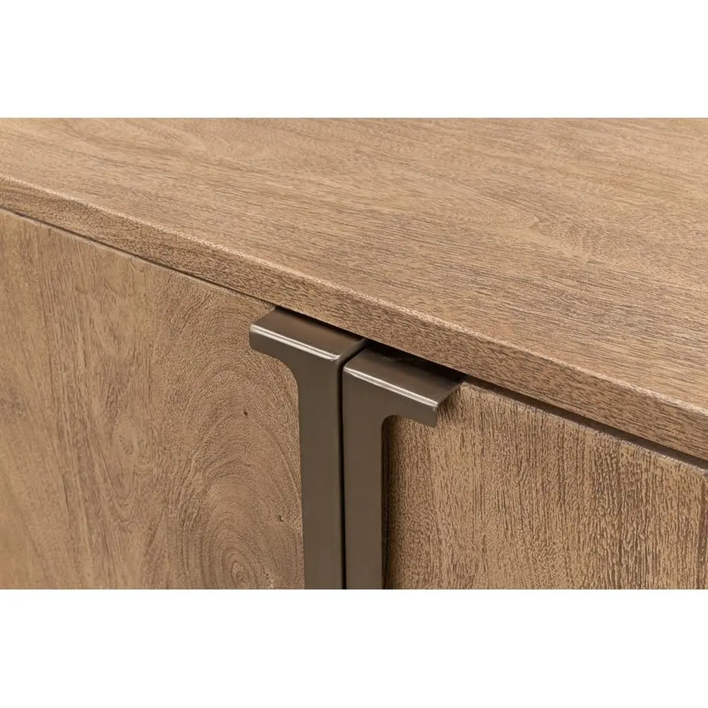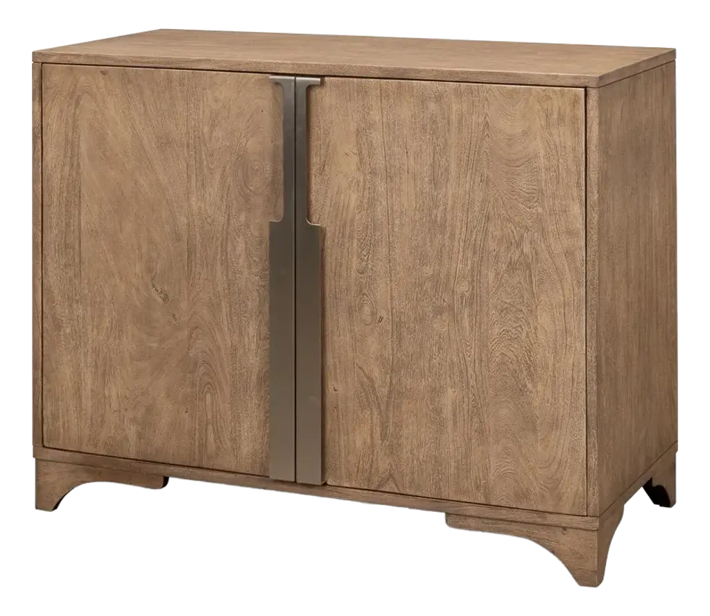 Crafted with a flaky pine finish that highlights the wood's natural beauty. Antique nickel-finished iron handles contrast elegantly, adding sophistication. Dual doors open to ample storage for effortless organization.Versatile and stylish, this cabinet complements contemporary, industrial, and transitional decor. Its subtly curved base softens the clean lines, making it a striking focal point in dining rooms, entryways, or living areas. A refined statement of craftsmanship and timeless appeal.Dimensions: 45" W x 21" D x 35" H