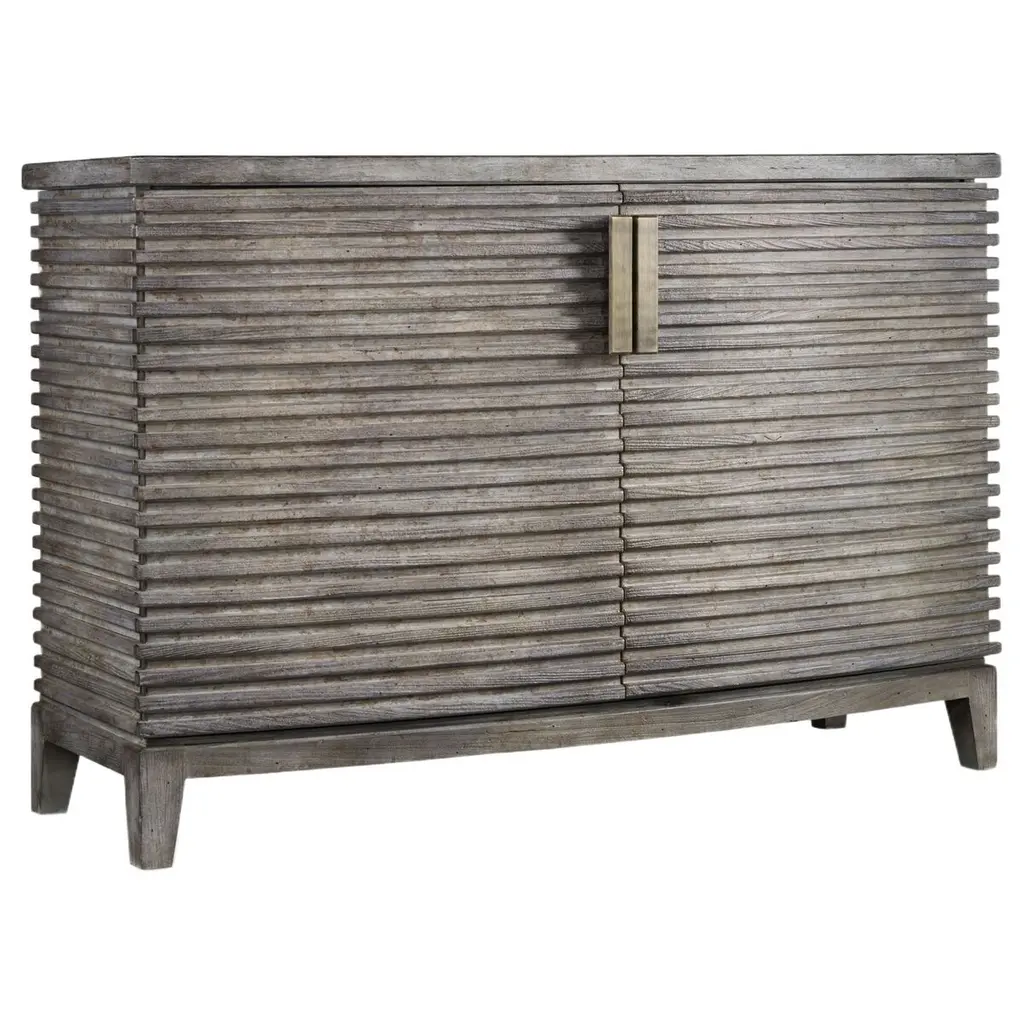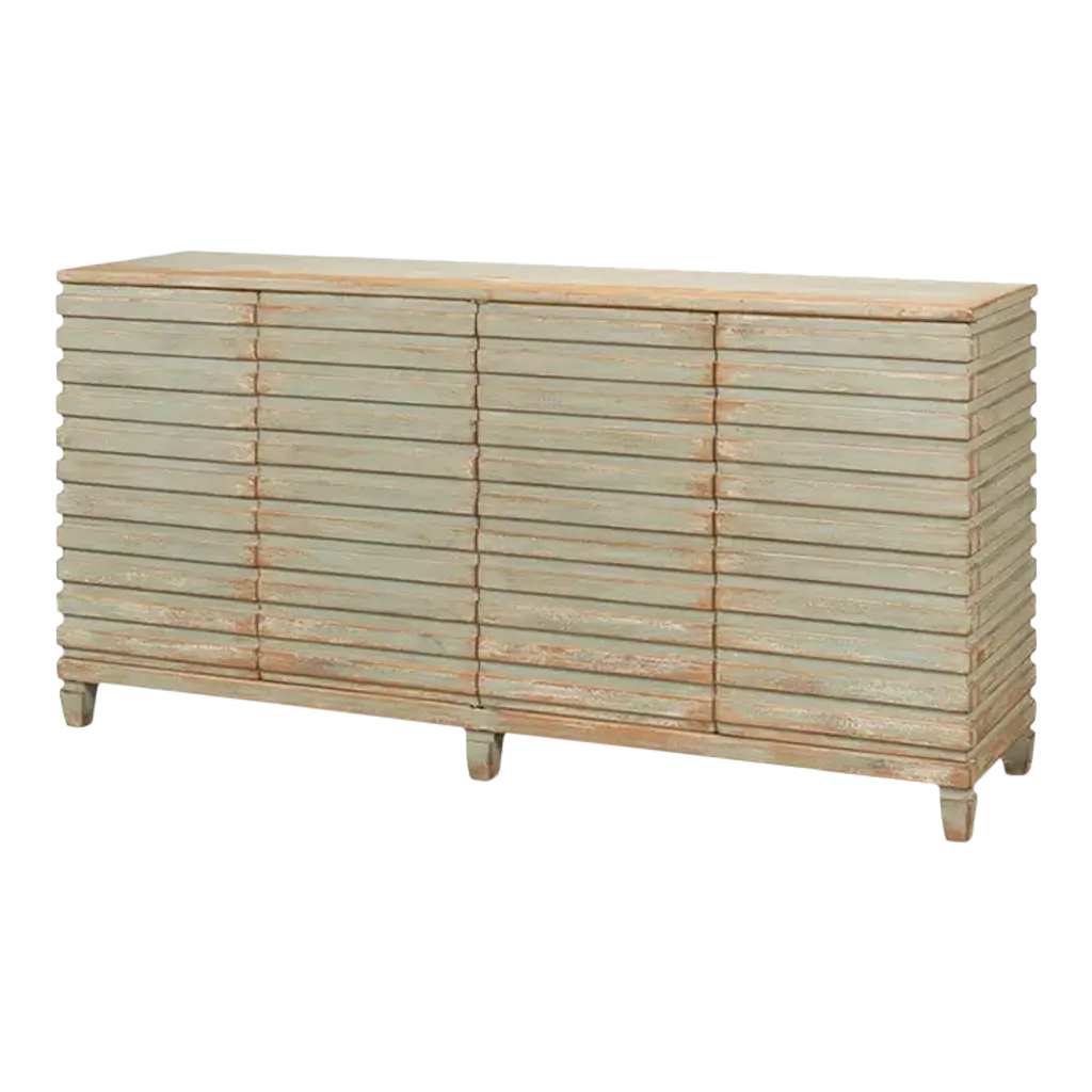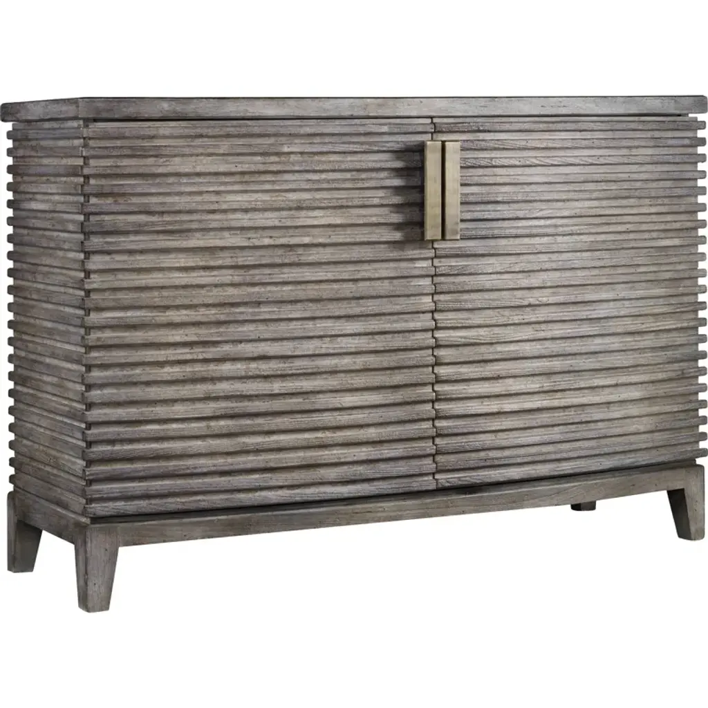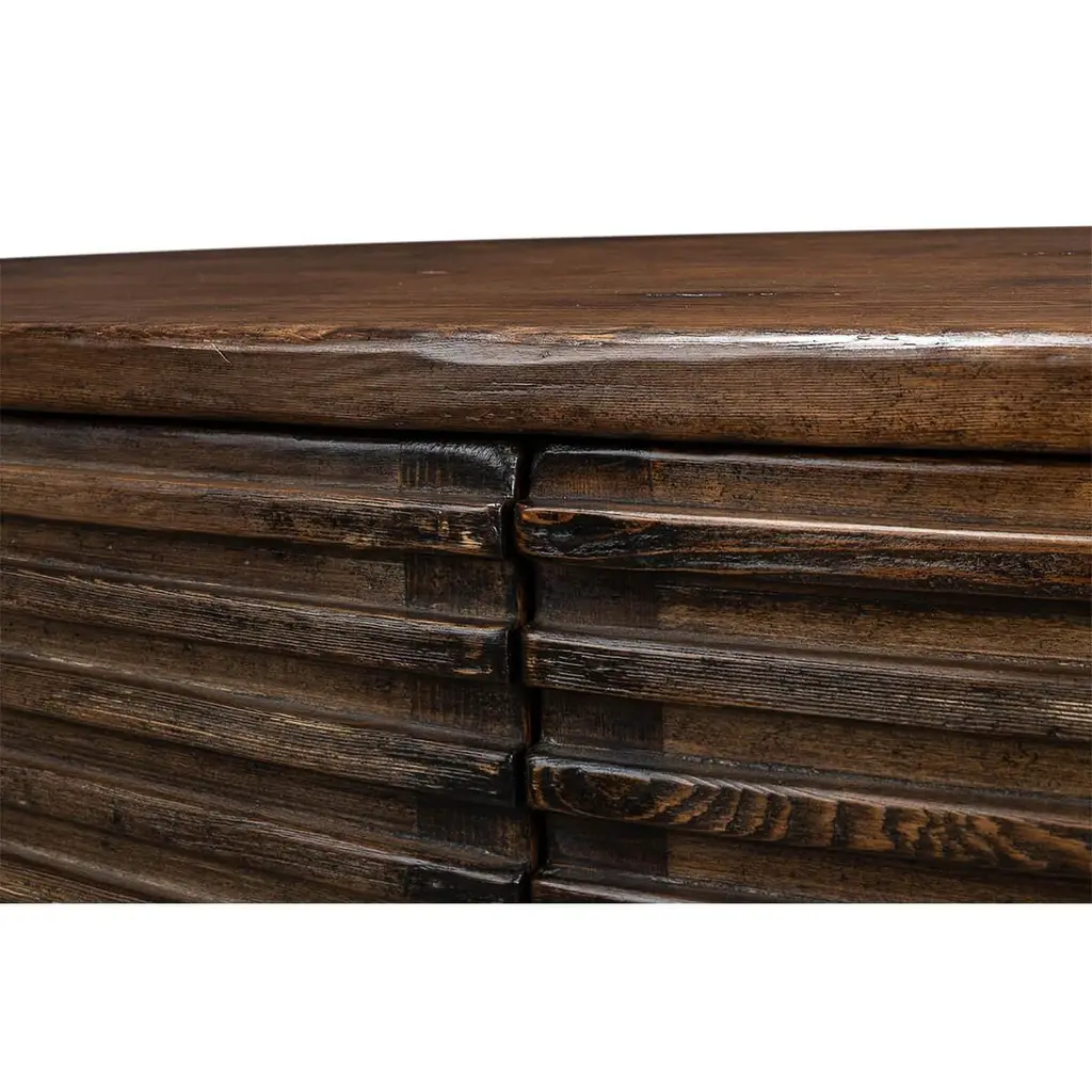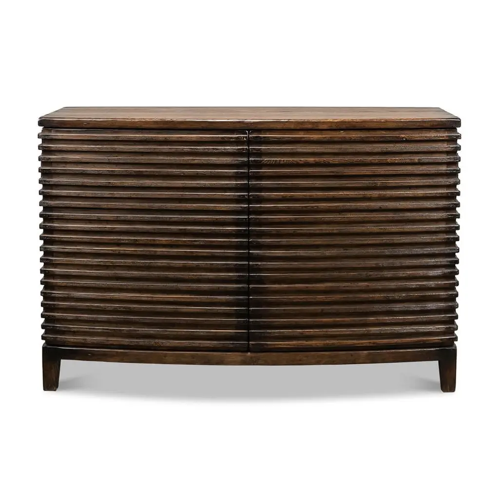 Modern ribbed bowfront cabinet credenza, with reclaimed pine, this curbed front door cabinet has a wonderful patina and antiqued finish and will fit well within any decor. With a removable interior shelf, and raised on tapered legs.Dimensions: 51" W x 19" D x 34" H.