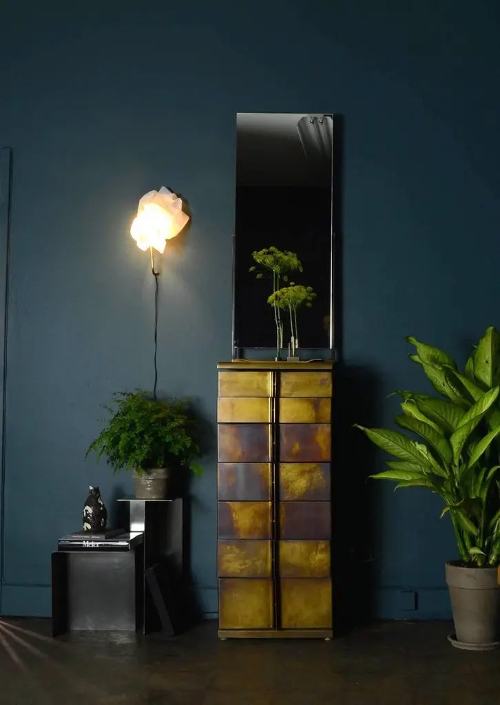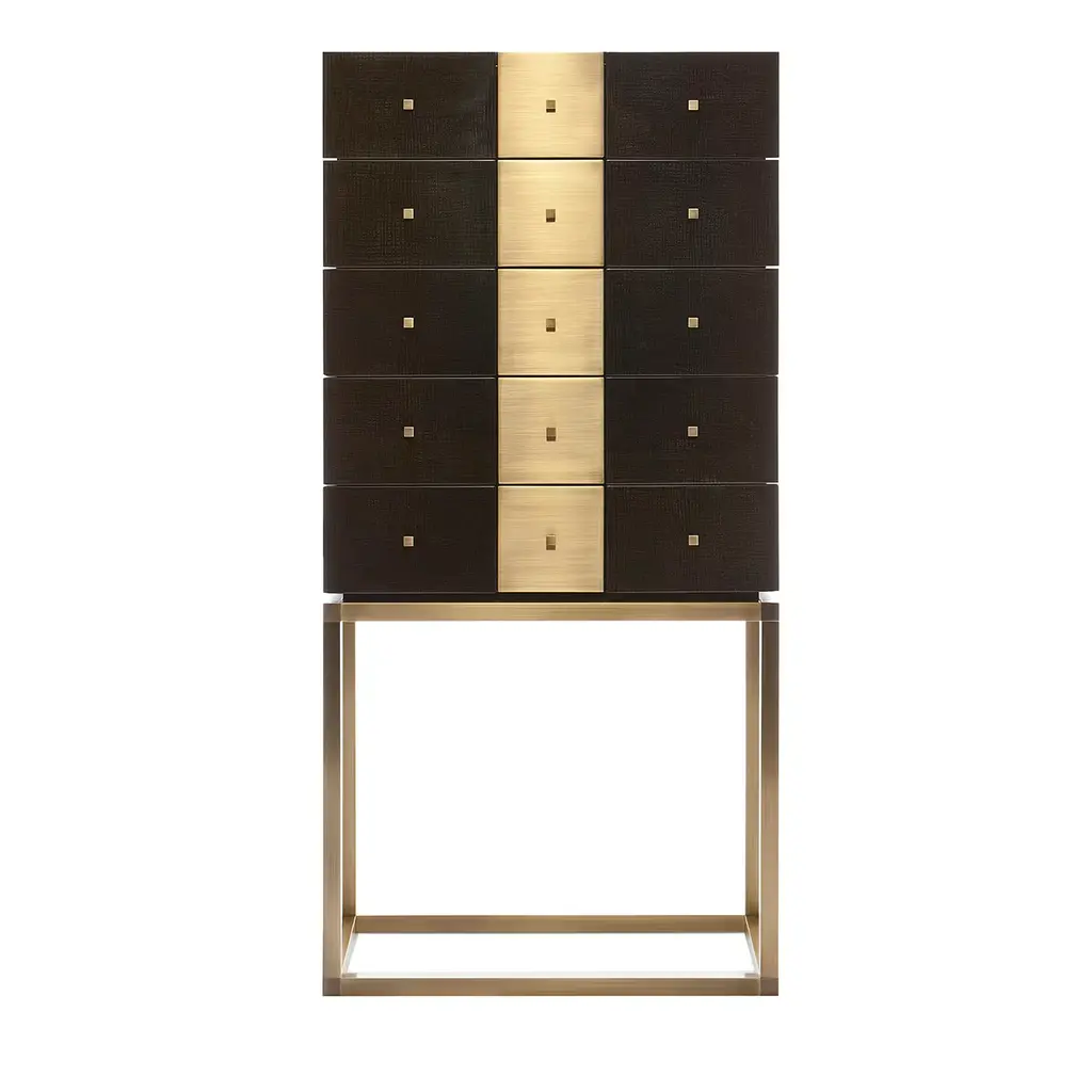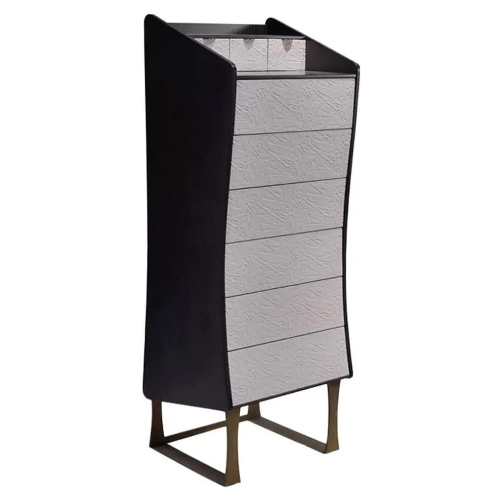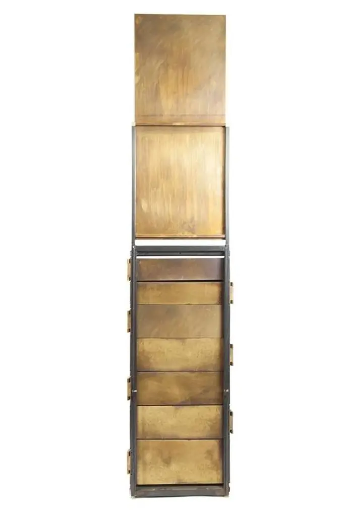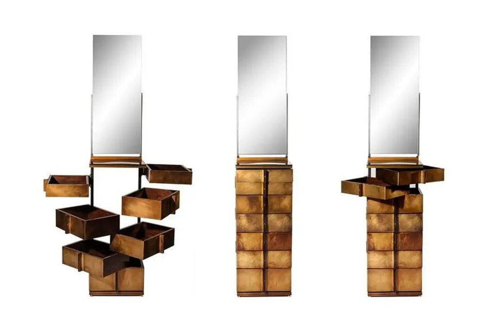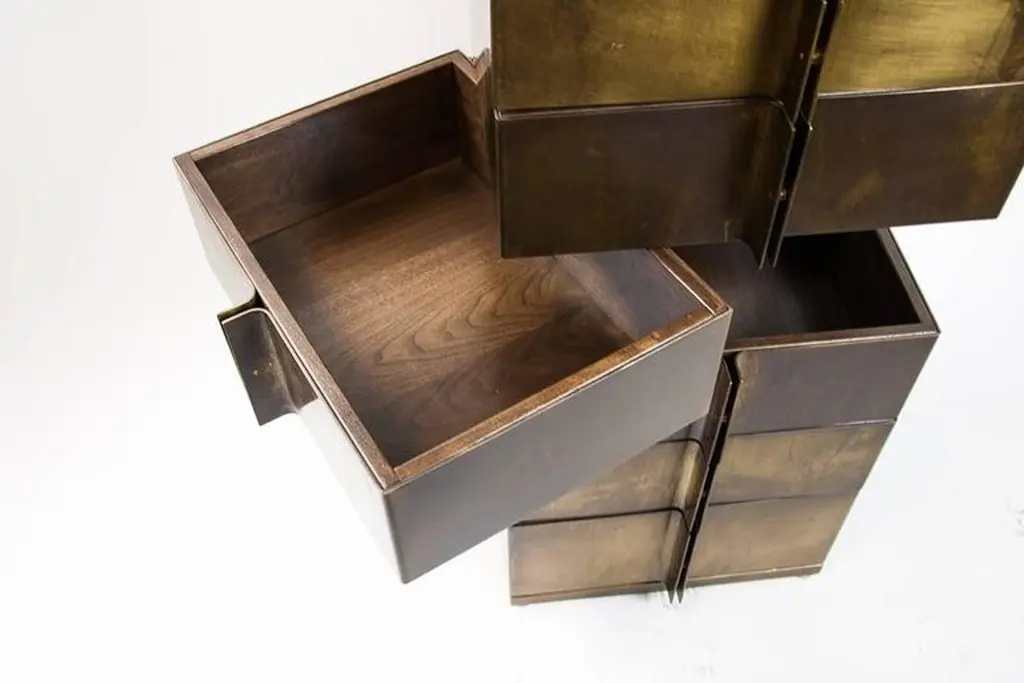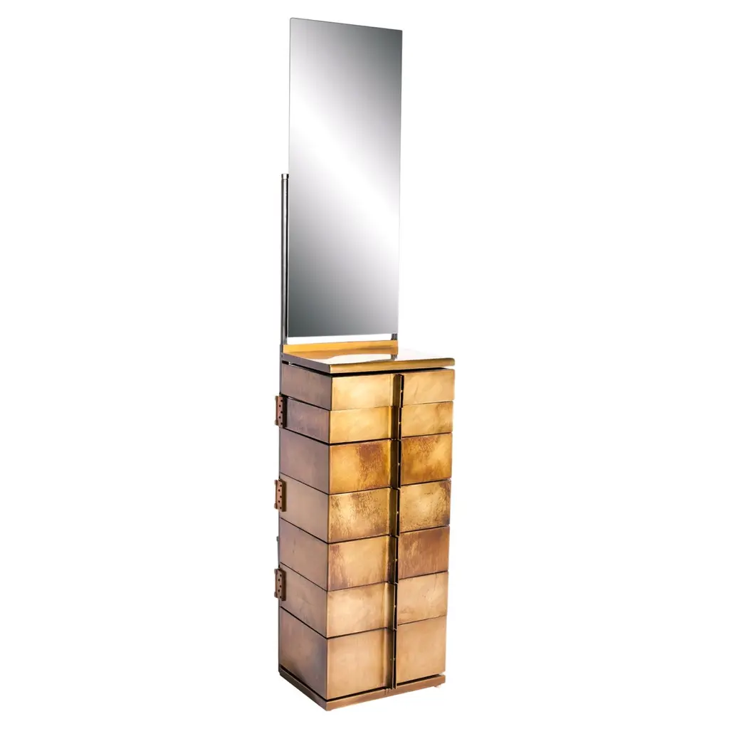 A modern take on a semainier, complete with vanity mirror and nine variable depth drawers, provides ample storage for all things. The top drawer, conveniently slim, is the ideal space for watches, ties or jewelry. Different from traditional cabinets and dressers, each individual brass wrapped wooden drawer rotates open on a single hinge. Through its materials and design, the Semainier transforms the classic french semainier into an innovative, practical, and stylishly modern necessity. Made of walnut and patinated brass, Gentner’s modern semainier is completely handcrafted in Chicago.One In-Stock