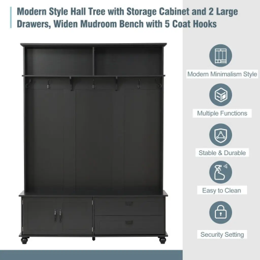 Modern Style Hall Tree With Storage Cabinet Drawers Open Storage Shelves Space Saving - Black