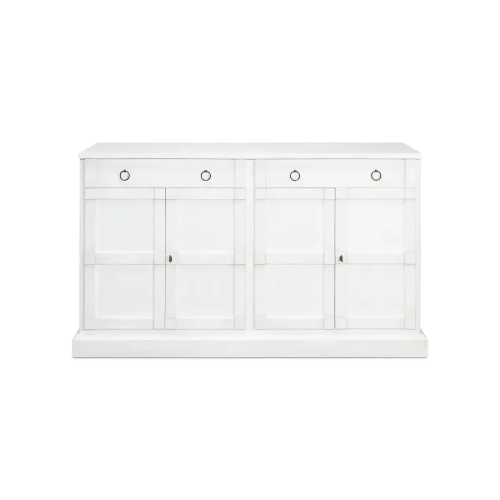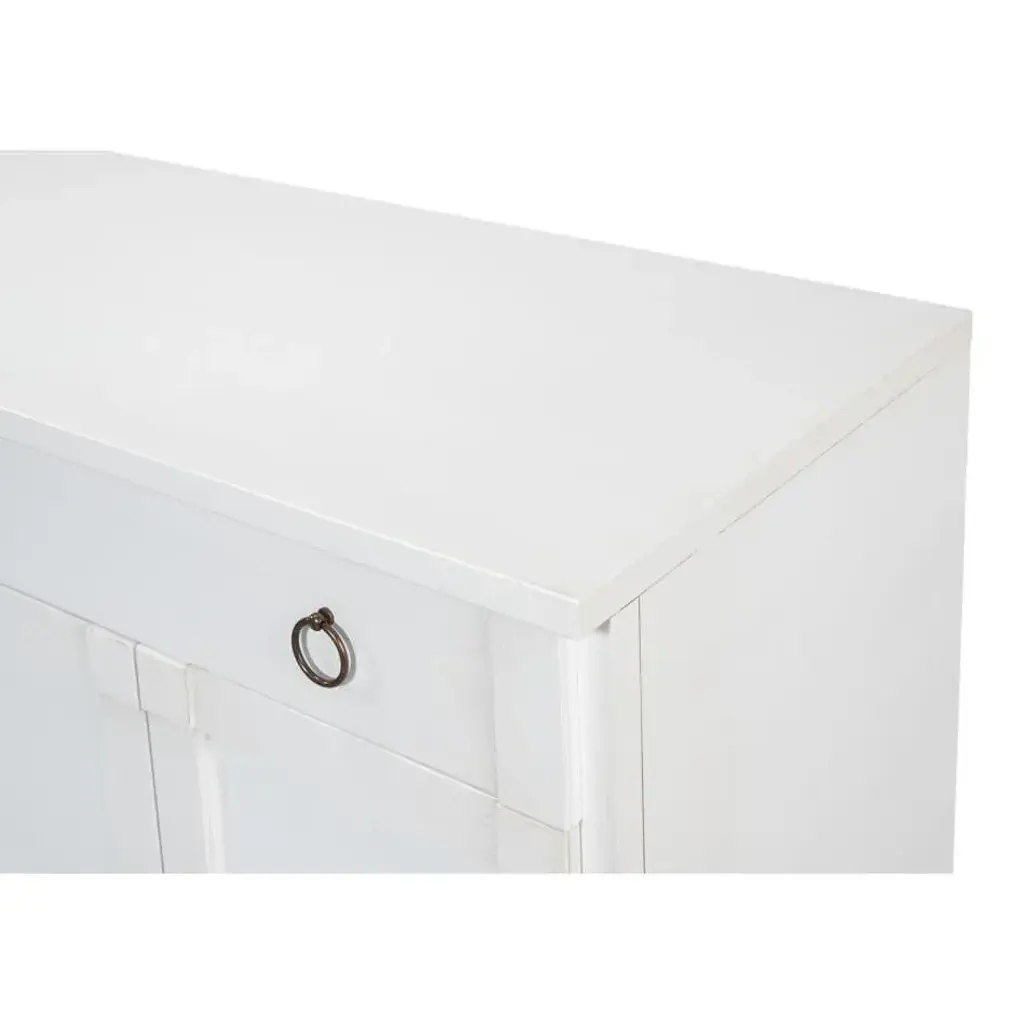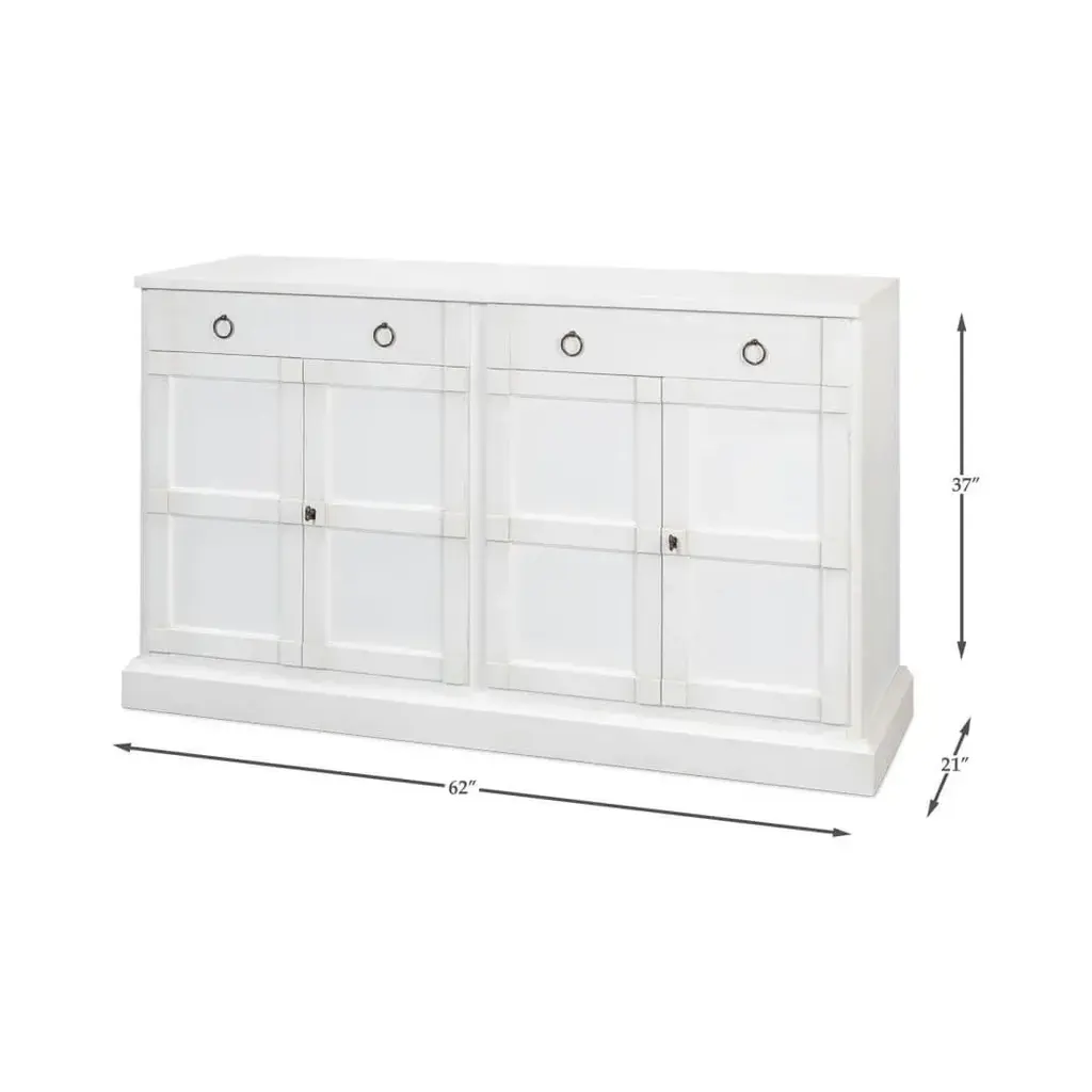 Dressed in Cortina white, it features a clean, linear silhouette that brings an airy spaciousness to any room. The paneled doors are framed by subtle accents. With two frieze drawers and two cupboard doors that open to interior shelves, the credenza offers ample storage, perfect for linens, cutlery, or other essentials. This cabinet is a beacon of elegant simplicity, designed to brighten your dining space or living area with its charm and understated grace. Dimensions: 62" W x 21" D x 37" H