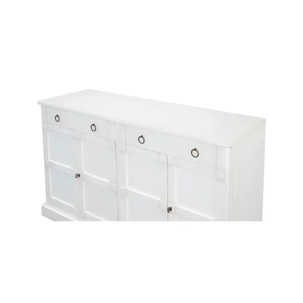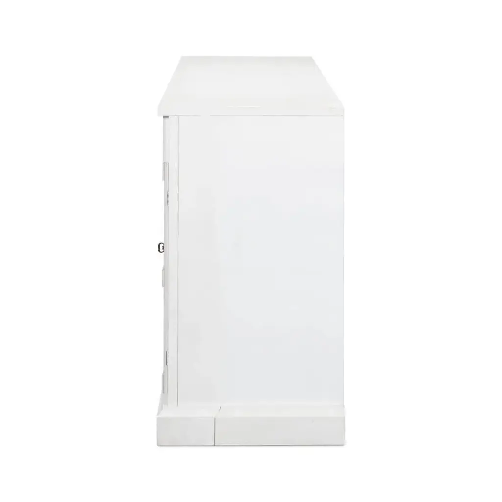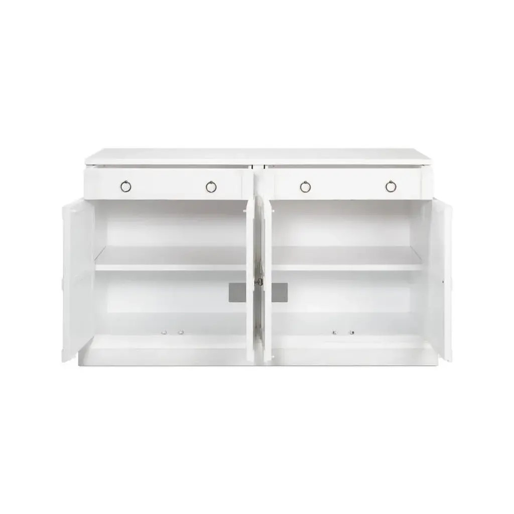Dressed in Cortina white, it features a clean, linear silhouette that brings an airy spaciousness to any room. The paneled doors are framed by subtle accents. With two frieze drawers and two cupboard doors that open to interior shelves, the credenza offers ample storage, perfect for linens, cutlery, or other essentials. This cabinet is a beacon of elegant simplicity, designed to brighten your dining space or living area with its charm and understated grace. Dimensions: 62" W x 21" D x 37" H
